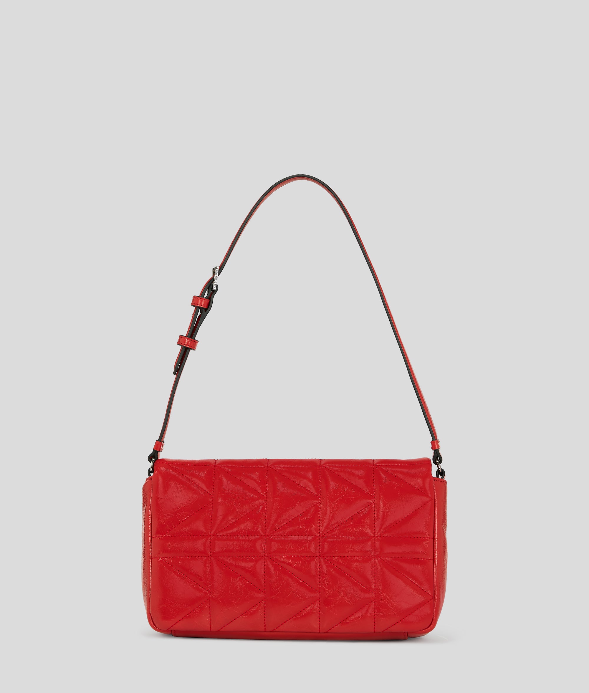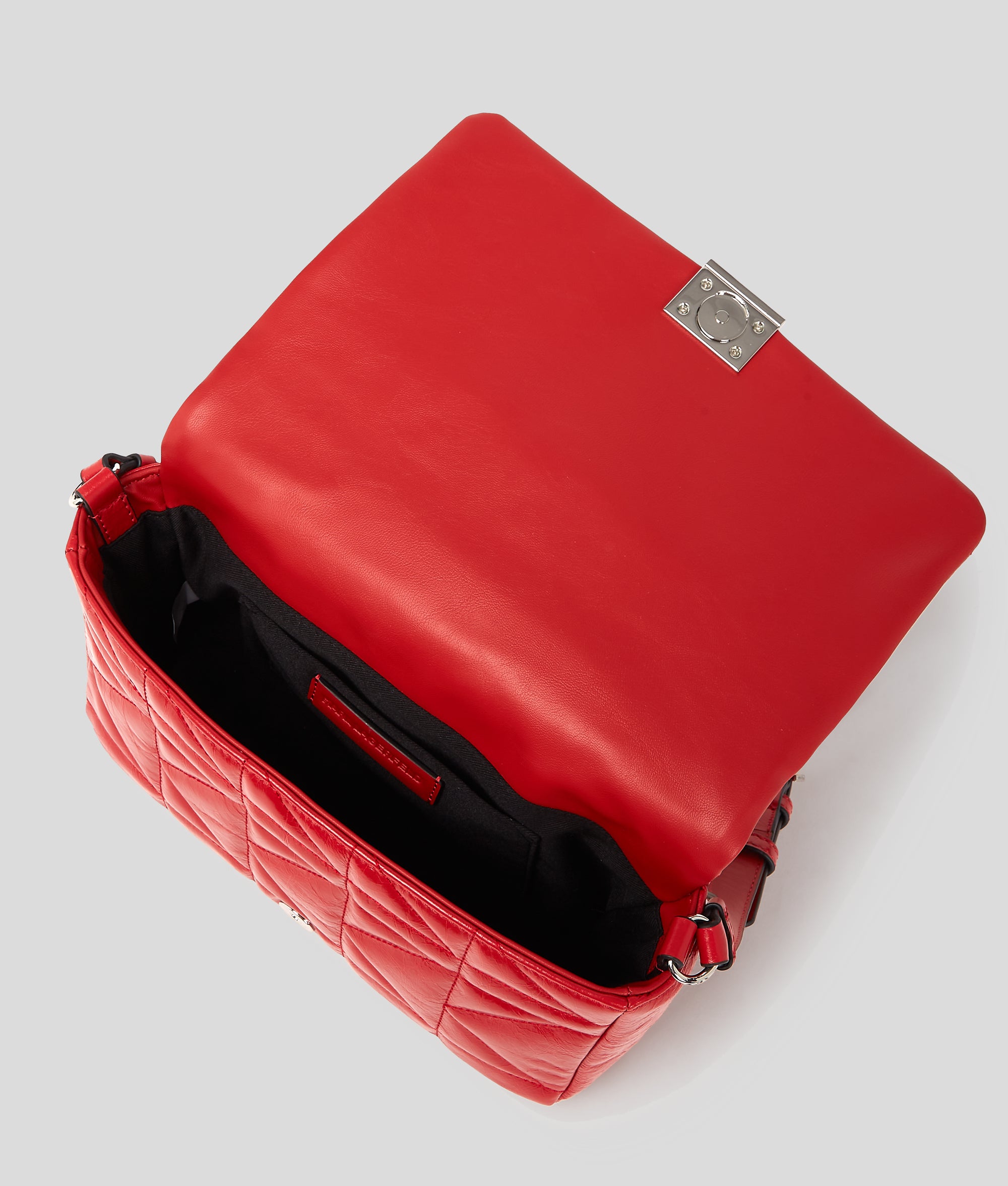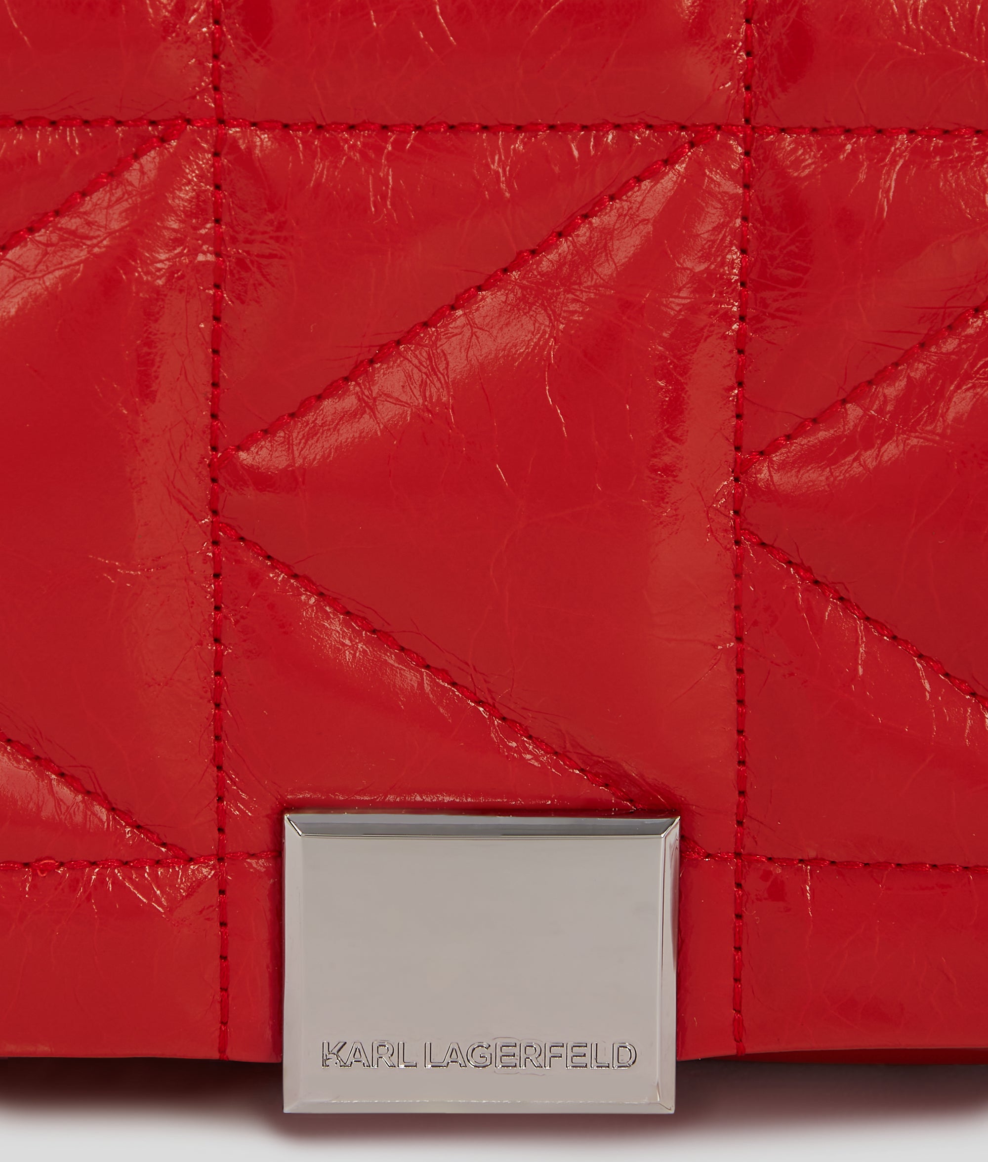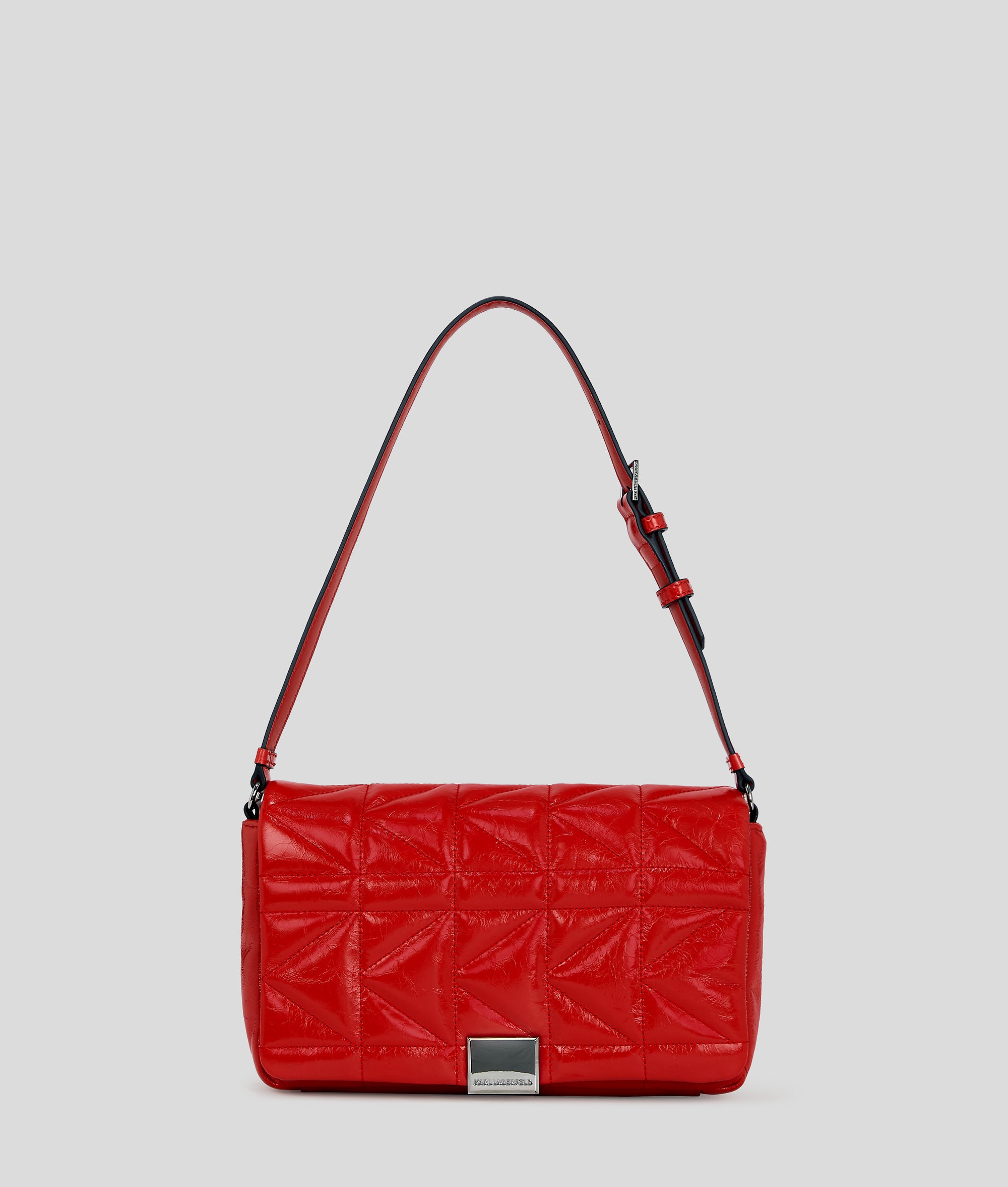 Discover a high-shine quilted shoulder bag that effortlessly combines style and functionality. The secure push-lock closure keeps essentials safe, while the adjustable strap provides carrying ease. A chic metal plaque adds a touch of luxury to this statement piece. Embellished with quilted details and plush texture, the trademark 'K' stitching adds a unique dimension to this modern classic