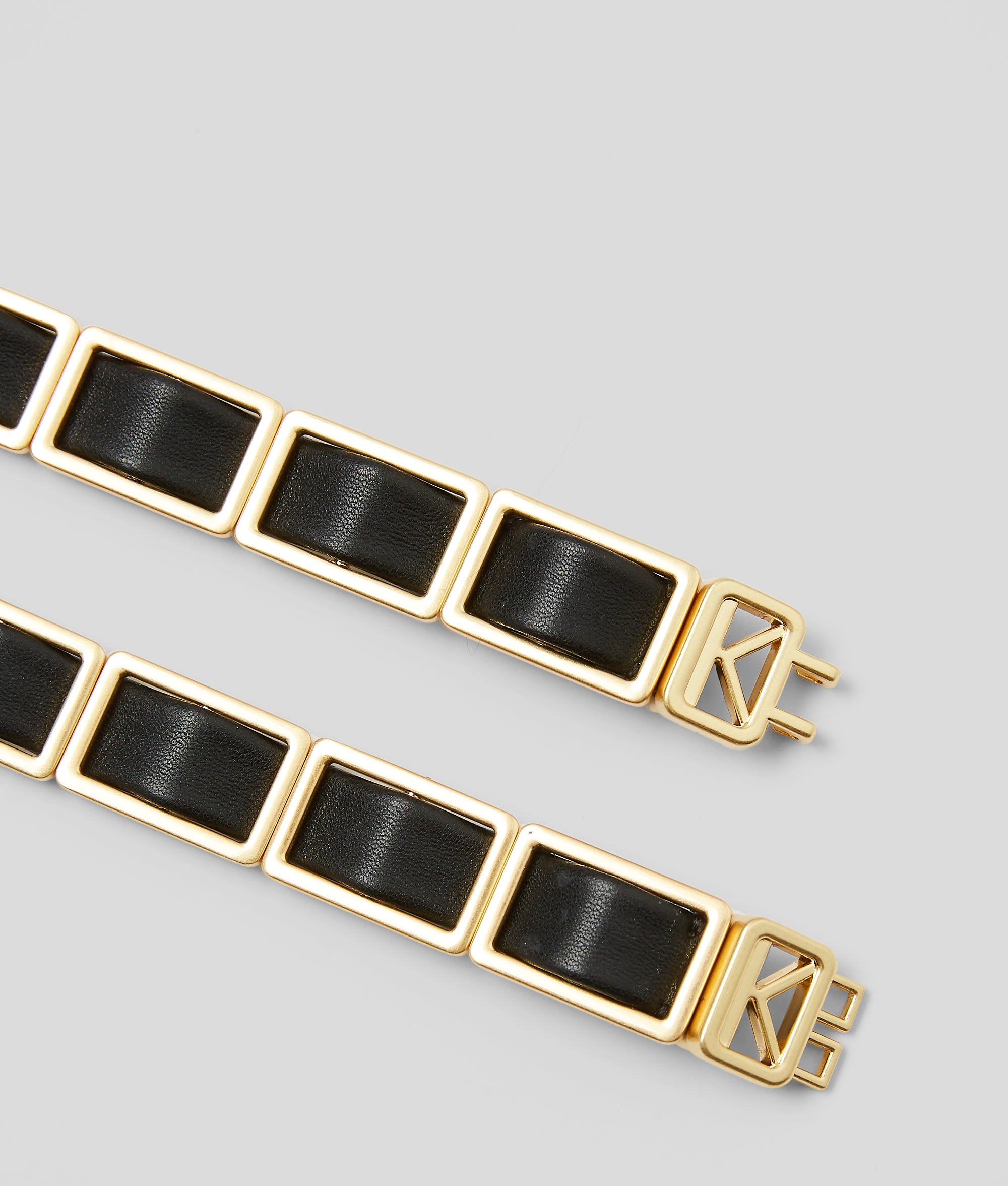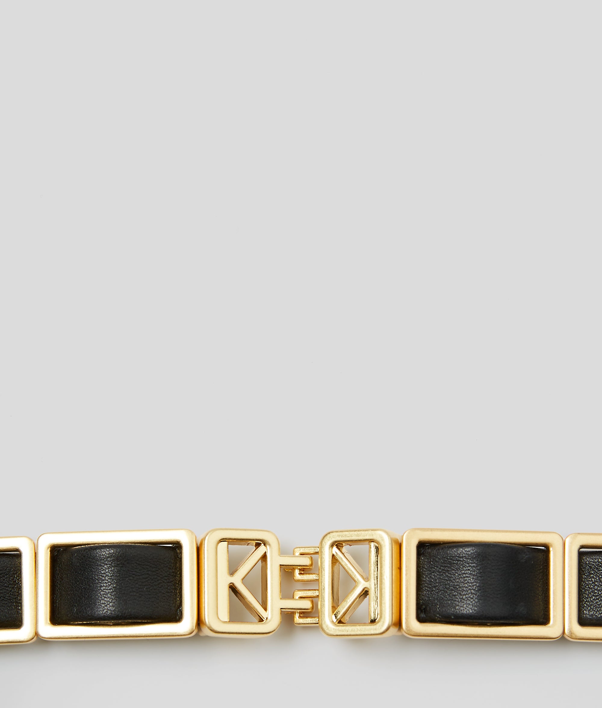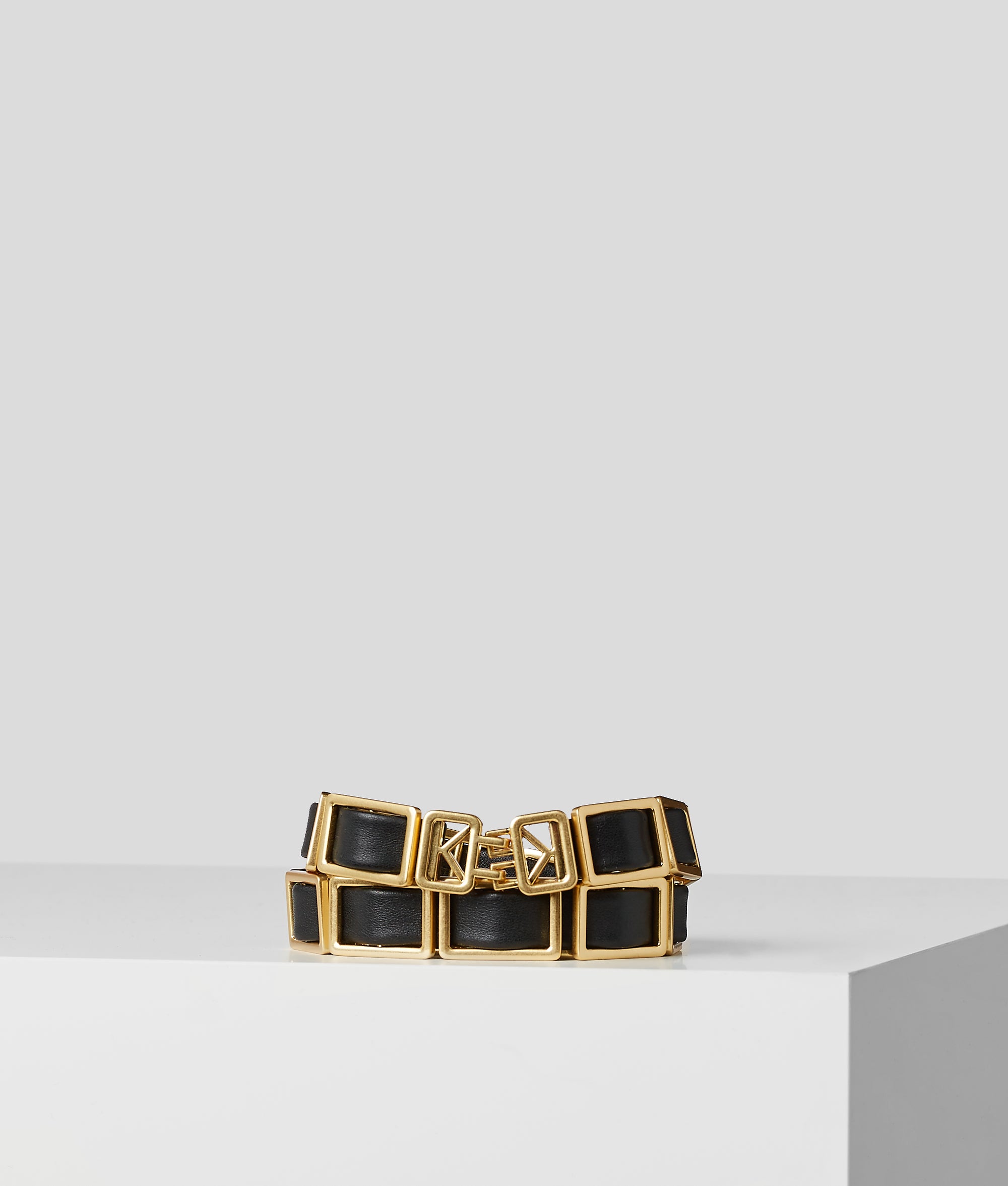 This chain-link leather belt, adorned with an emblematic KL buckle, is a statement addition to evening looks. From the little black dress to a chic jumpsuit or a colour-pop power suit, this black and gold belt is a lustrous finishing touch go-to.