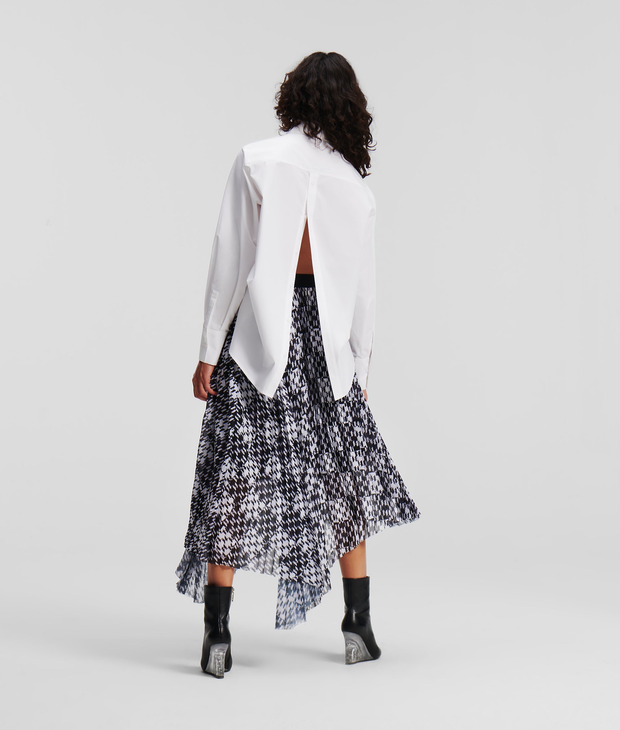 A modern take on a timeless classic. This pleated midi skirt features an exclusive KARL Monogram checked design and an asymmetrical hemline. A branded elastic tape waistband enhances the shaping and bold design of this KARL favorite.