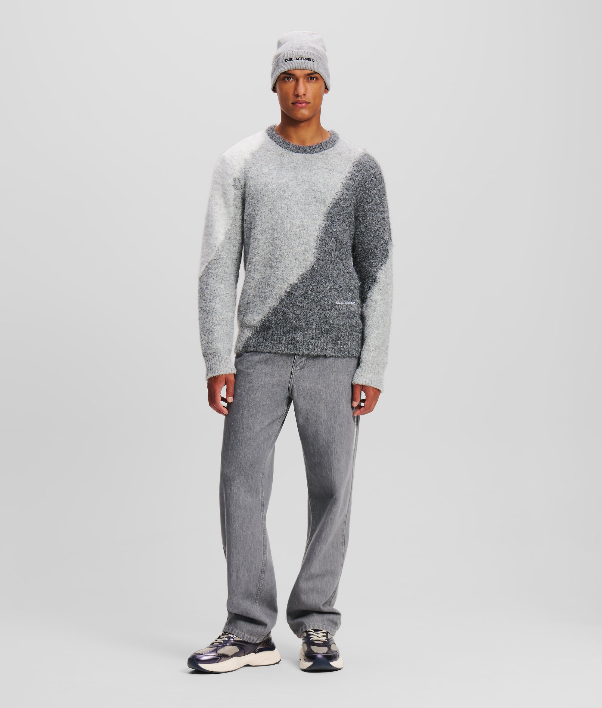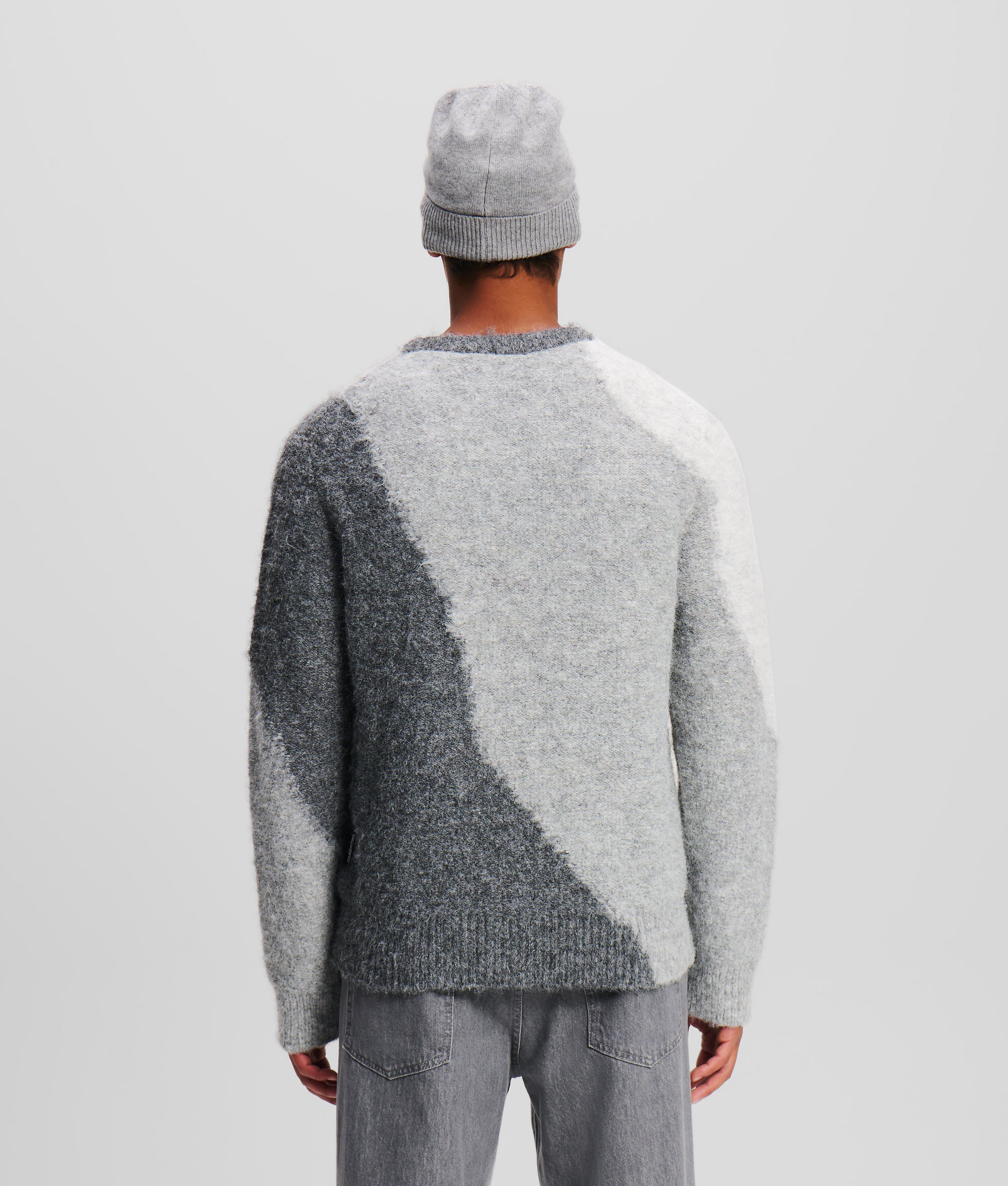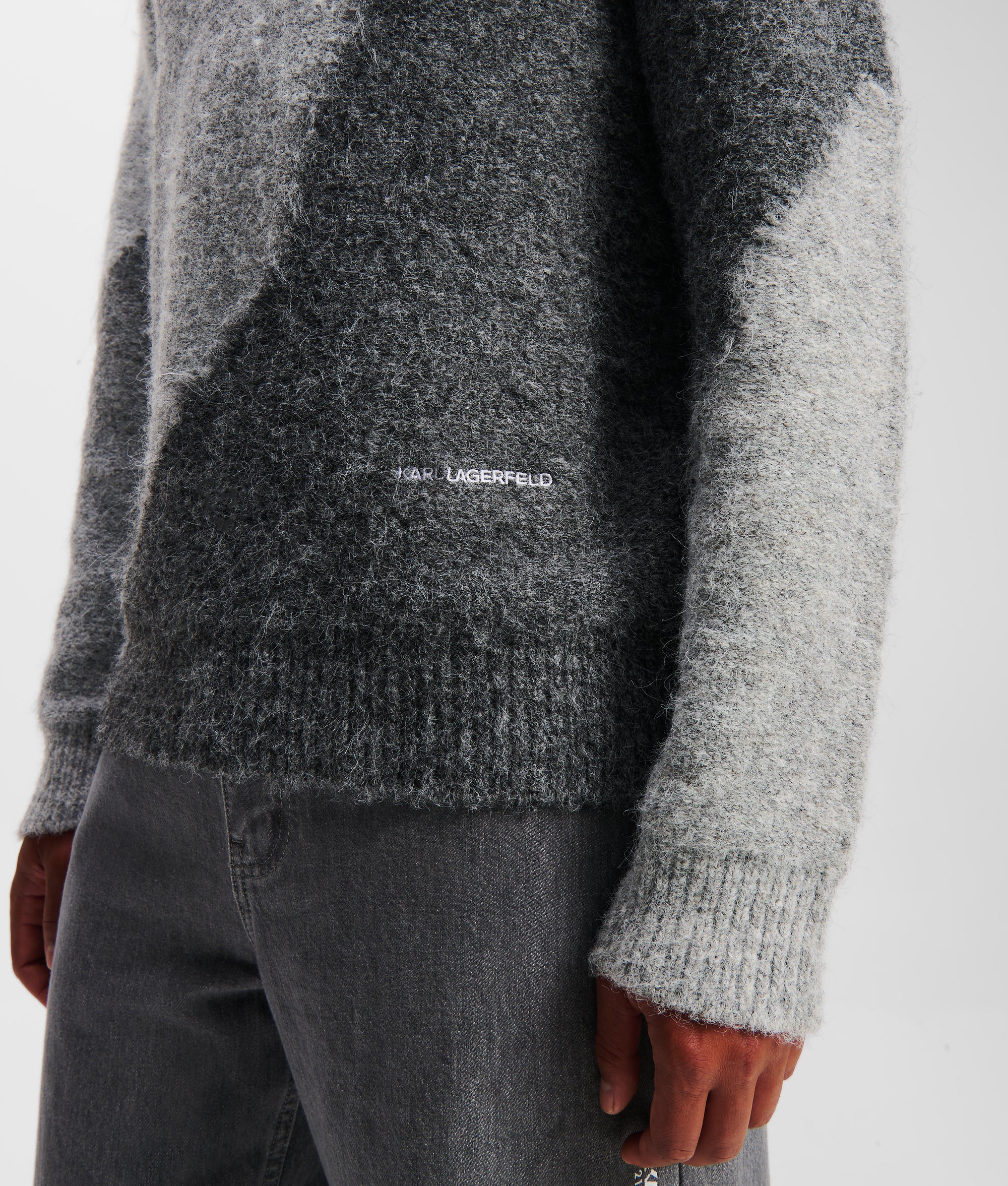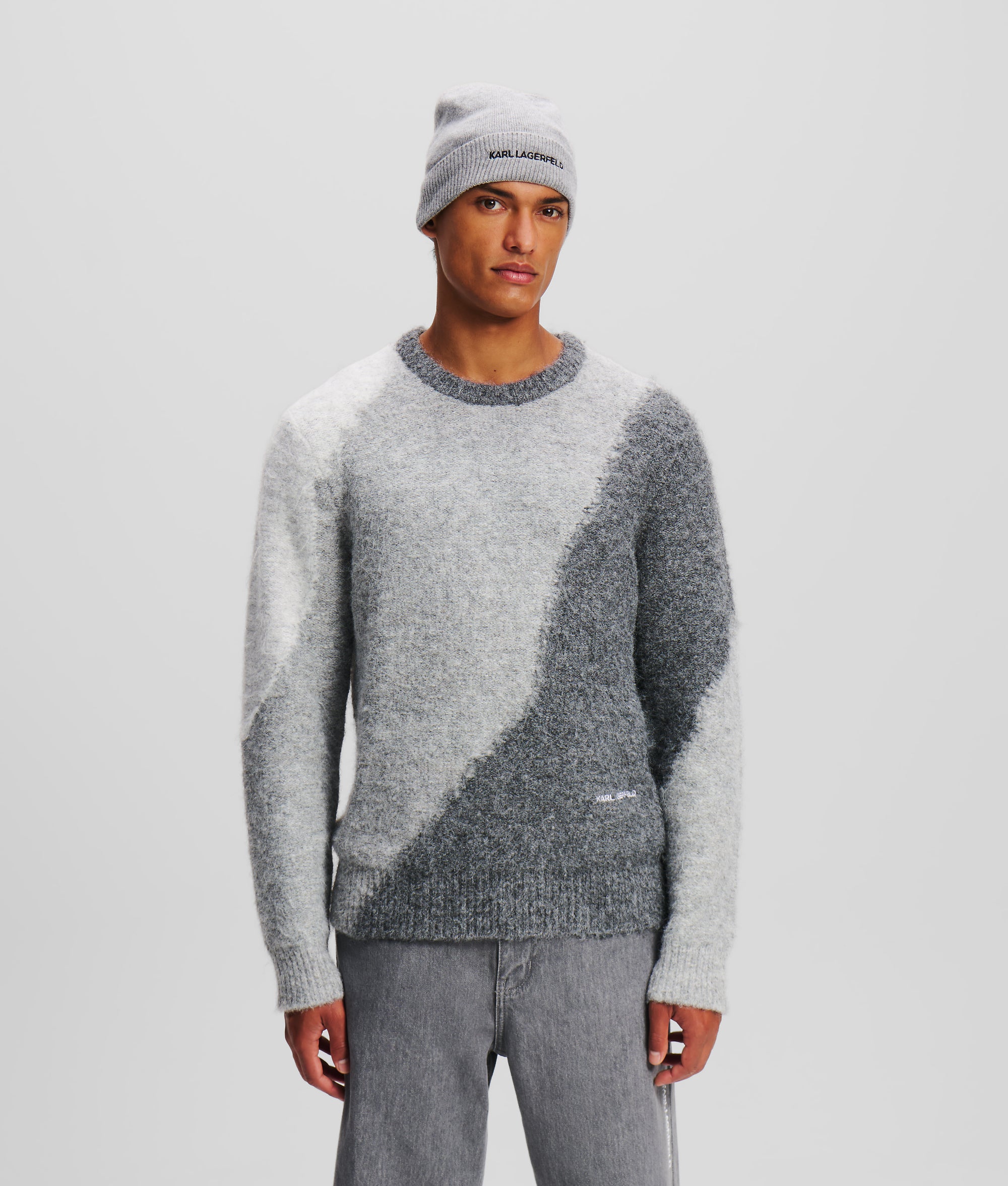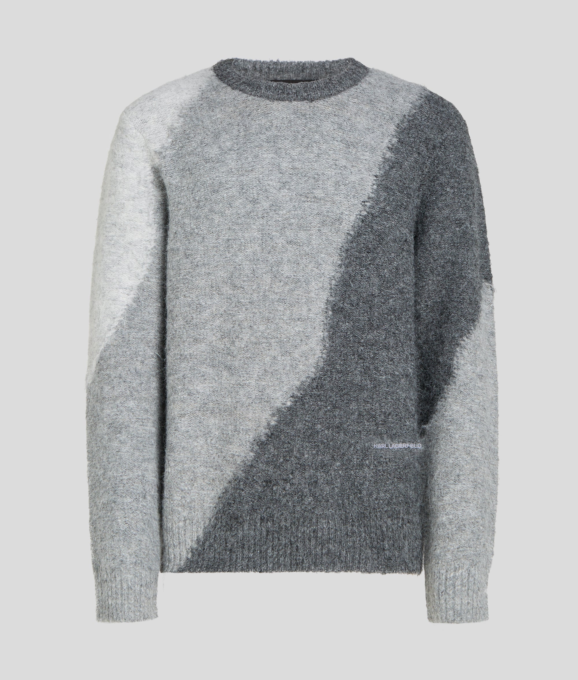 This classic crew neck sweater features a striking abstract design in varying gray tones and a contrasting satin embroidered KARL LAGERFELD logo at the chest for a signature finish.