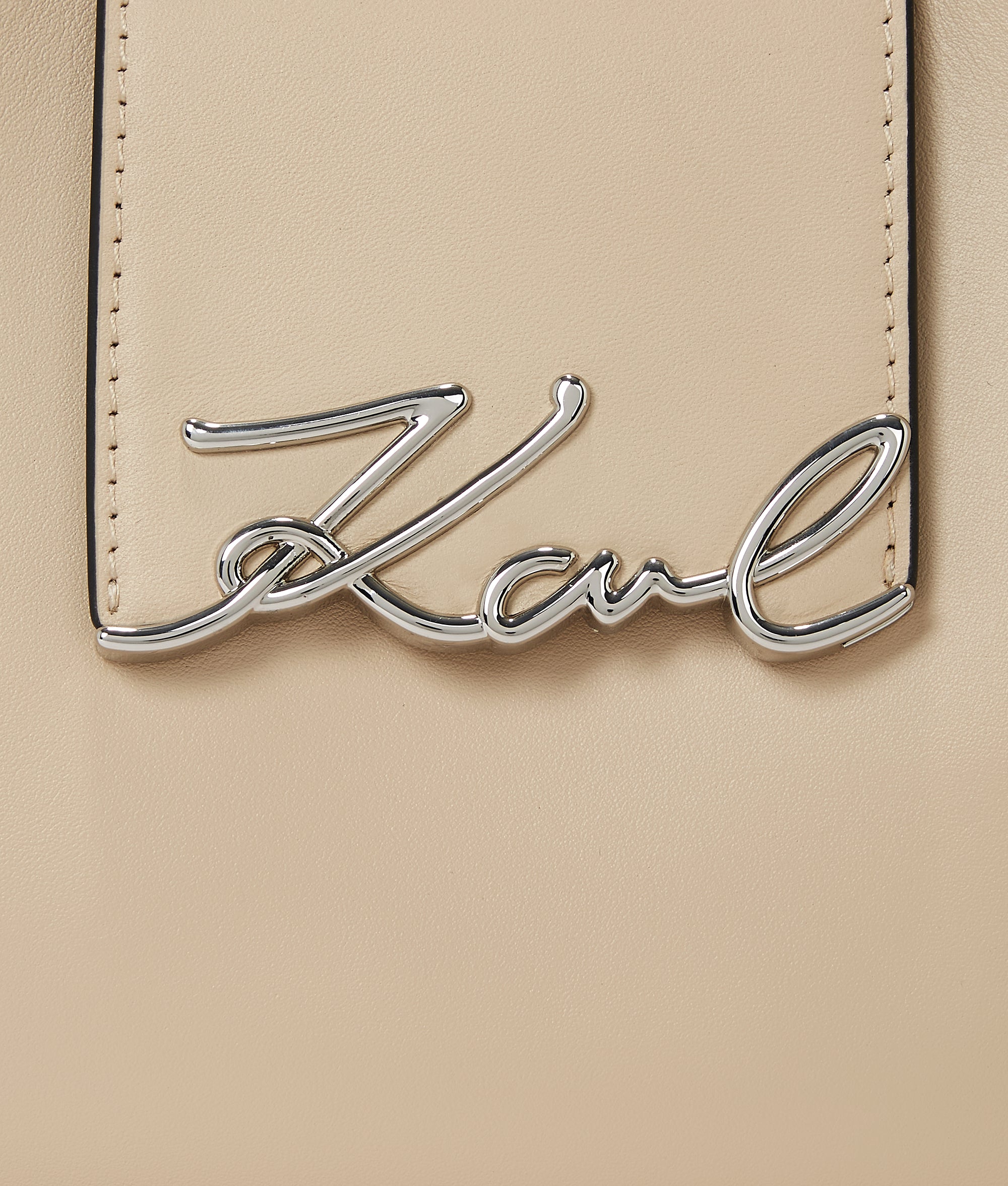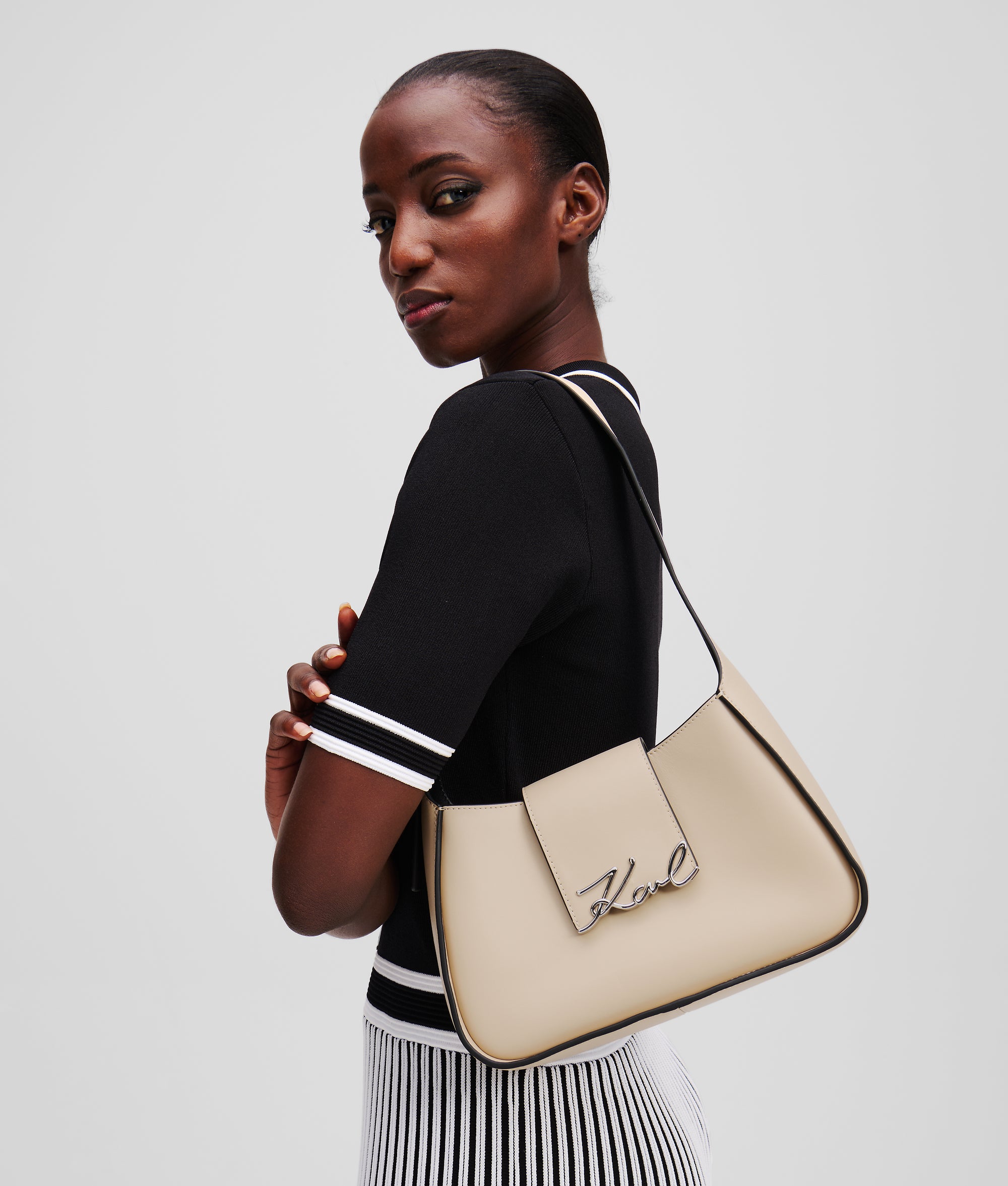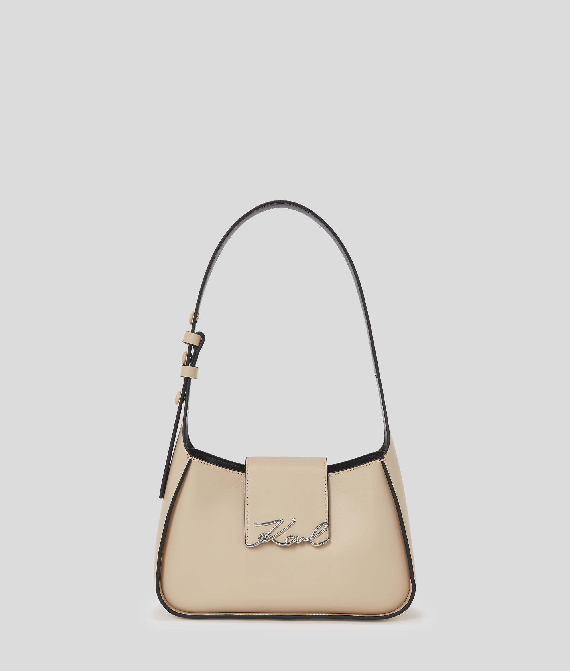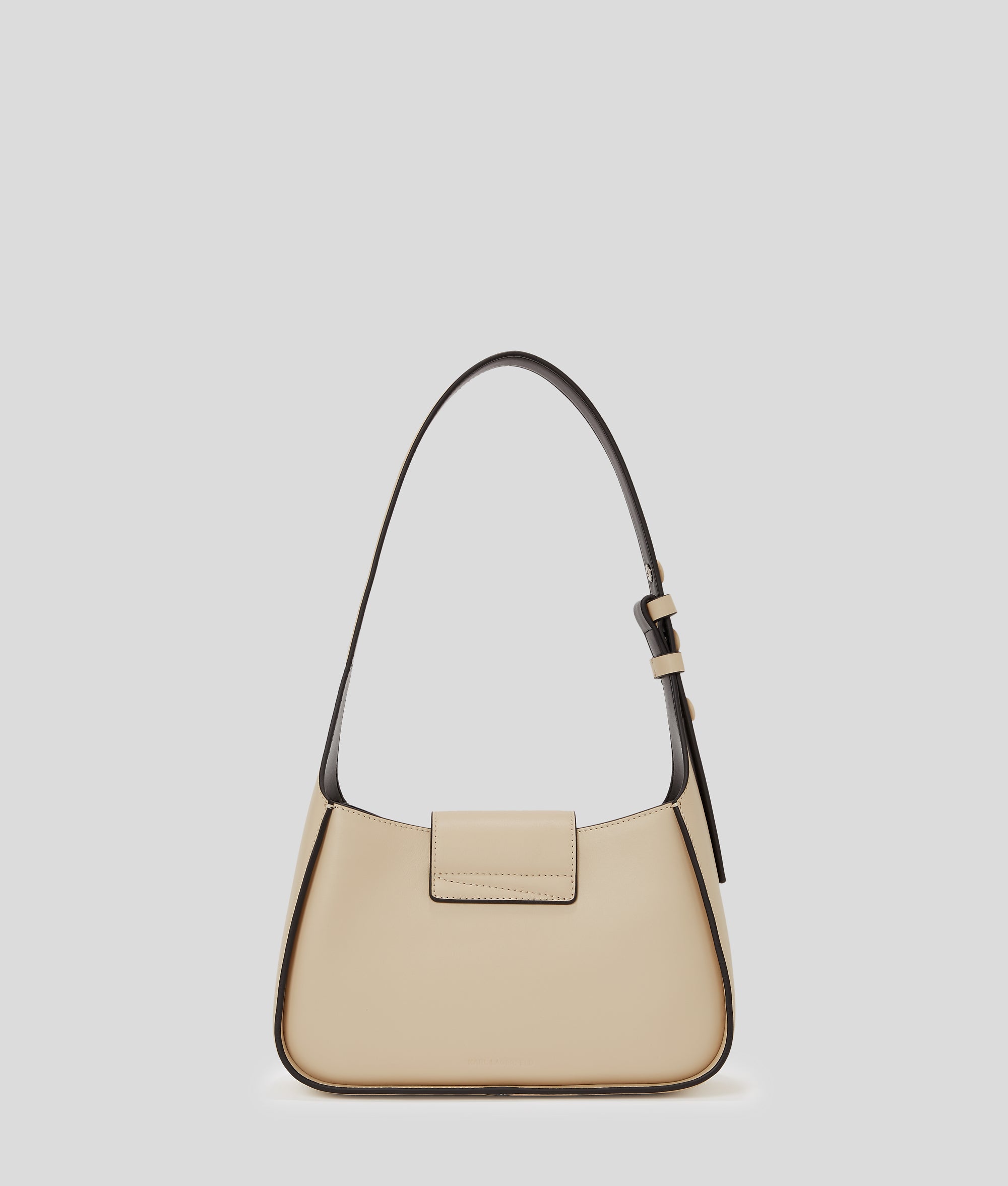 This shoulder bag showcases a petite-yet-practical silhouette, featuring a flap top closure and an adjustable strap for versatile styling. Delicate KARL signature hardware adds a touch of refinement.