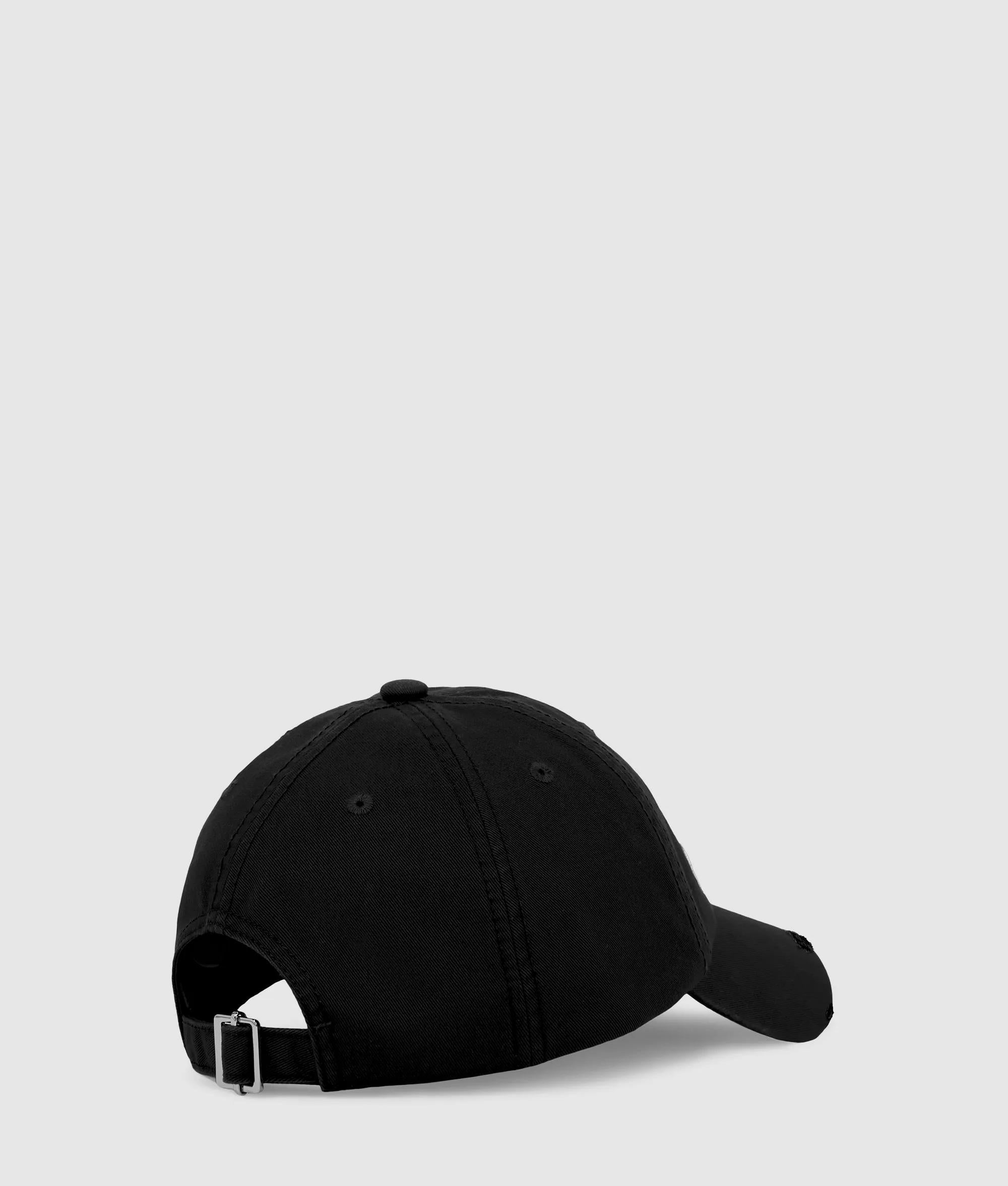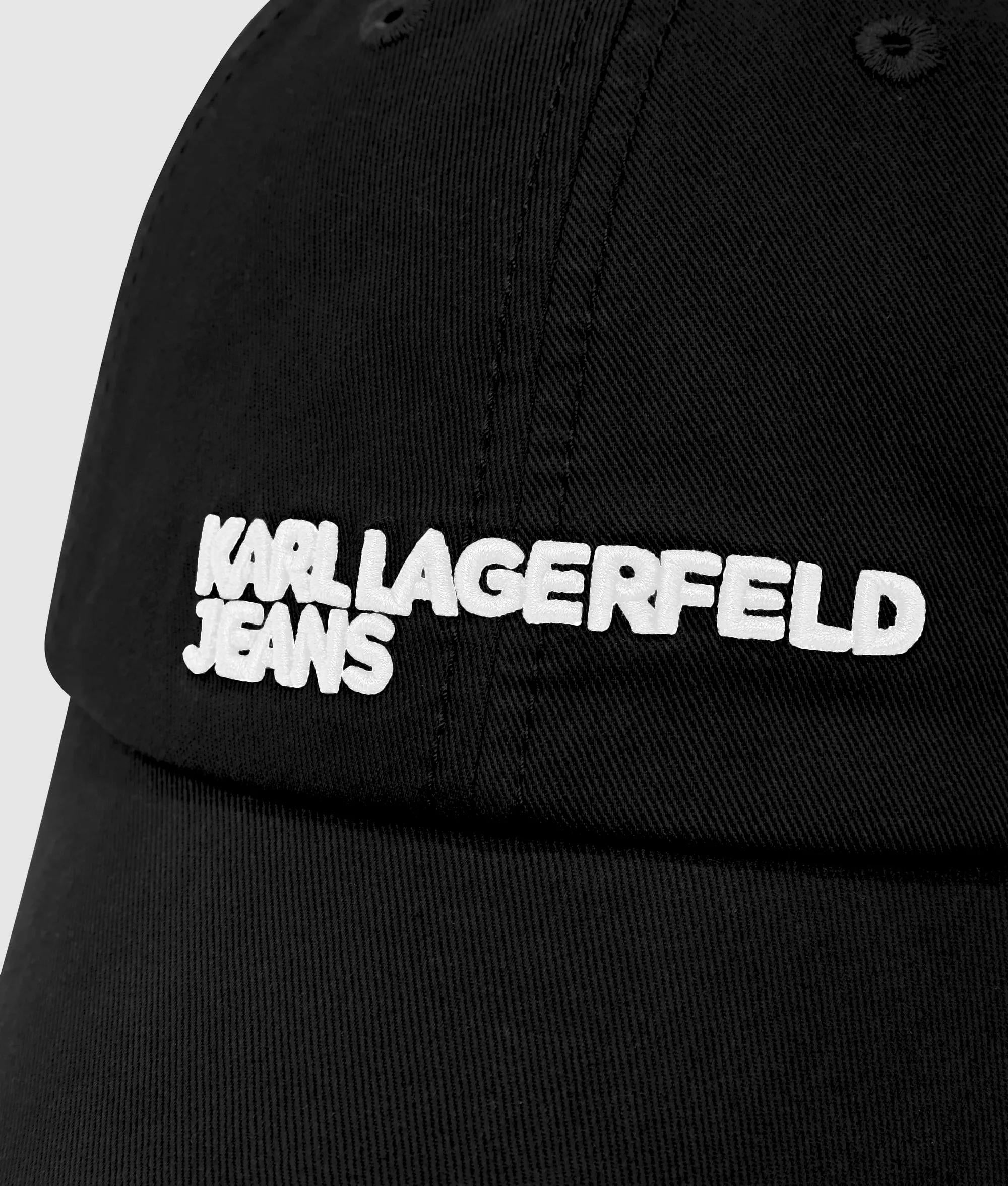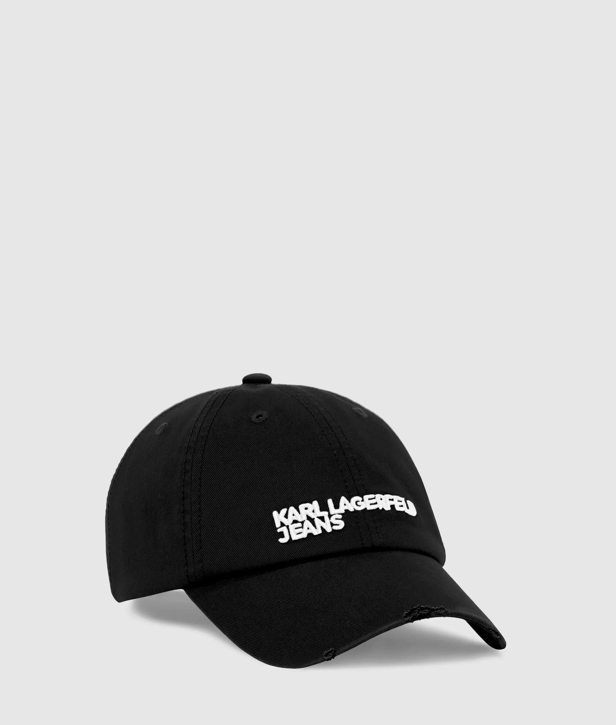 A curved-peak cap crafted in classic six-panel cotton, featuring bold KARL LAGERFELD JEANS embroidery and an adjustable strap for a tailored fit.