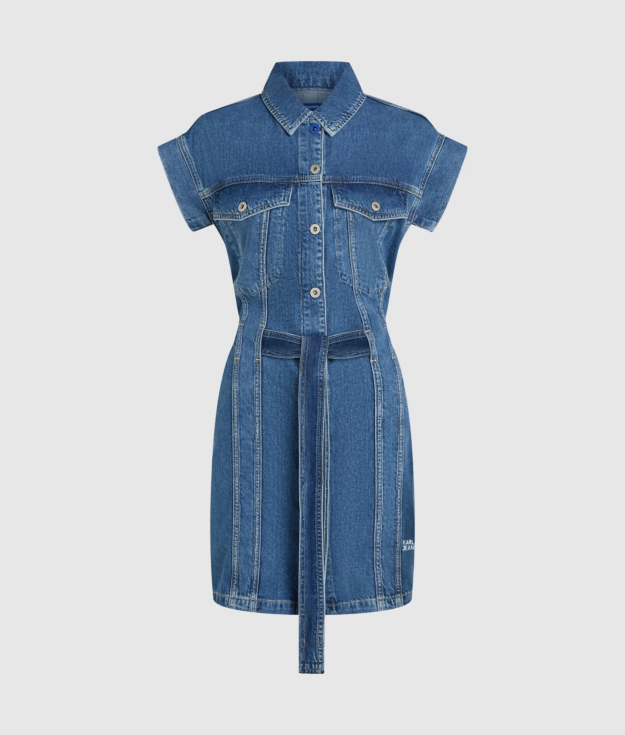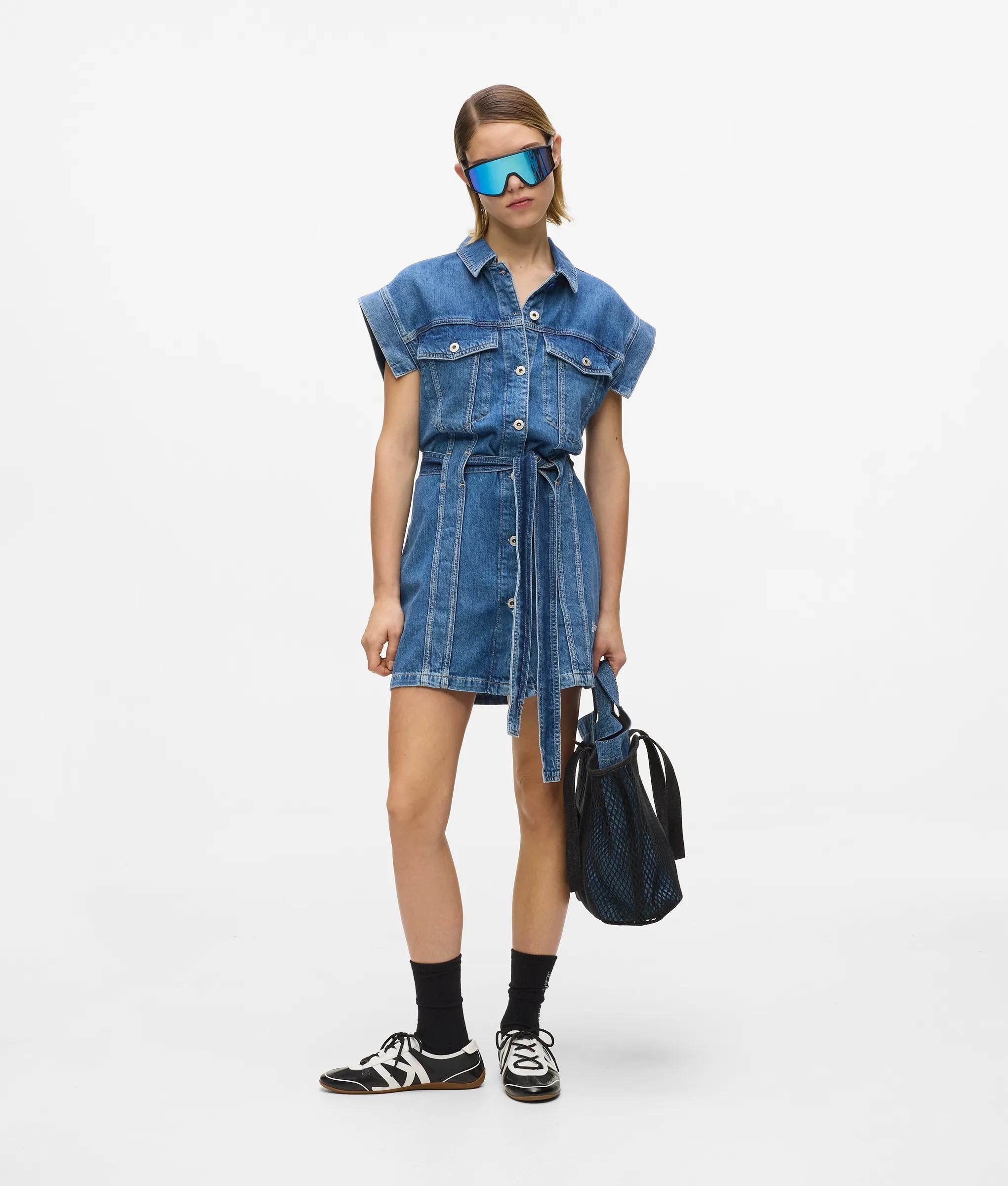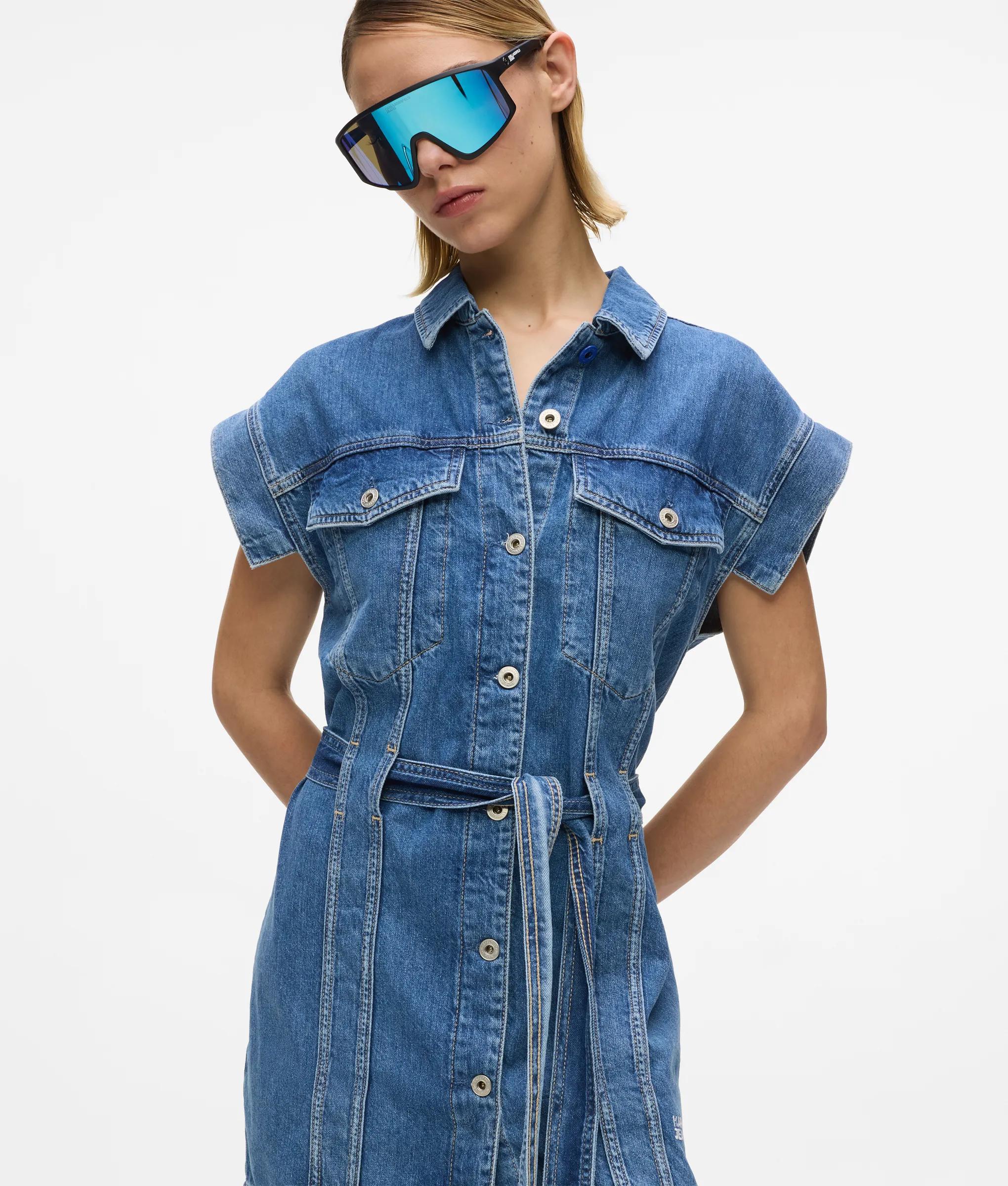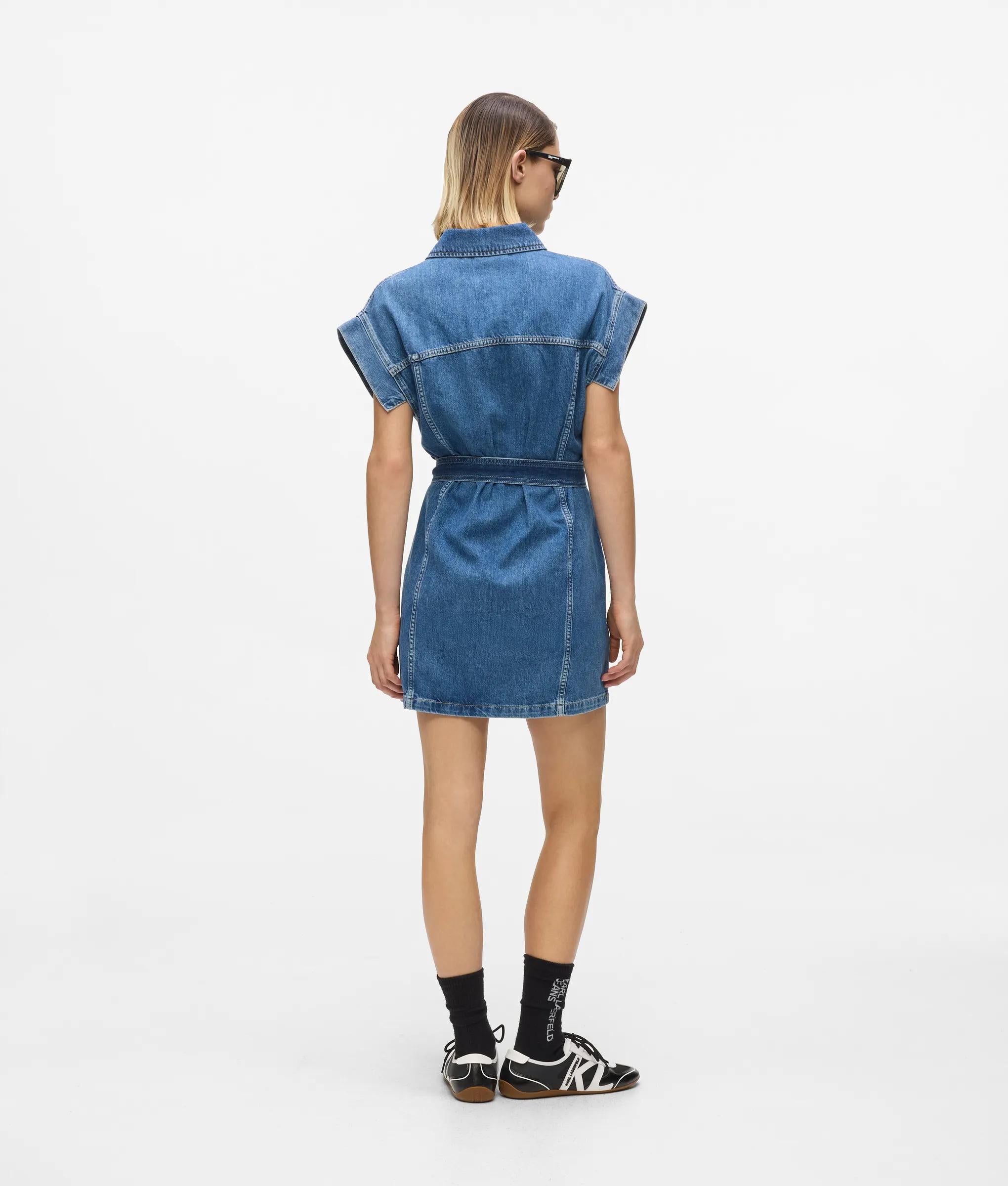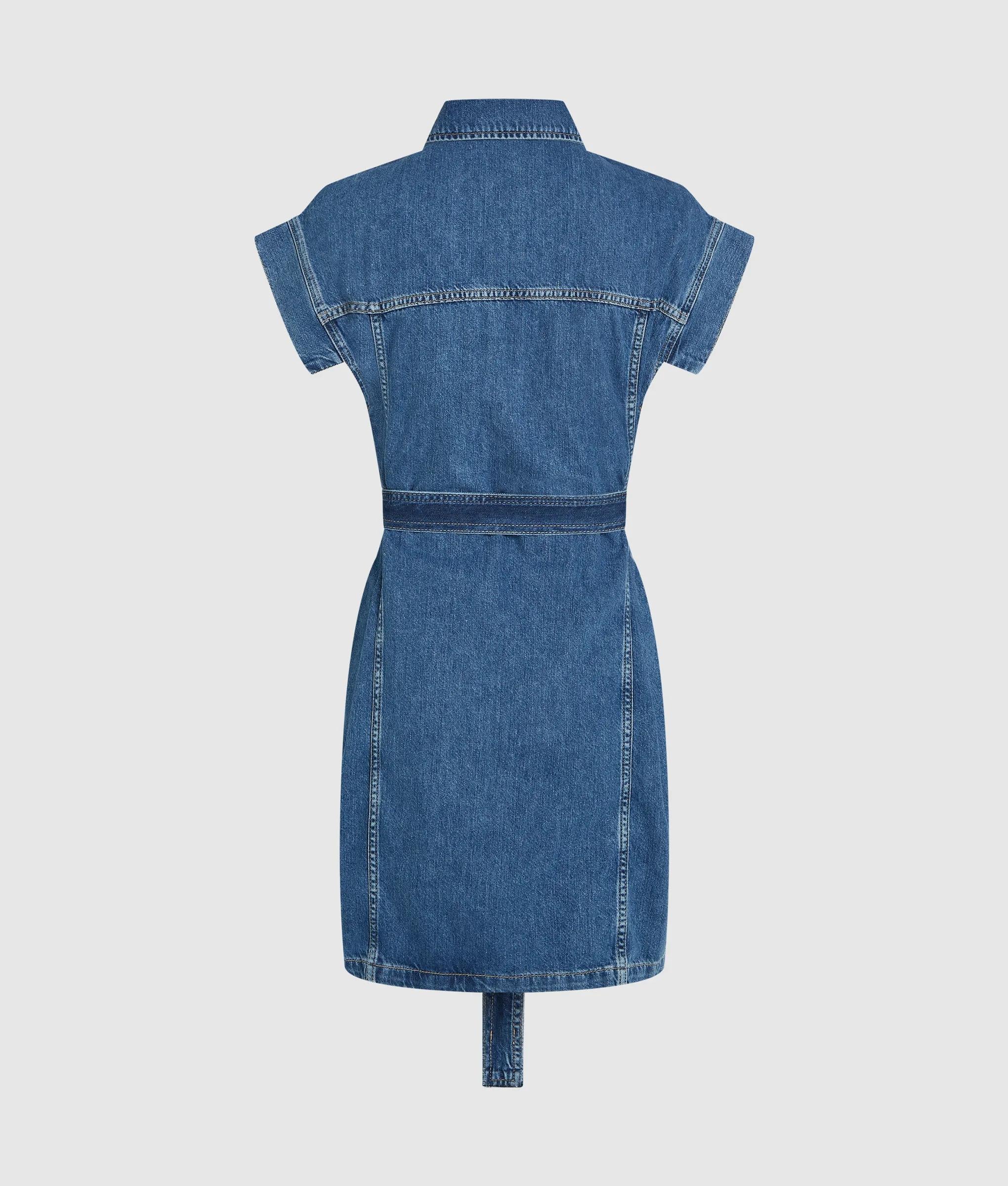 A denim dress made for effortless summer styling. Short-sleeves keep the silhouette easy while a cinching waistbelt defines the shape. Style with sneakers on the weekend or throw over a blazer for workwear with a casual edge.