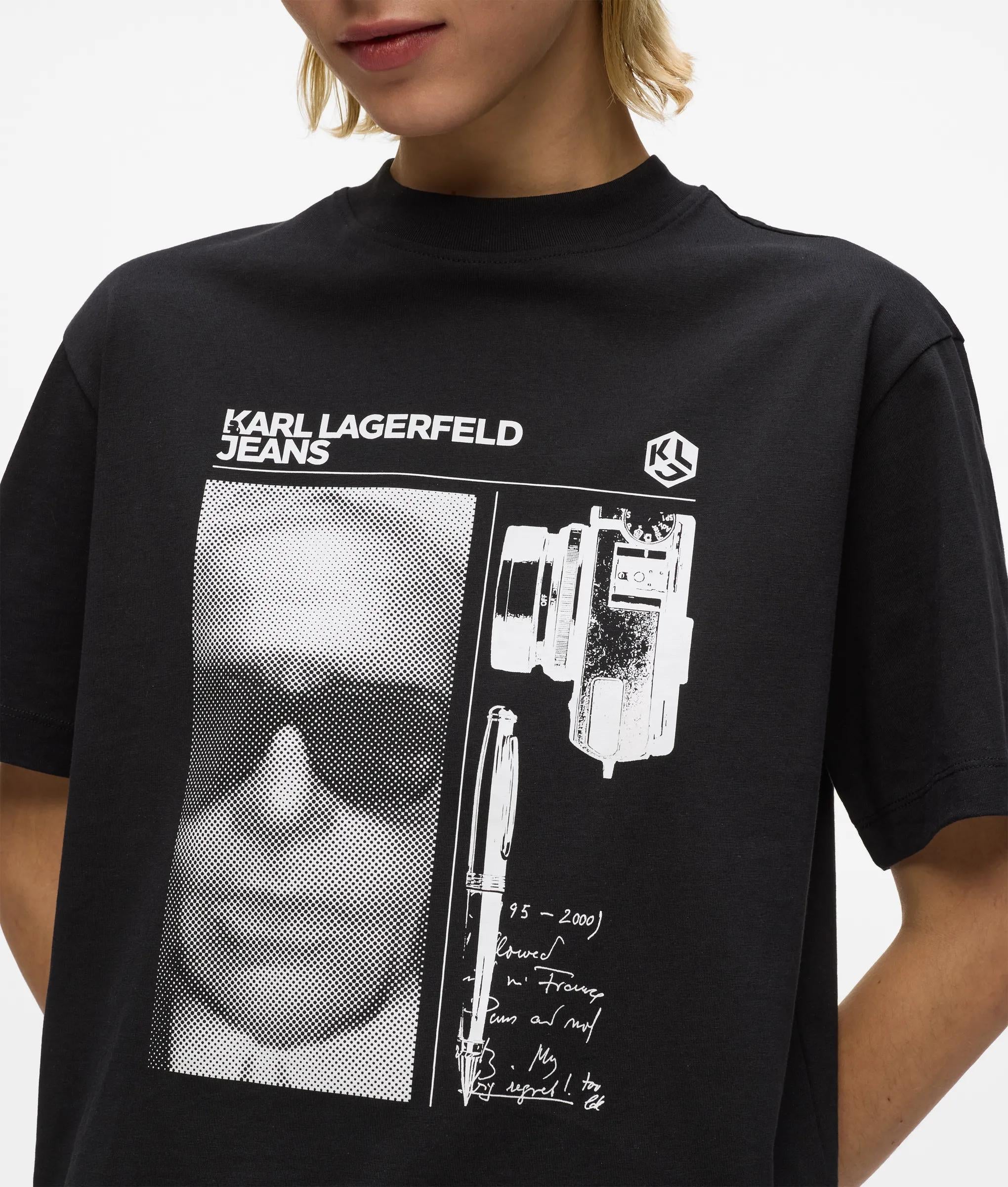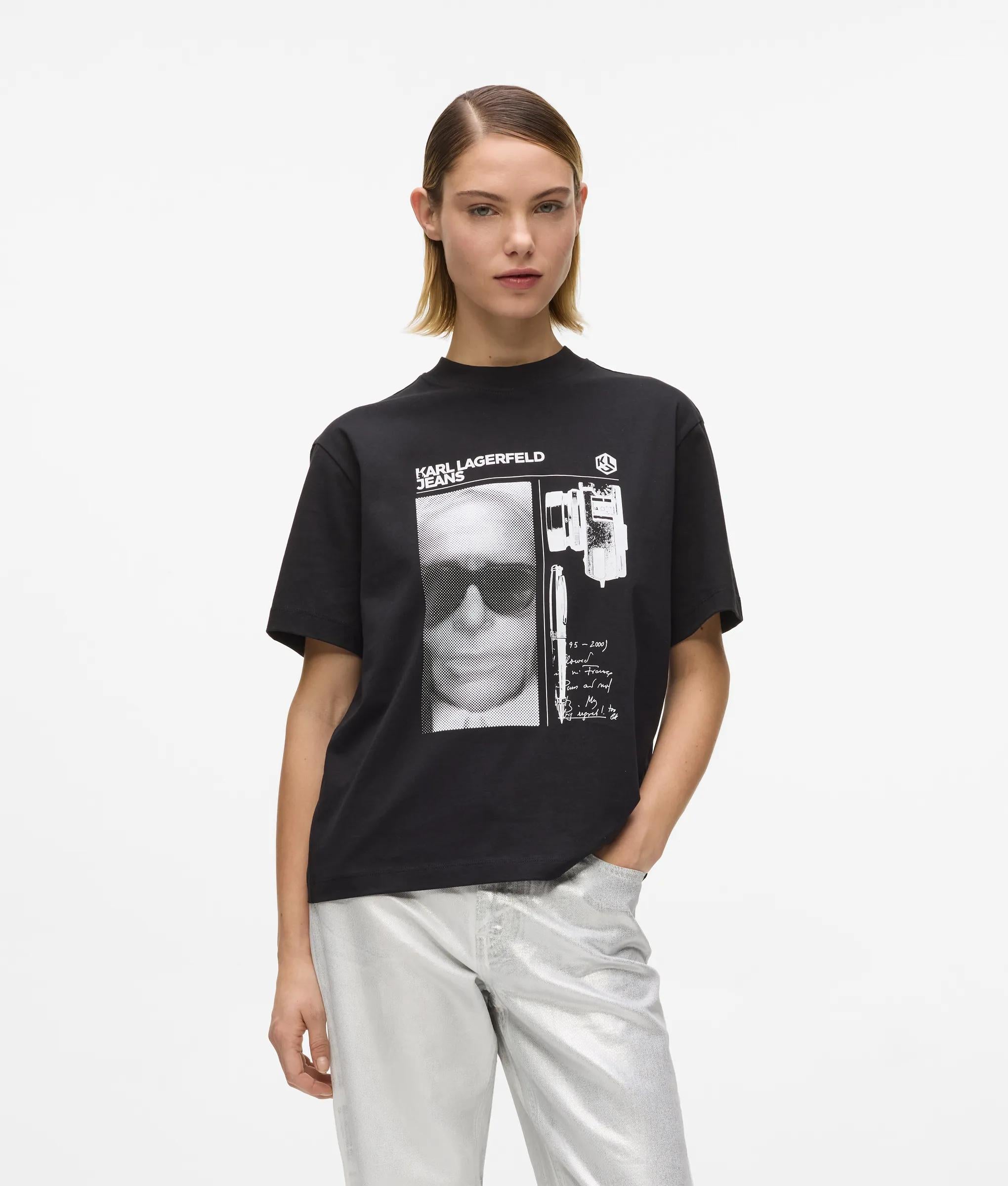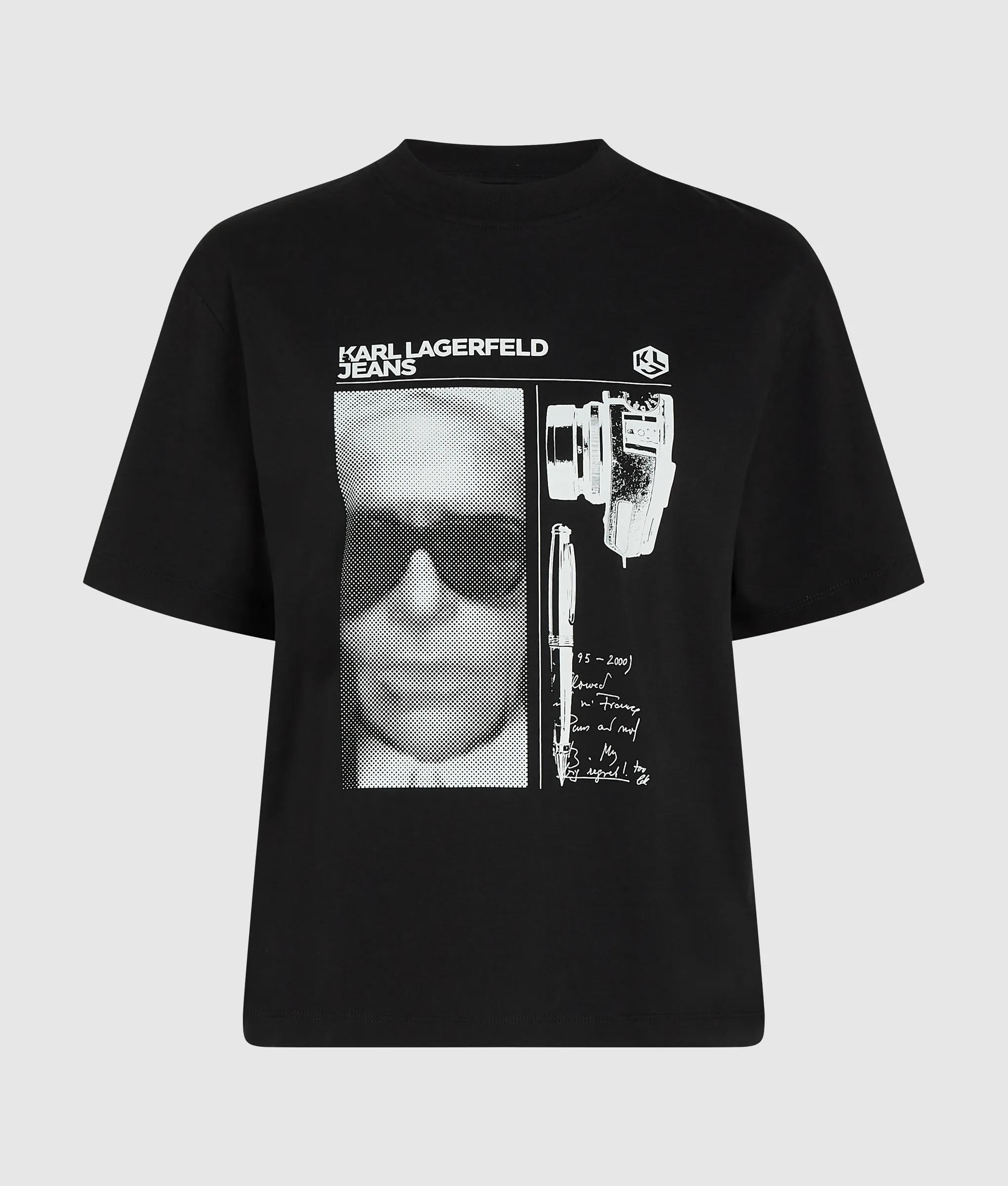 A fresh staple with iconic impact. Soft organic cotton shapes this classic crew-neck T-shirt, topped with bold artwork inspired by the legendary Karl Lagerfeld.