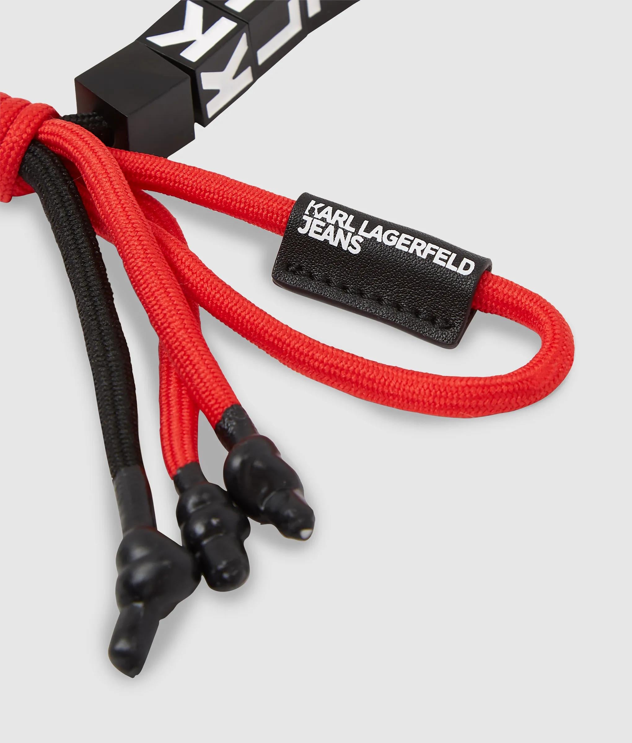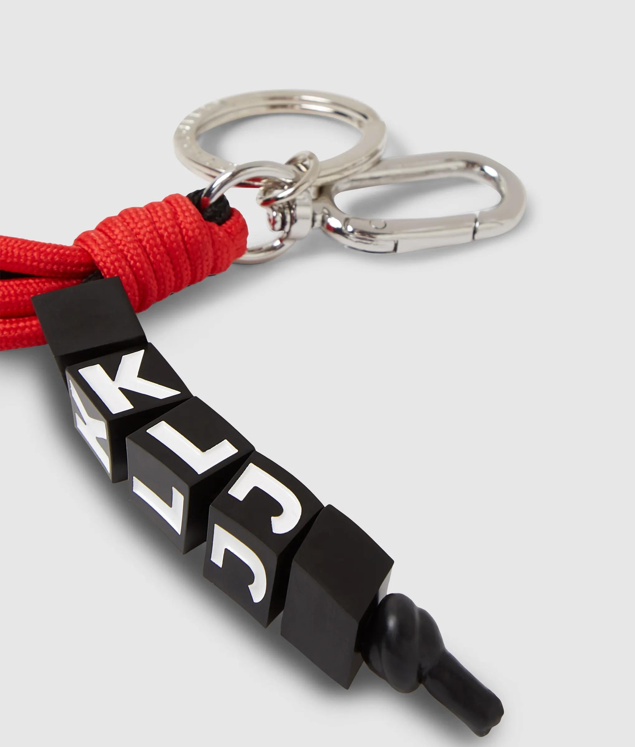 Tactile knotted cords meet bold hardware in this keychain, featuring resin-tipped ends and a KARL LAGERFELD JEANS charm for a confident, streetwise finish.