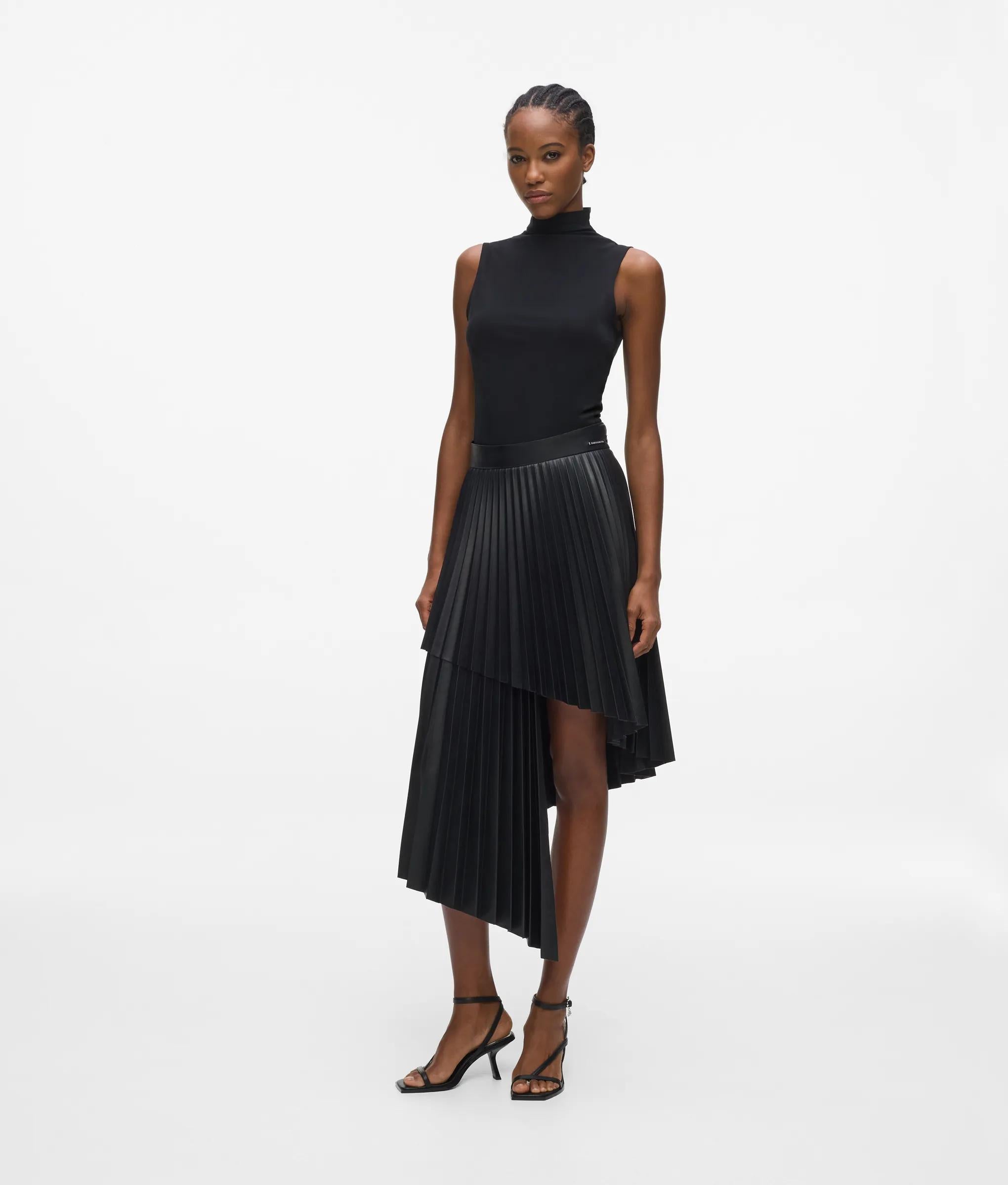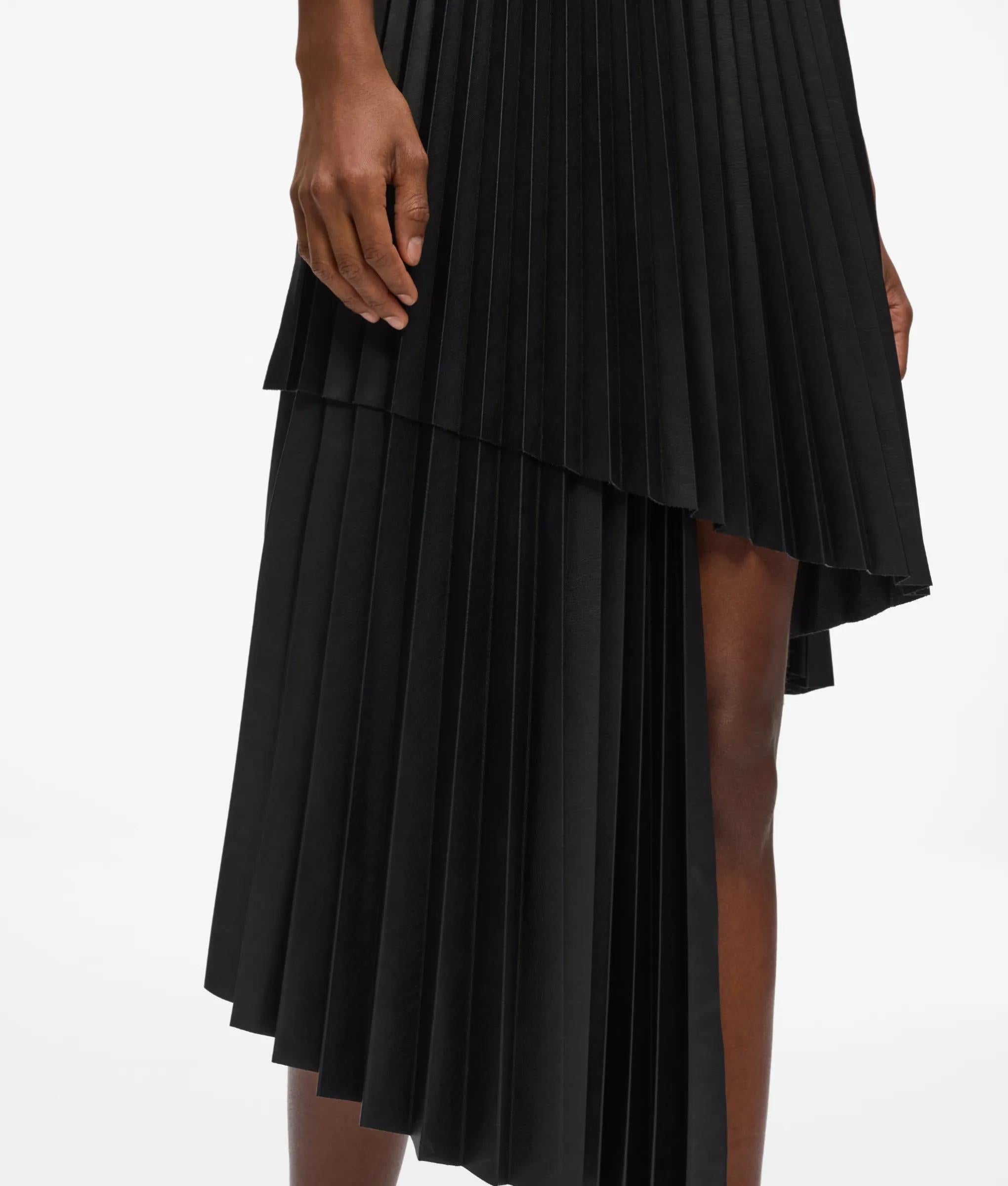 Command the room. Crafted from faux leather and sharply pleated, this asymmetric skirt creates sweeping movement and sculptural volume with every step. Style with a crisp white shirt or fitted knit for impact.