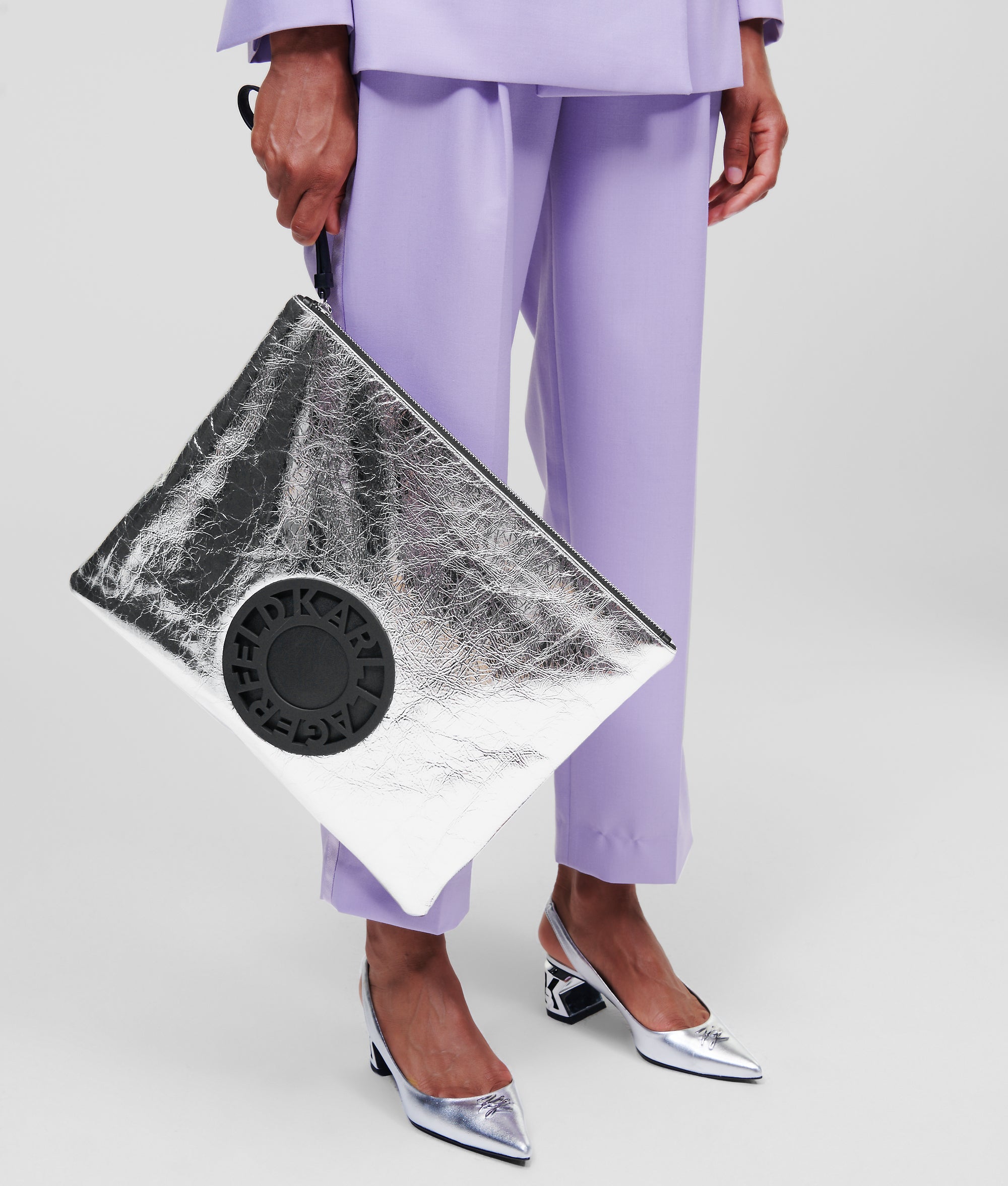 This oversized metallic clutch brings added drama to evening looks. Crafted from textured leather in a slouchy silhouette, the generous-sized accessory can be styled tucked under the arm or held at the hand by the zip puller. A graphic matt-black KARL logo disc completes the statement piece.
