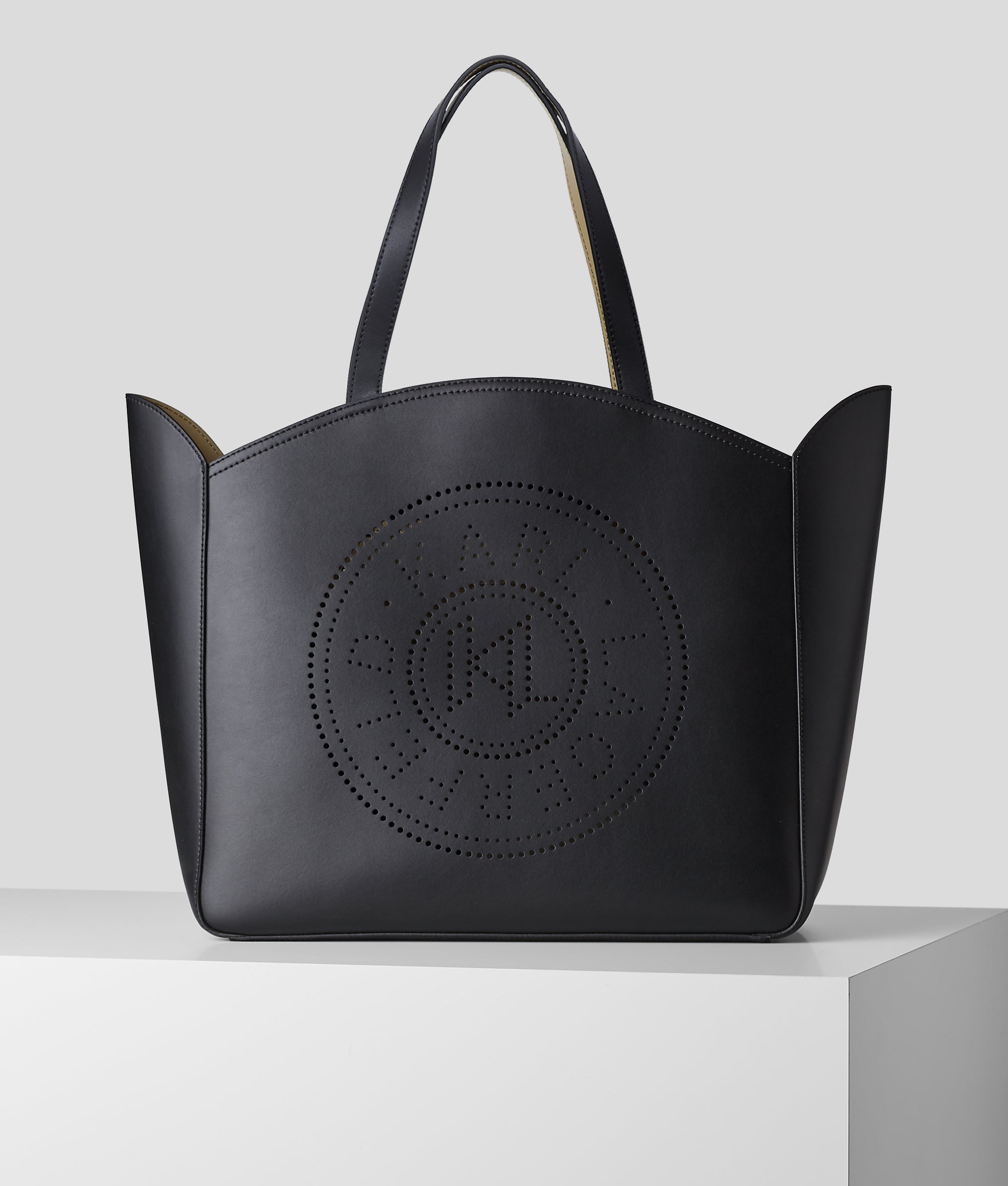 Contemporary design meets all-day practicality with this generous-sized tote bag. Crafted from smooth leather, the bold silhouette is adorned with a perforated KARL logo design encircling the iconic KL House monogram.