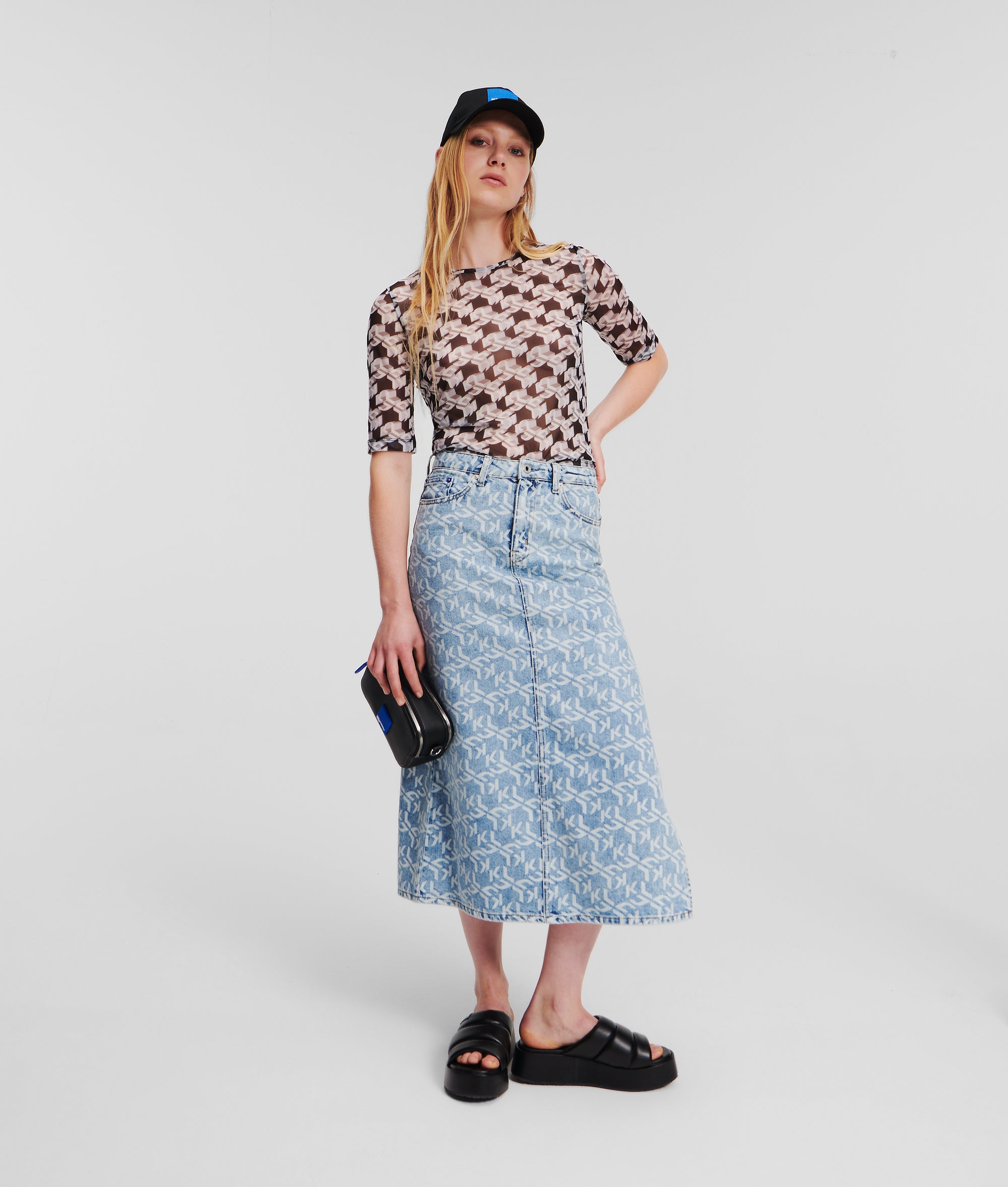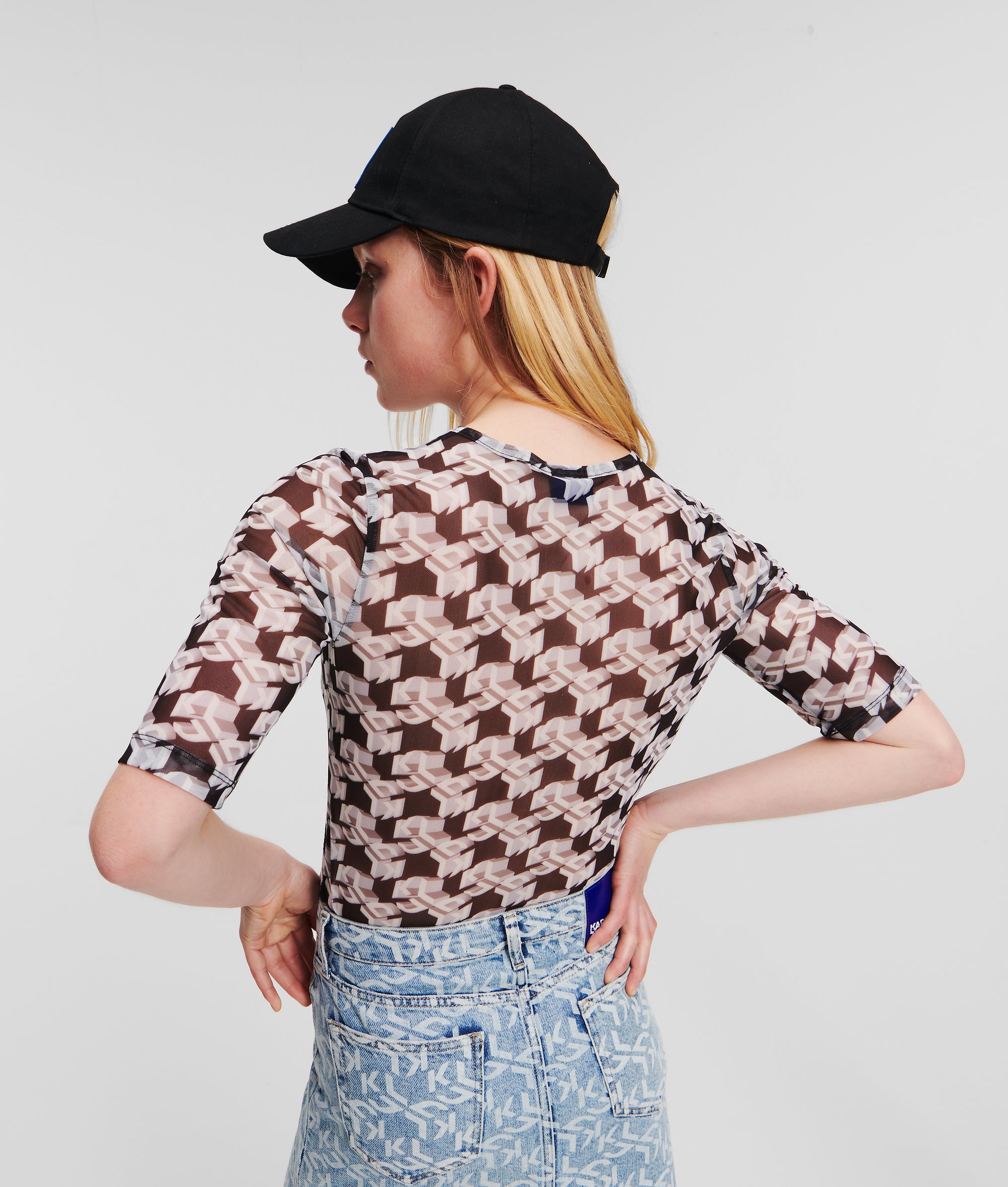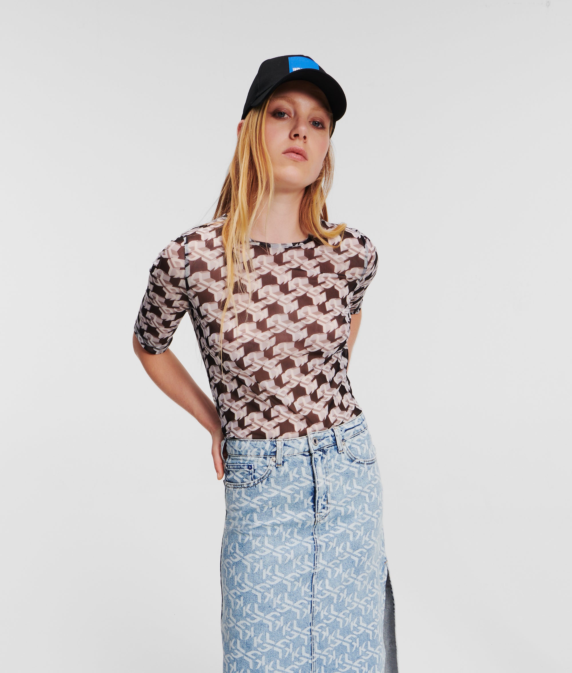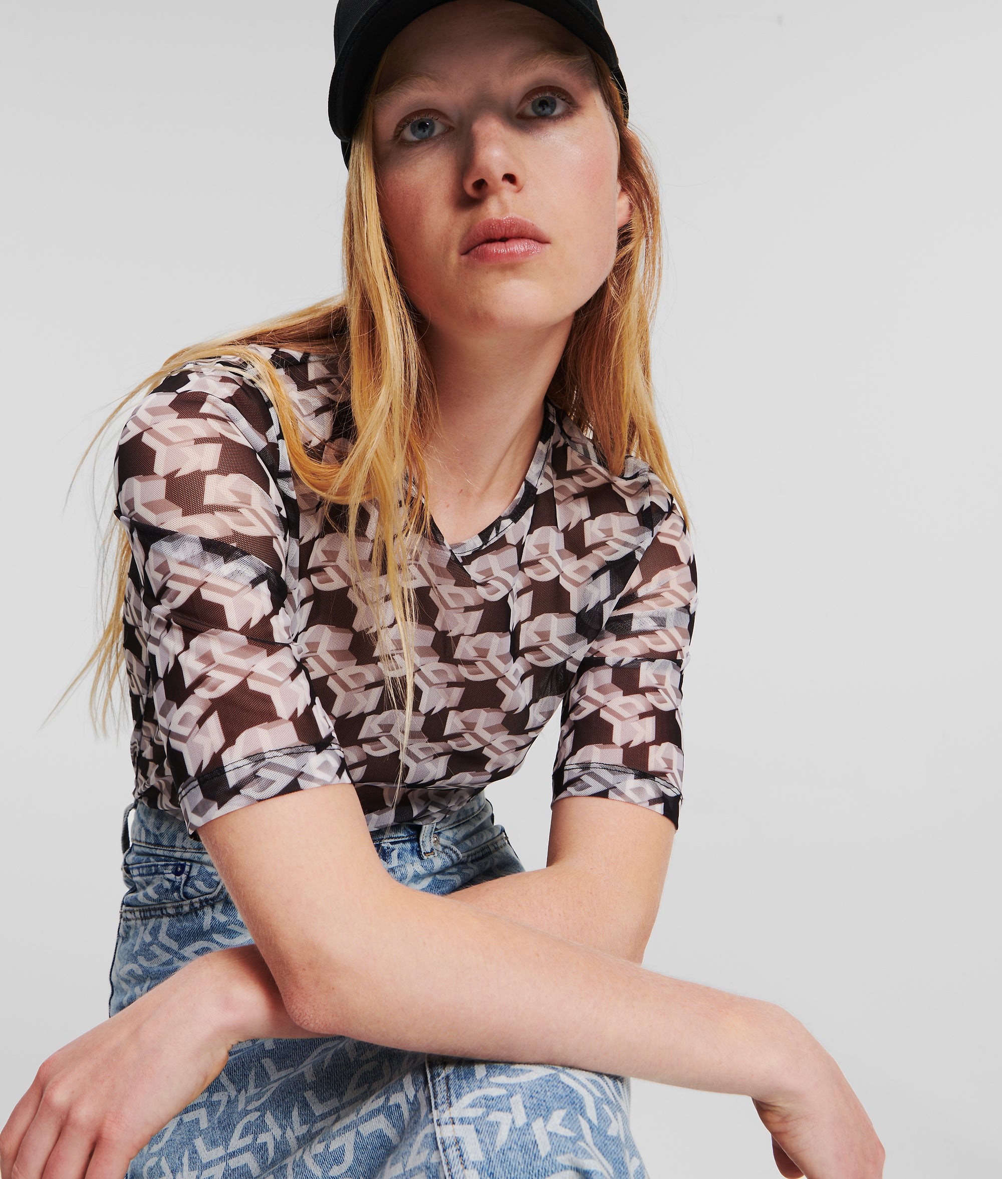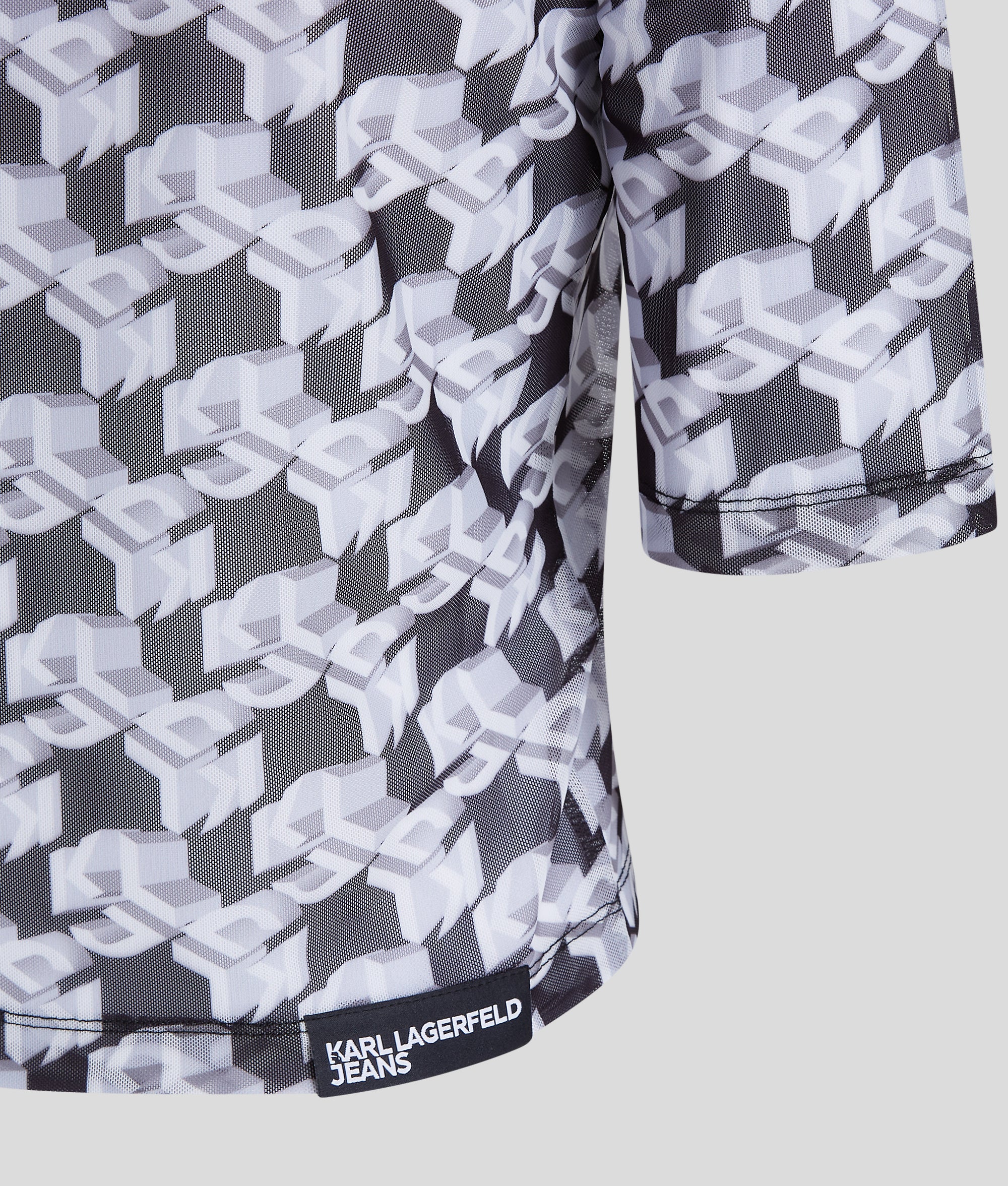 A sheer marvel with the iconic KARL LAGERFELD JEANS monogram, this top features a timeless crew neck and chic short sleeves.