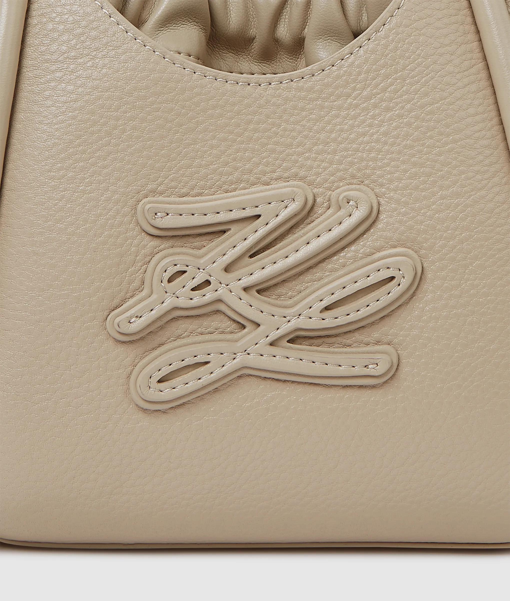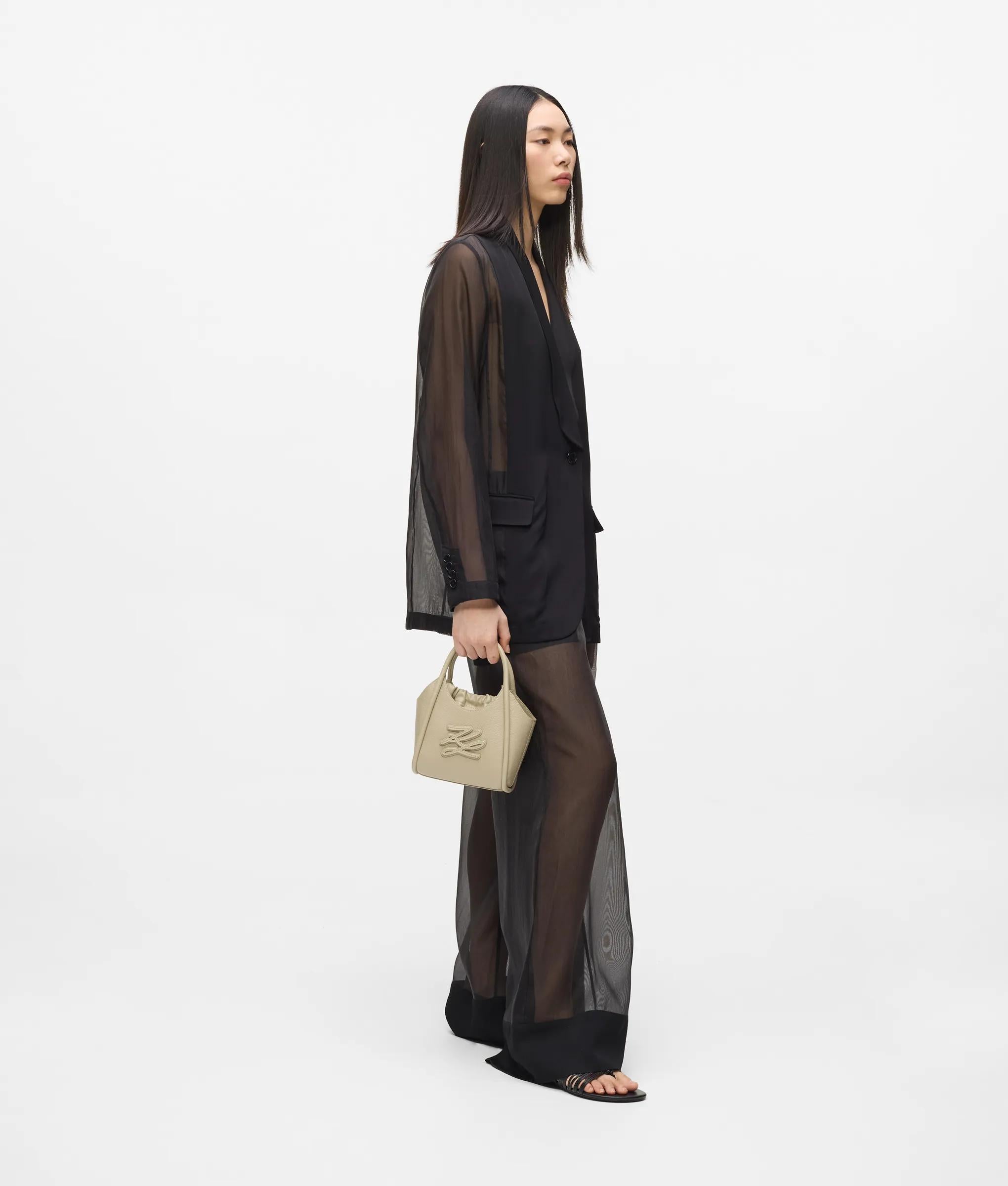 This mini tote bag blends elegance with practicality. Its supple technical leather and tonal logo create a refined look, while the drawstring pouch and adjustable strap offer security and versatile styling.
