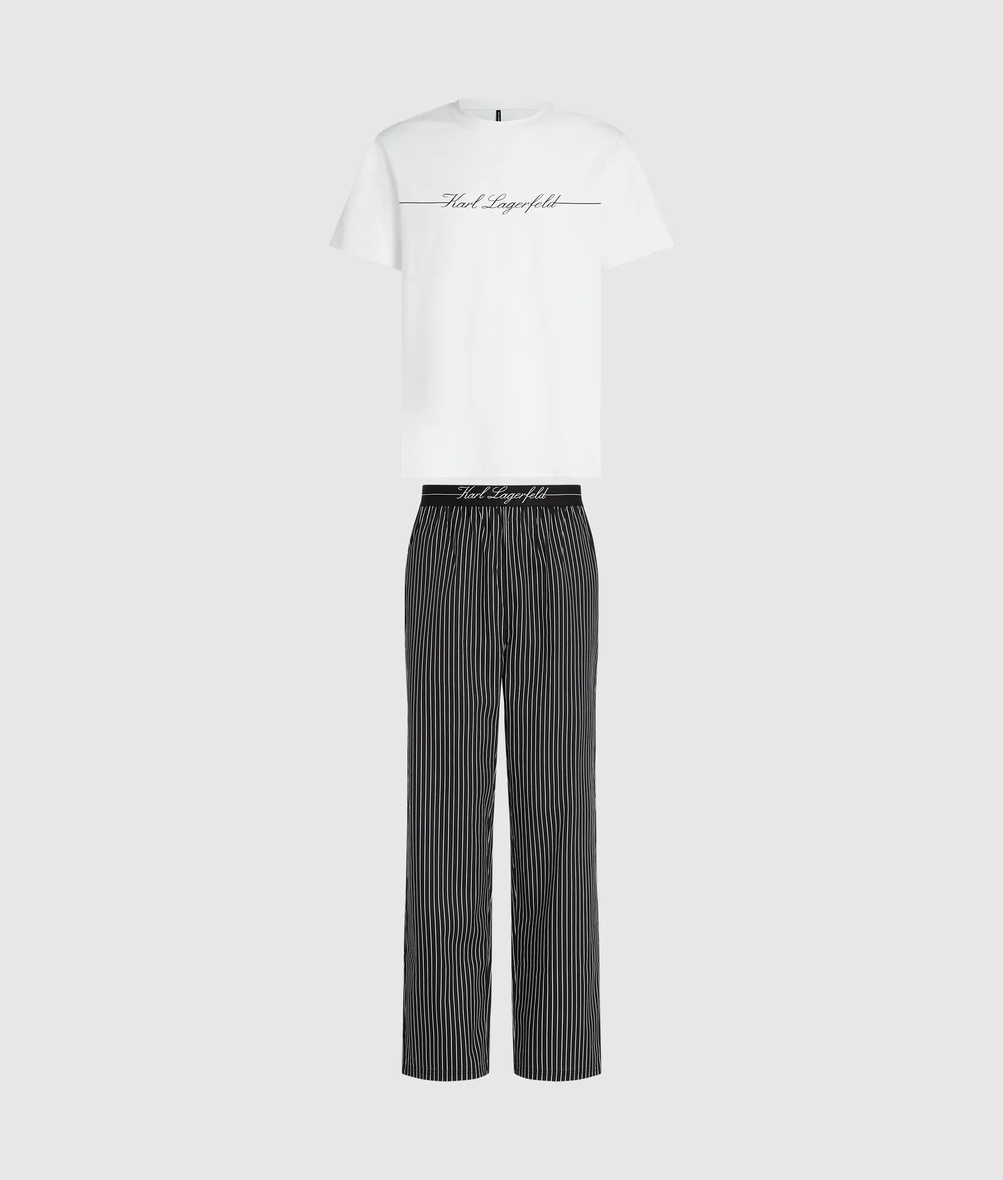 Relax in refined comfort with this T-shirt and pants pajama set. A pinstripe design brings timeless appeal to the woven pants, while Hotel Karl artwork at the tee further enhances the elevated pairing.