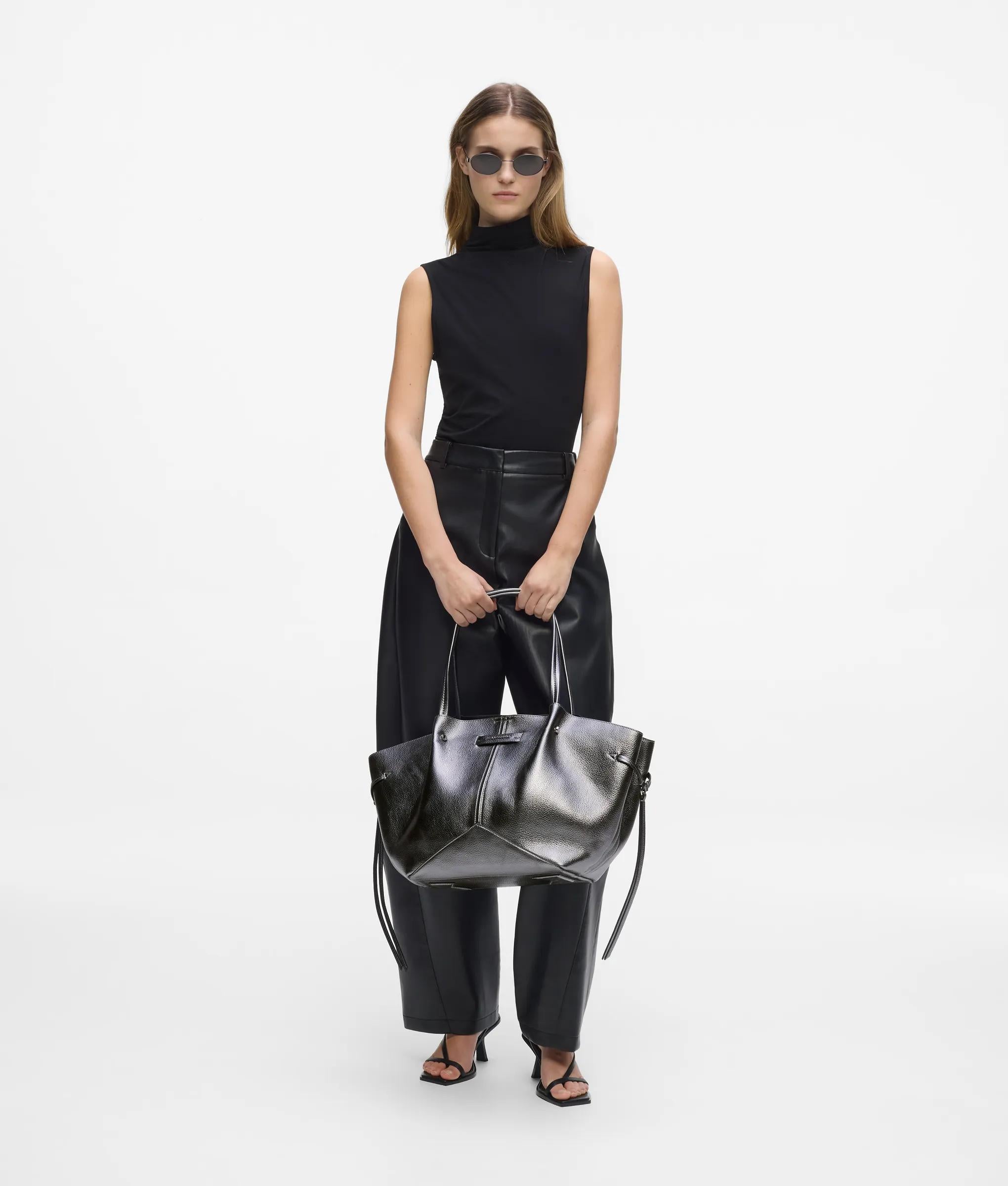 A bold metallic finish gives this spacious tote bag an urban edge, enhanced with contemporary drawstring details. A zipped compartment comfortably fits a laptop, while twin handles ensure easy carrying.