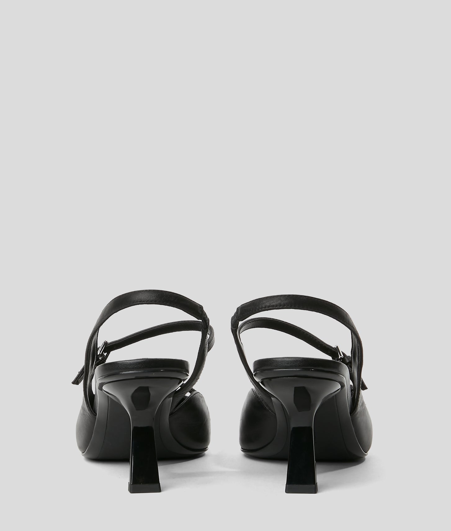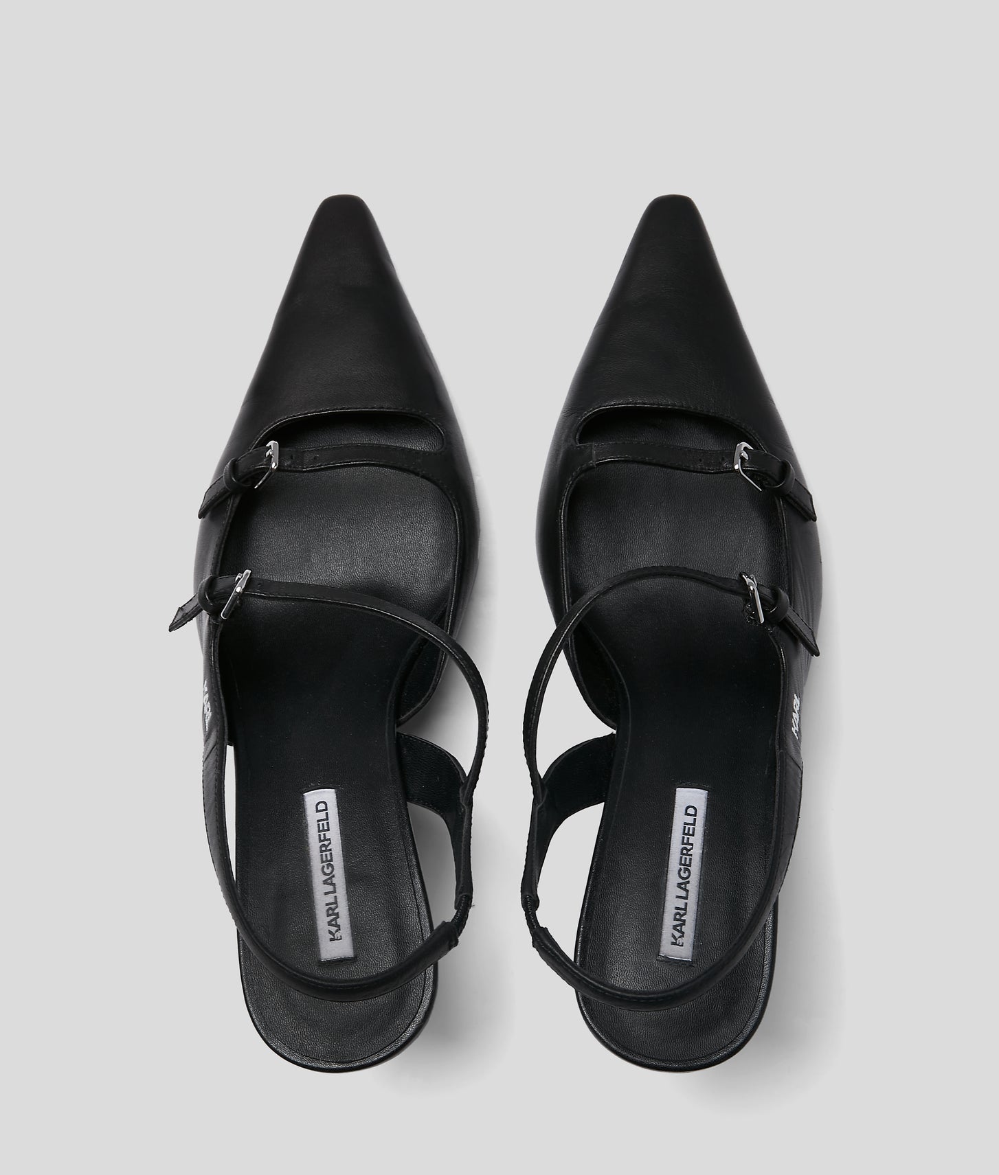 Elevate your collection with these sophisticated slingbacks, featuring an elegant pointed toe and a low, angled heel that shines with a glossy finish. The elasticated slingback and twin straps with buckles provide a secure fit, while the subtle KARL LAGERFELD logo adds a touch of refinement.
