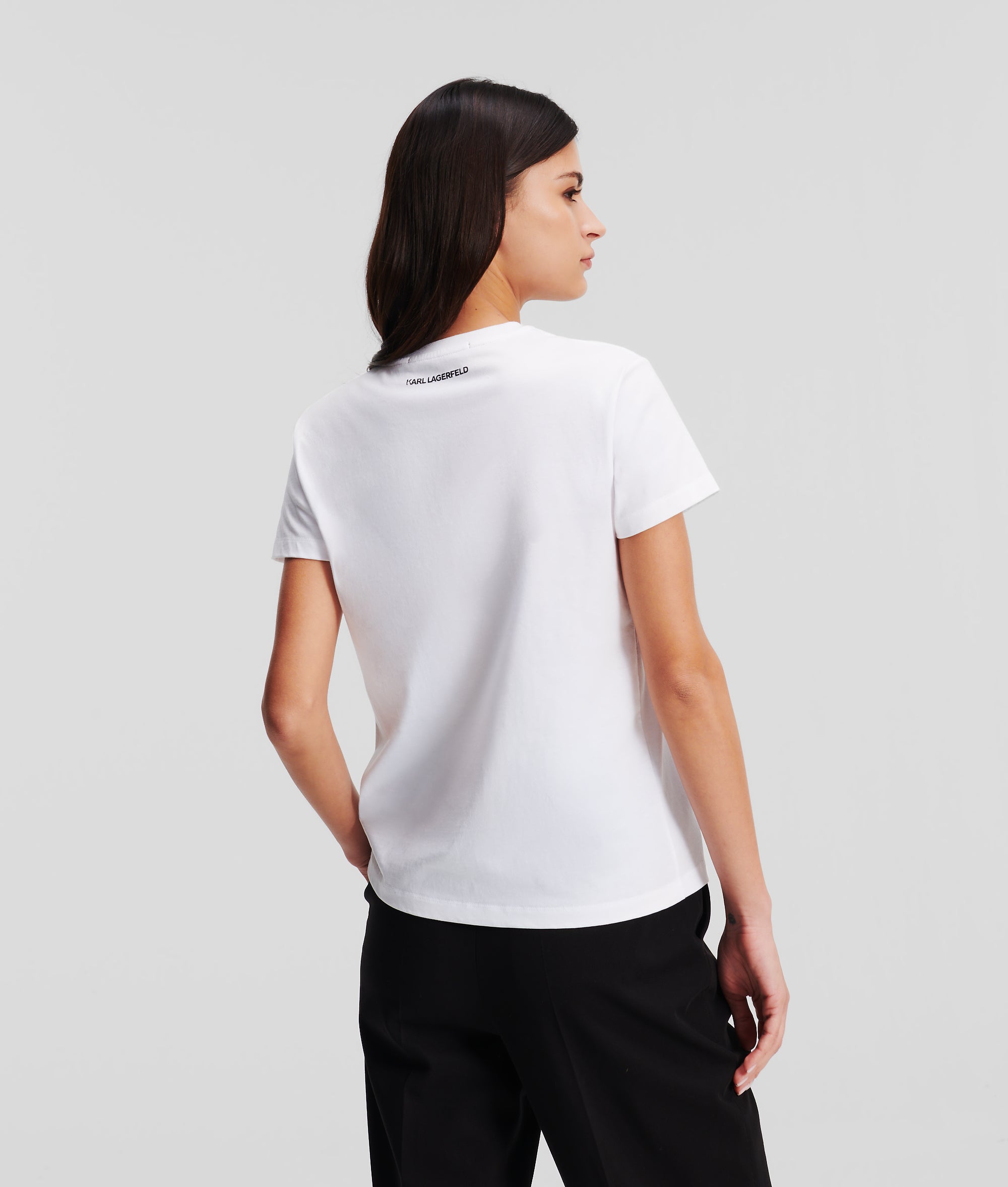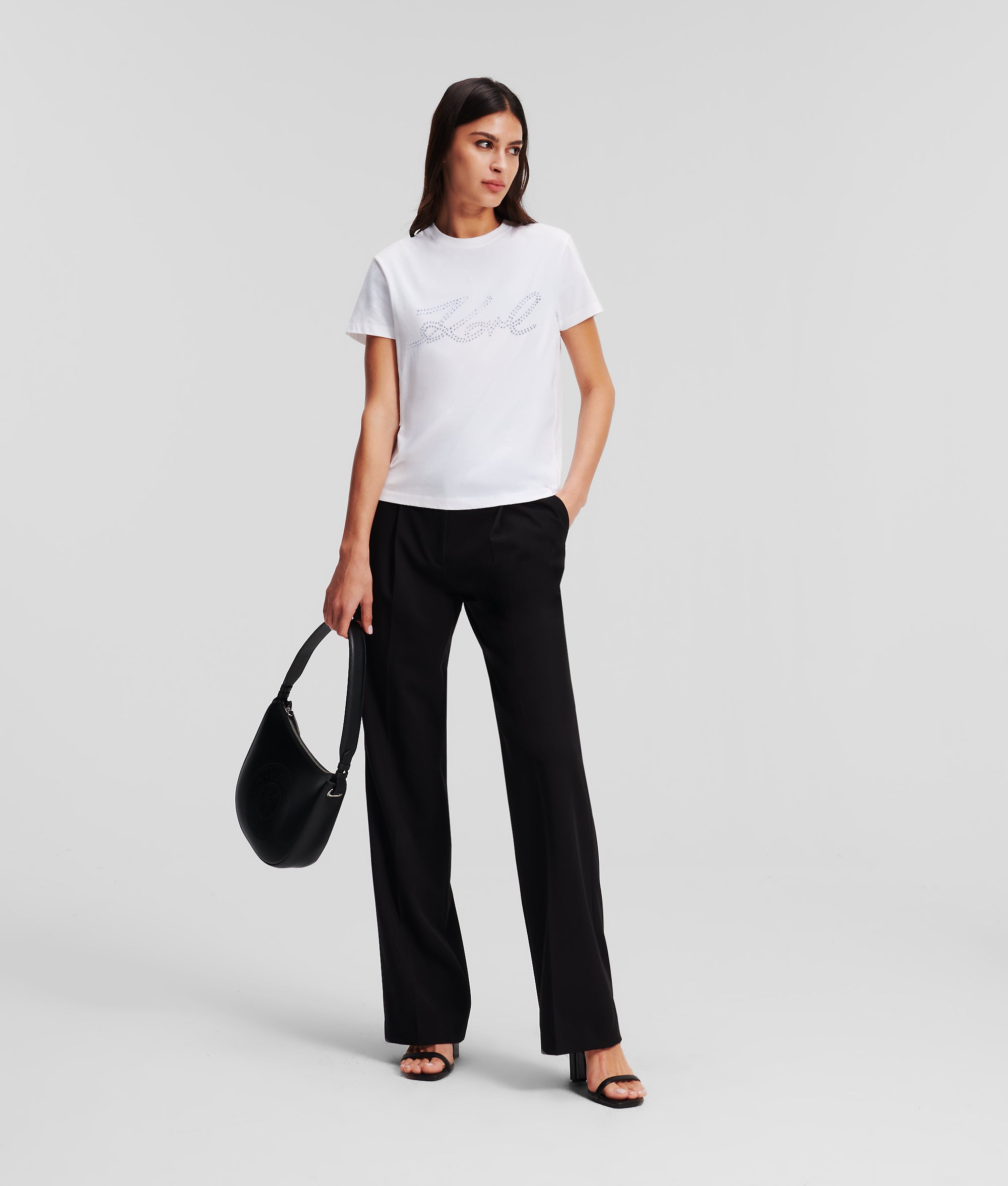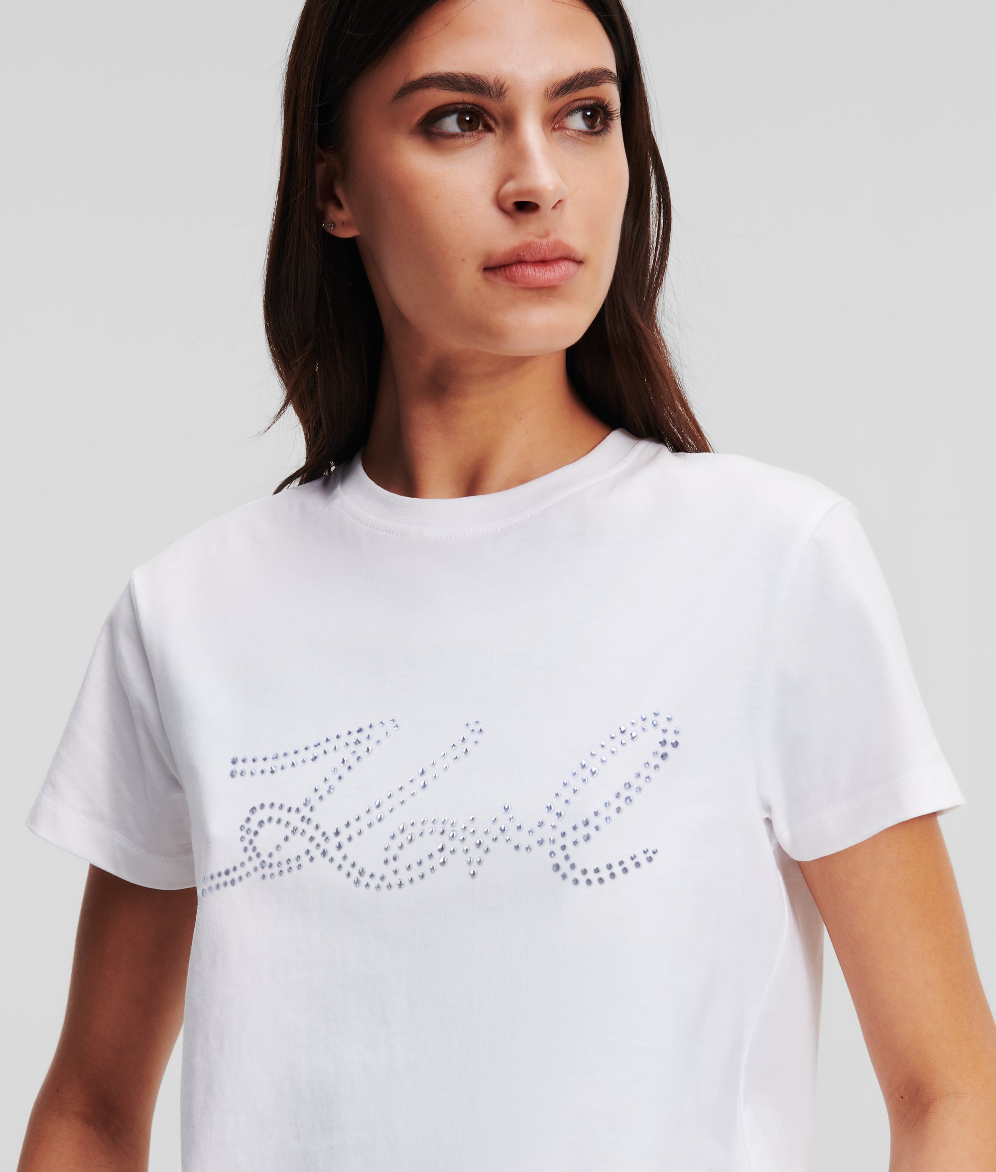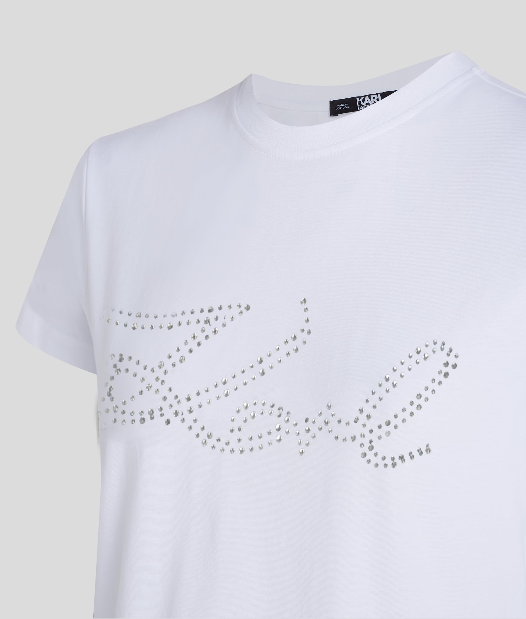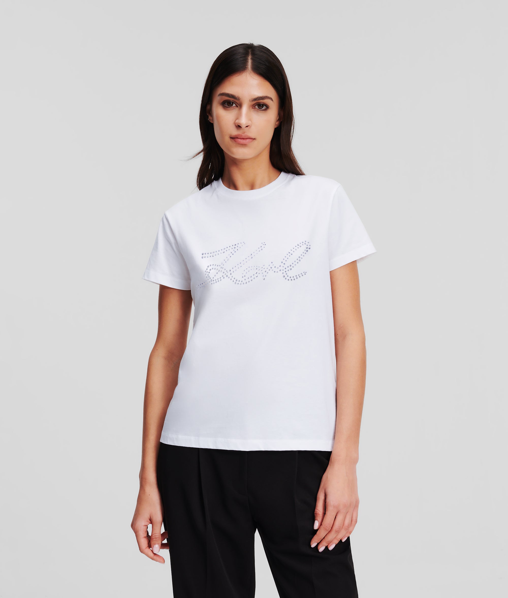 Organic cotton jersey provides a refined base for this exclusive T-shirt, featuring a sparkling rhinestone KARL Signature at the chest. Its classic crew neck silhouette makes it a timeless addition to any wardrobe, epitomizing casual-cool style with a glittering twist.