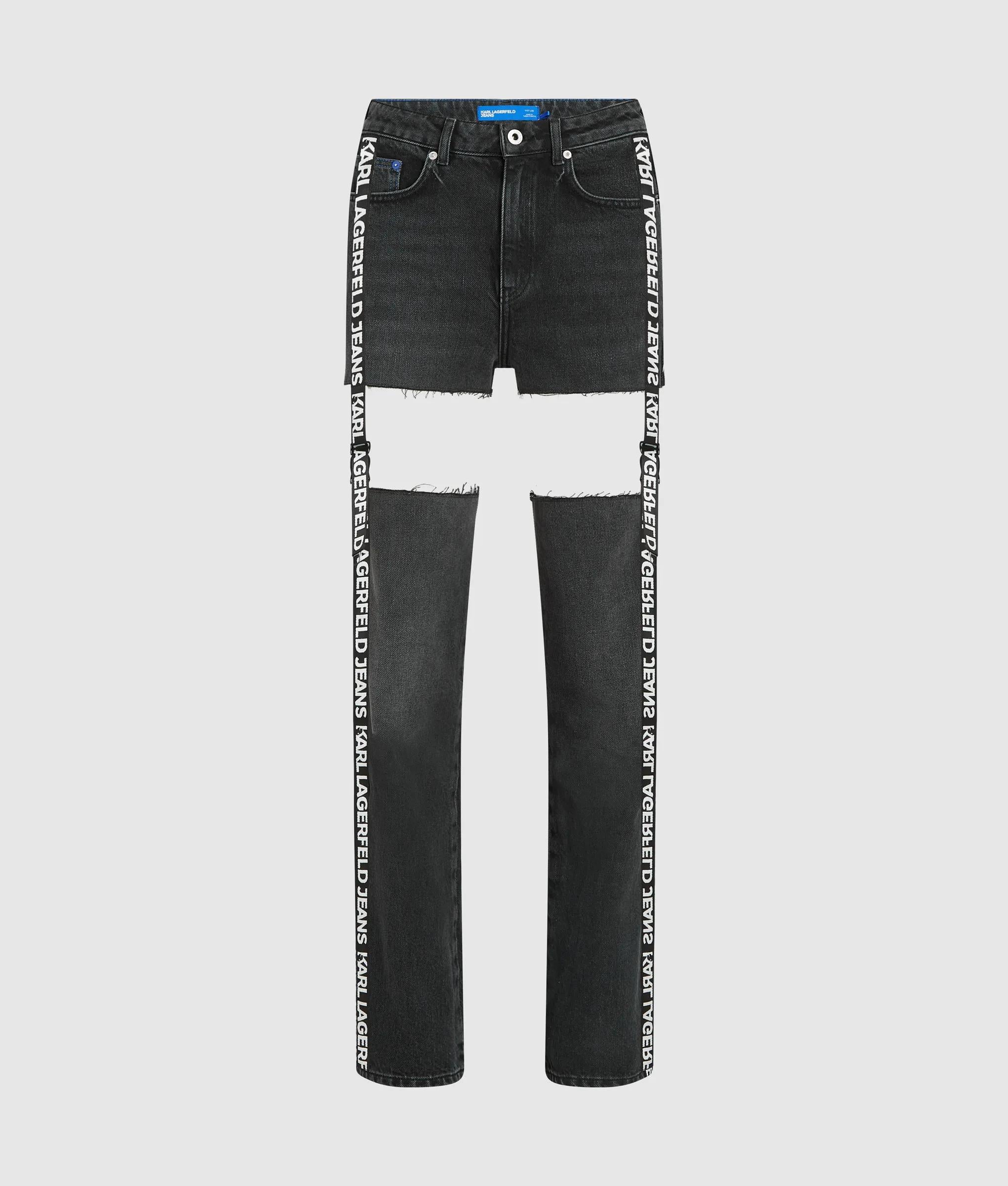 Denim with a disruptive twist. These straight-leg jeans feature bold cut-outs at the upper legs. Logo tape connects the upper and lower sections along the outer seams, turning a denim classic into a fashion statement.