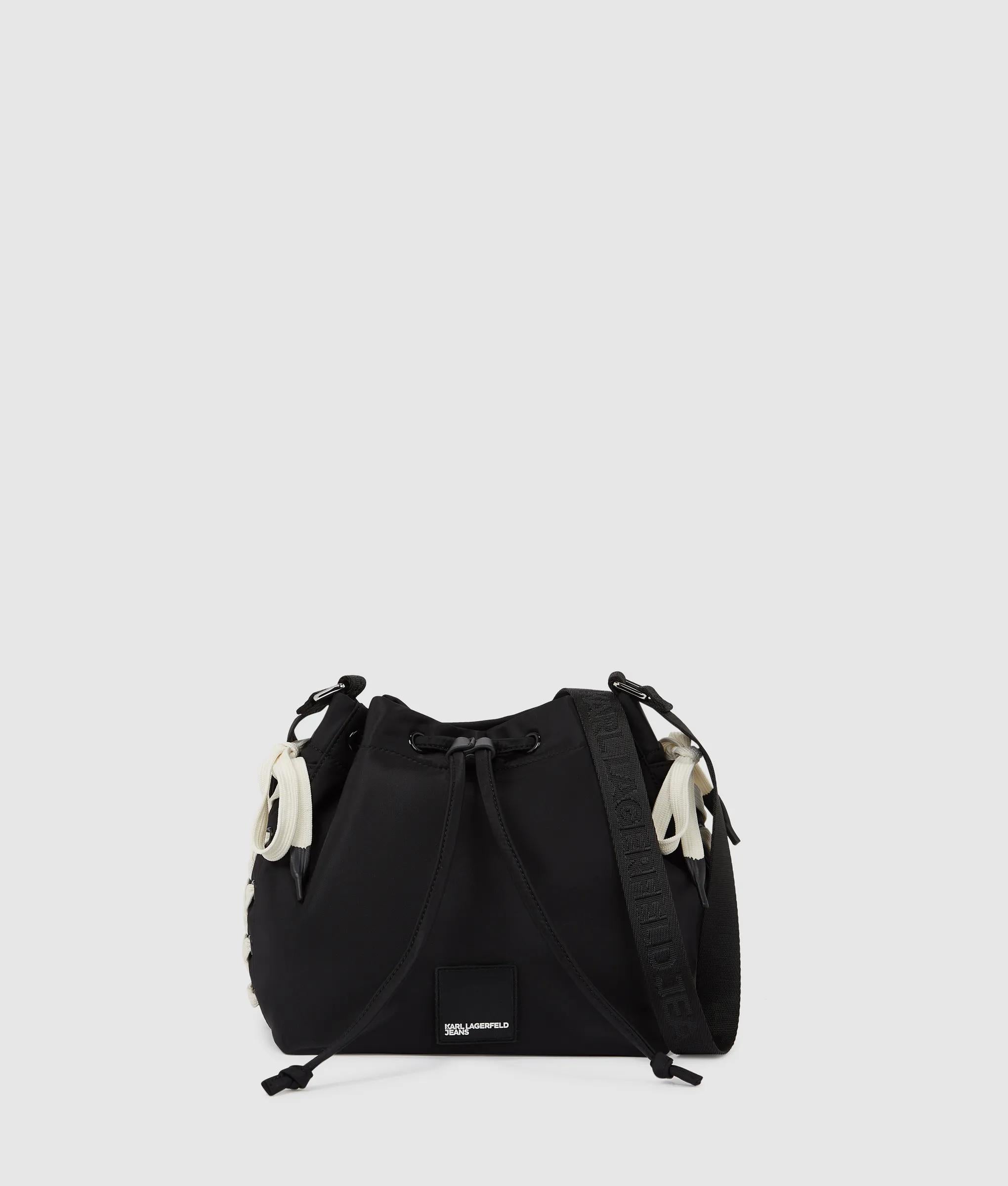 Bold lace-up sides and drawstring detailing add edge to this nylon bucket bag, finished with a rubber KARL LAGERFELD JEANS logo and an adjustable crossbody strap for versatile wear.