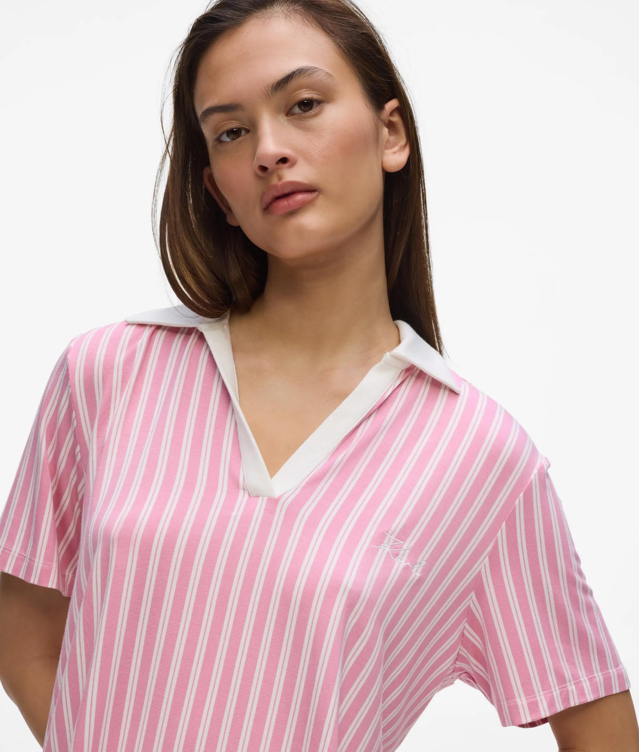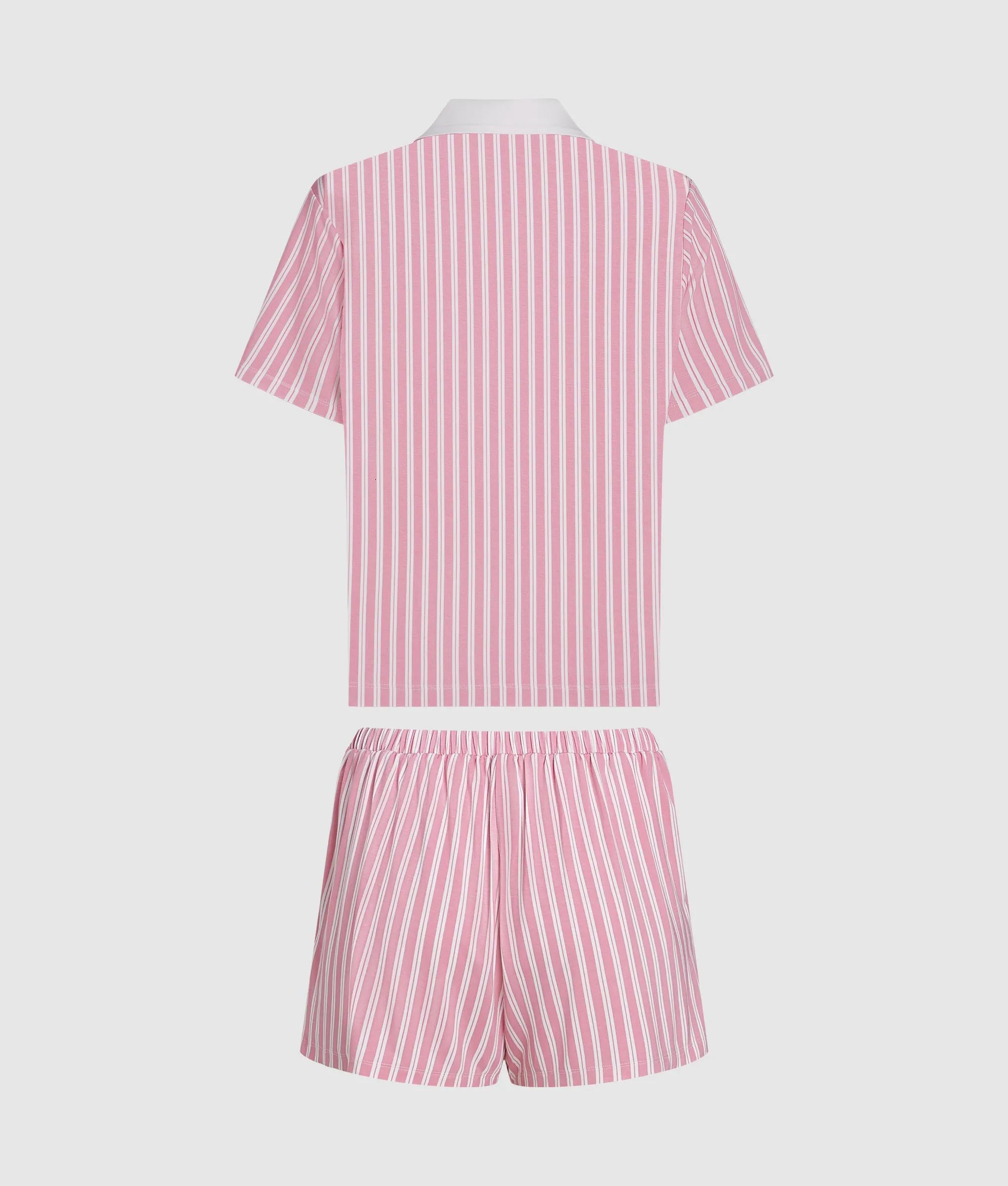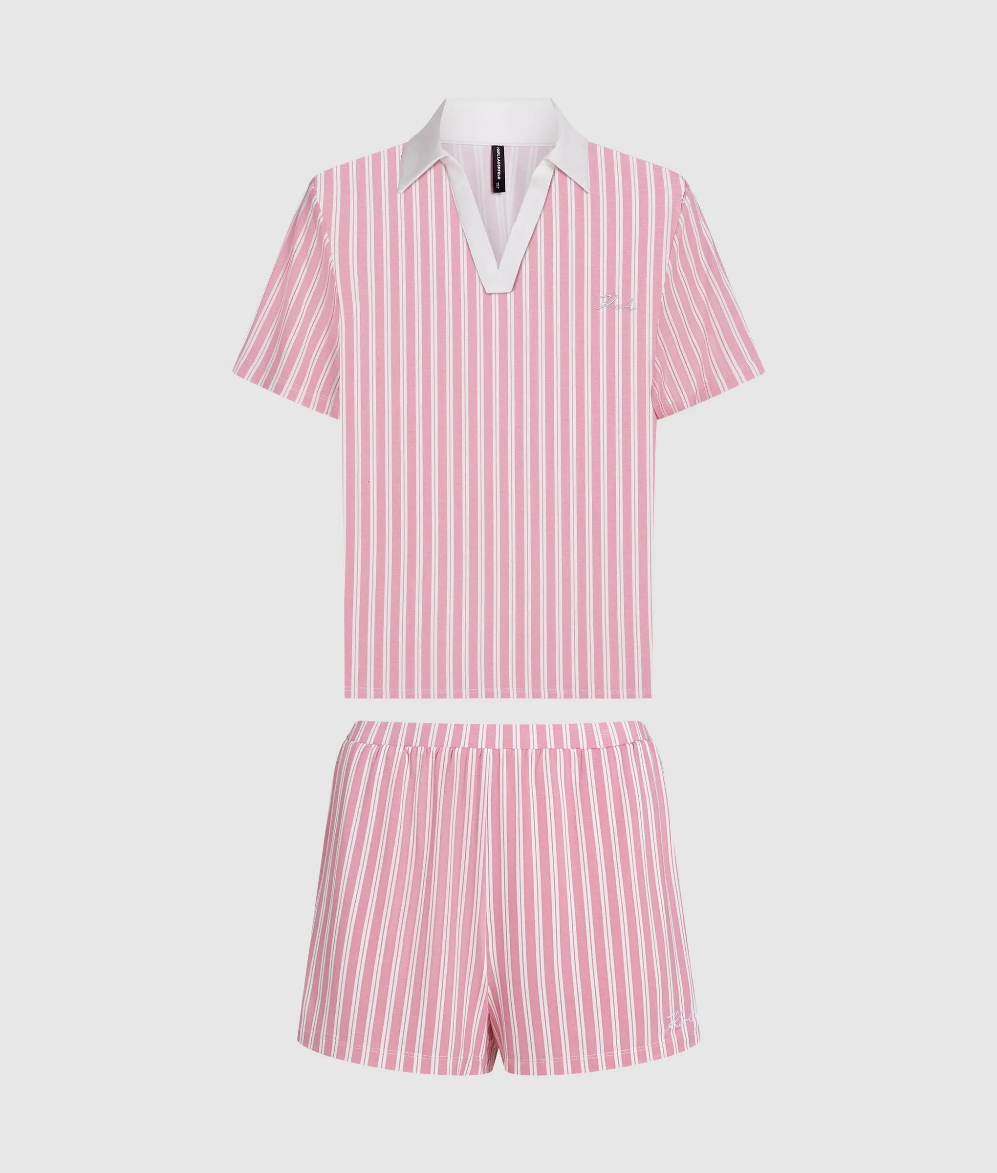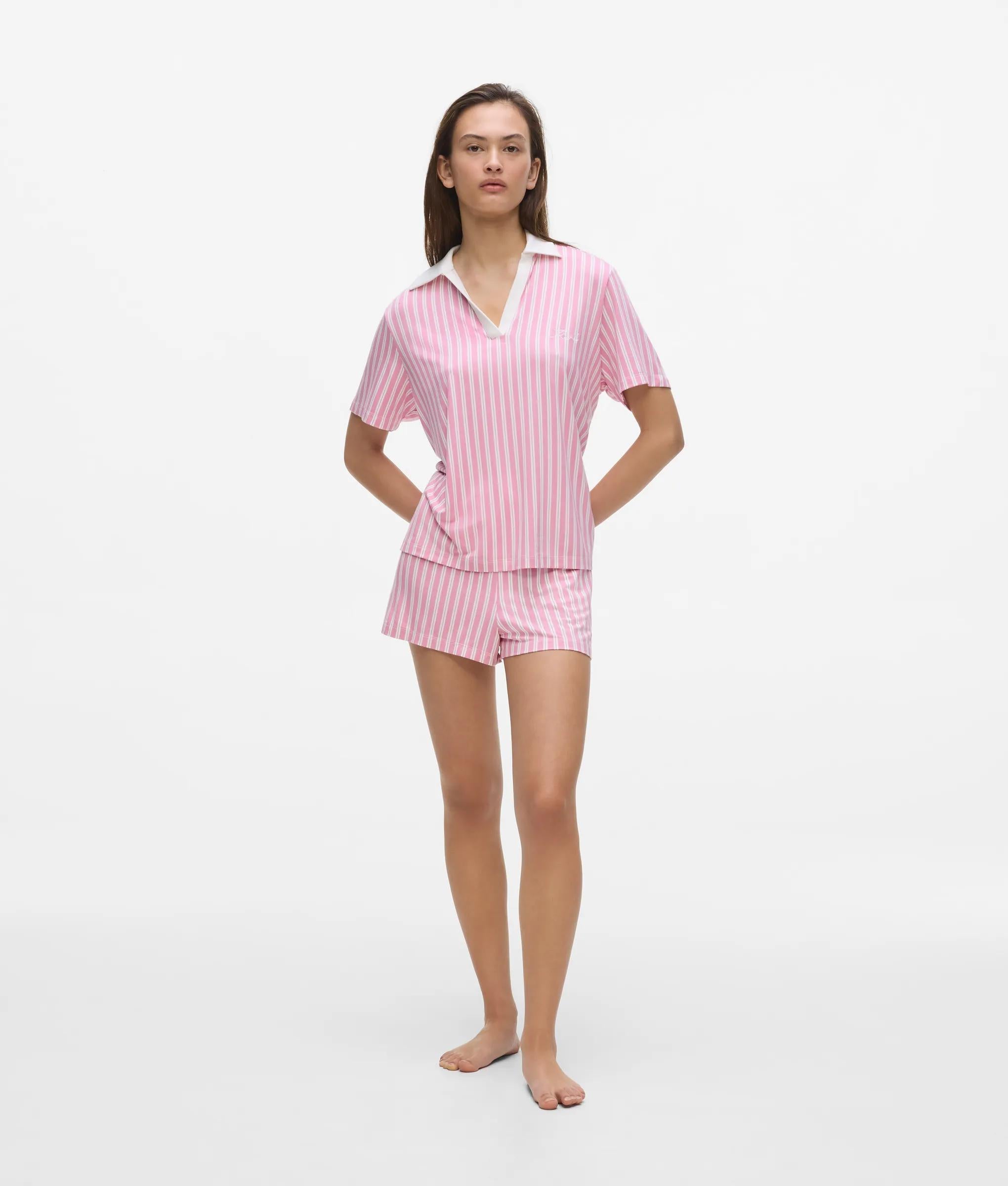 Tailored for serene nights, this two-piece pajama set pairs a relaxed short-sleeved polo shirt with elasticated-waist shorts. Sophisticated stripes and discreet logo embroidery underscore its refined allure.