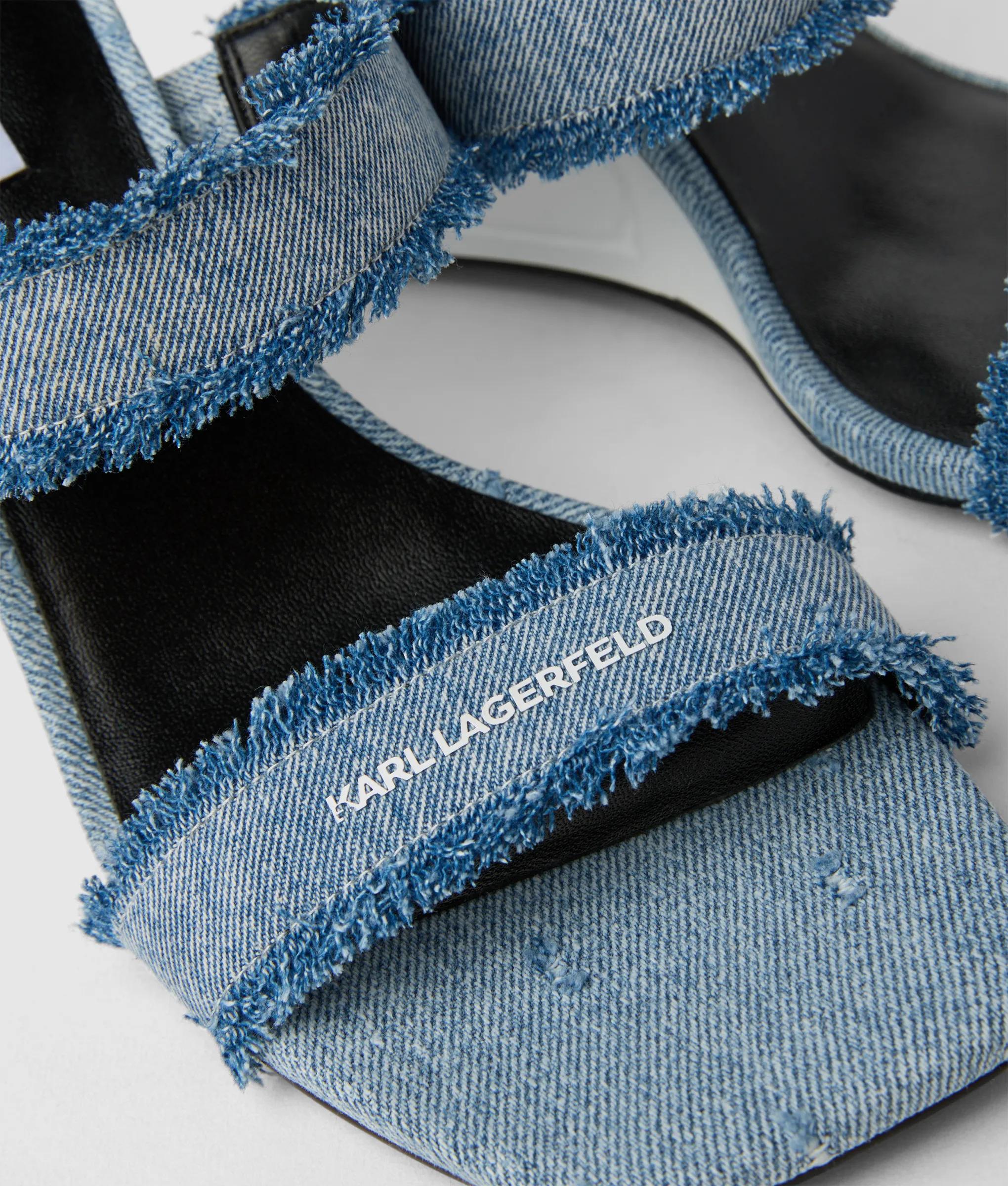 Level-up your summer style with these unique KARL LAGERFELD slip-on sandals, featuring twin denim straps with edgy frayed details for a modern twist. The contemporary wedged heel makes them the perfect footwear for both casual-cool and dressier looks.
