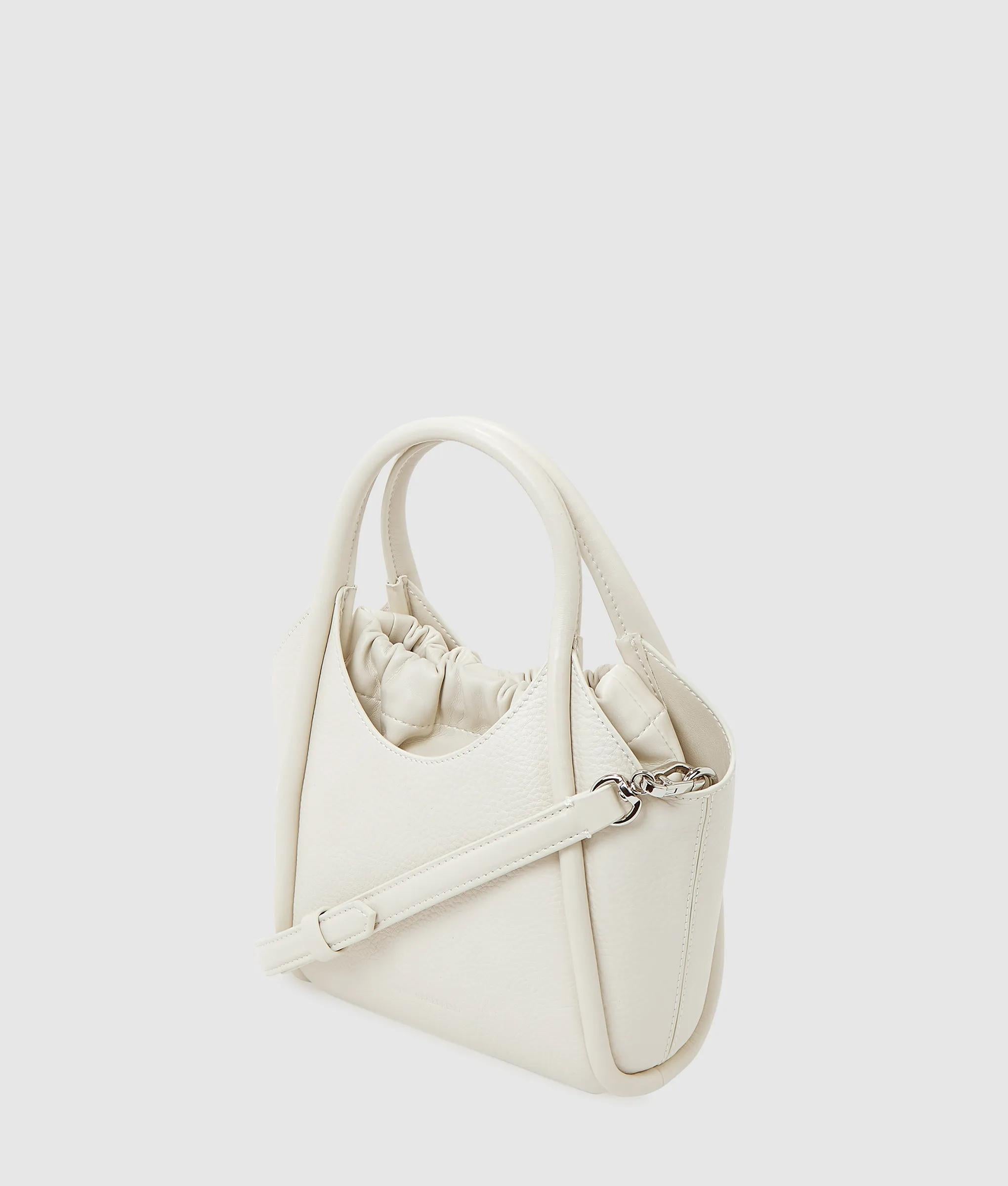 This mini tote bag blends elegance with practicality. Its supple technical leather and tonal logo create a refined look, while the drawstring pouch and adjustable strap offer security and versatile styling.