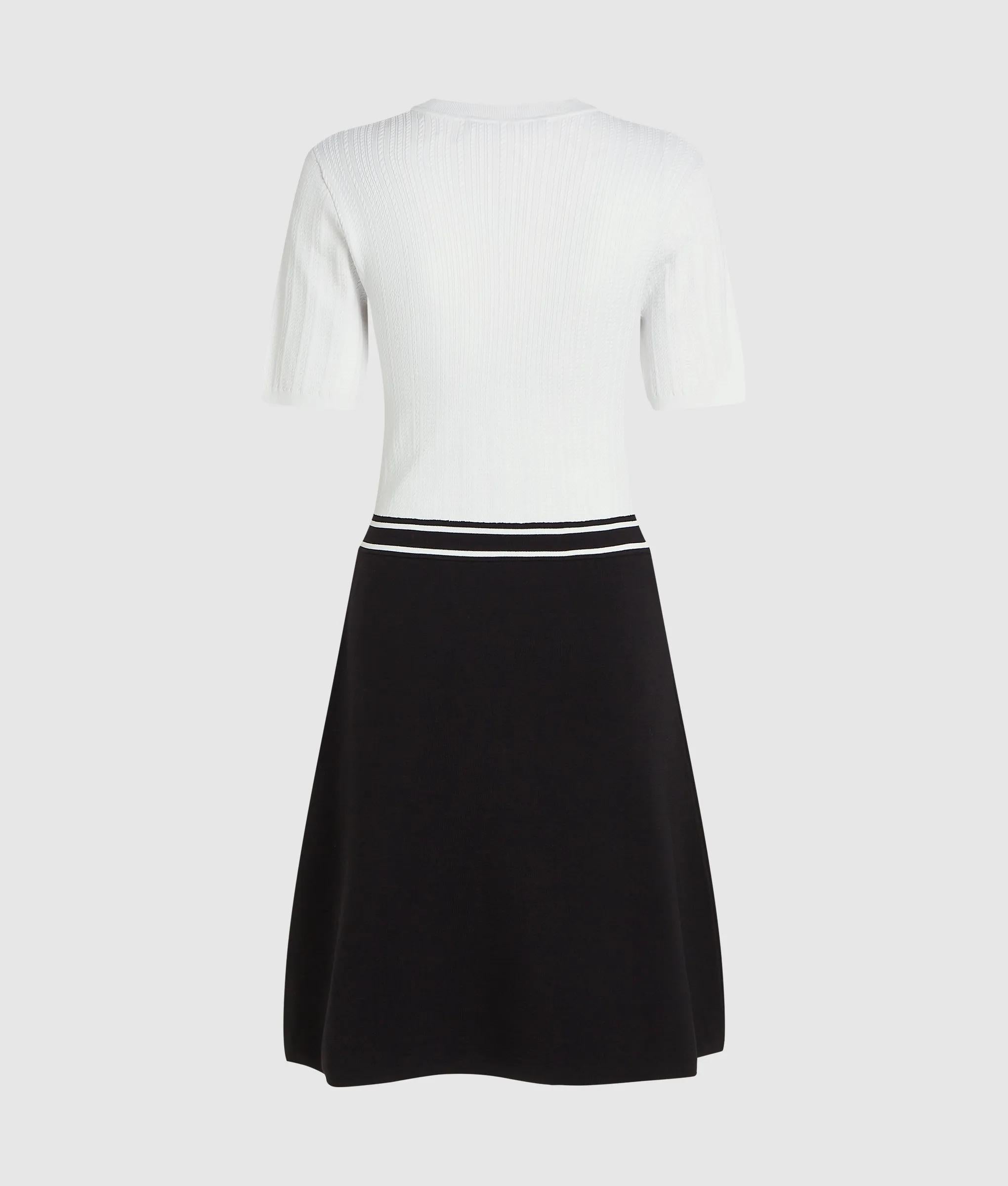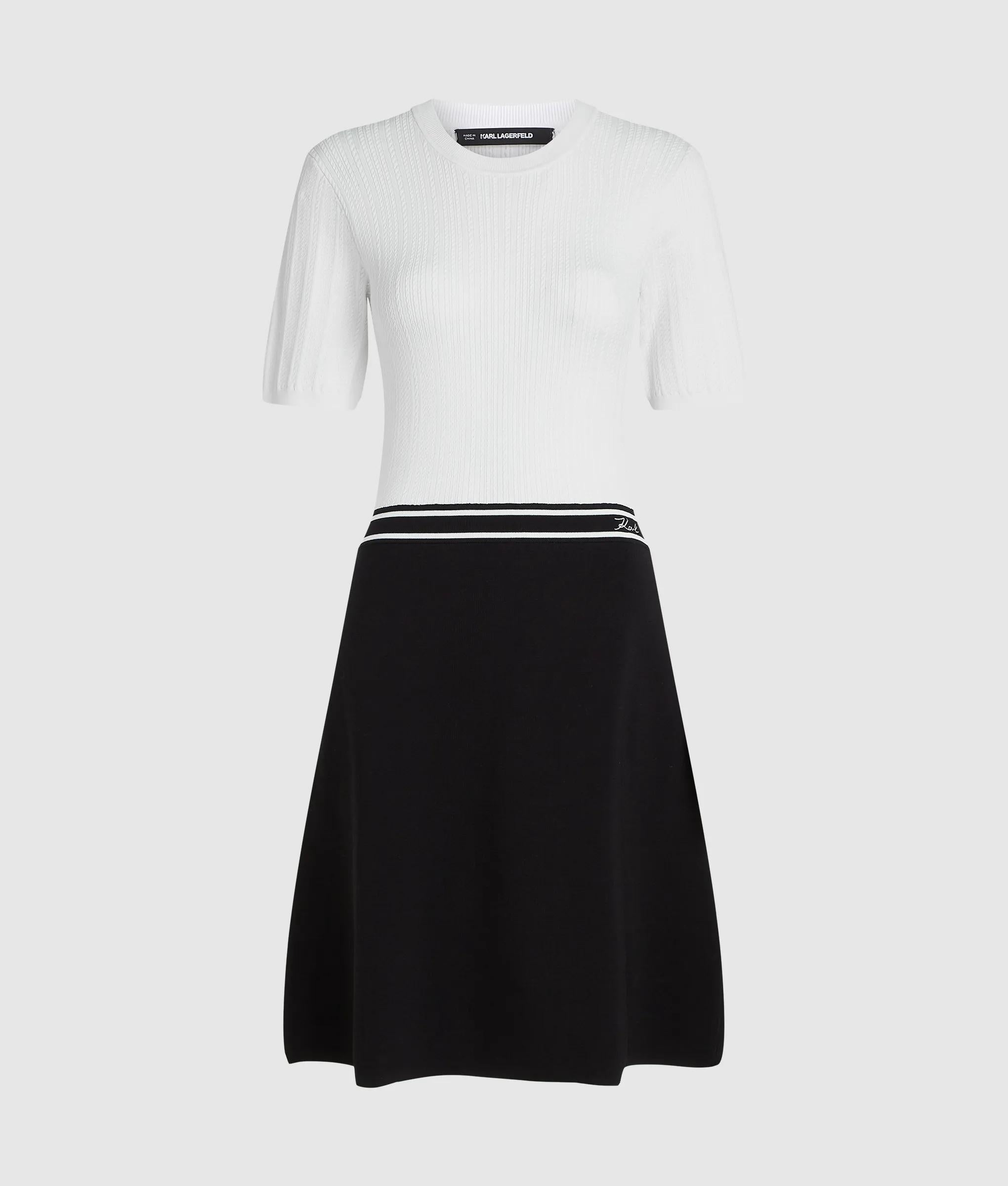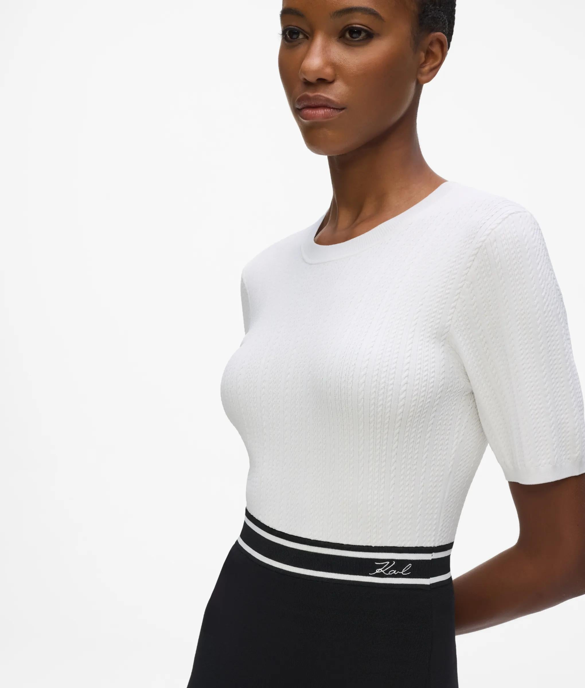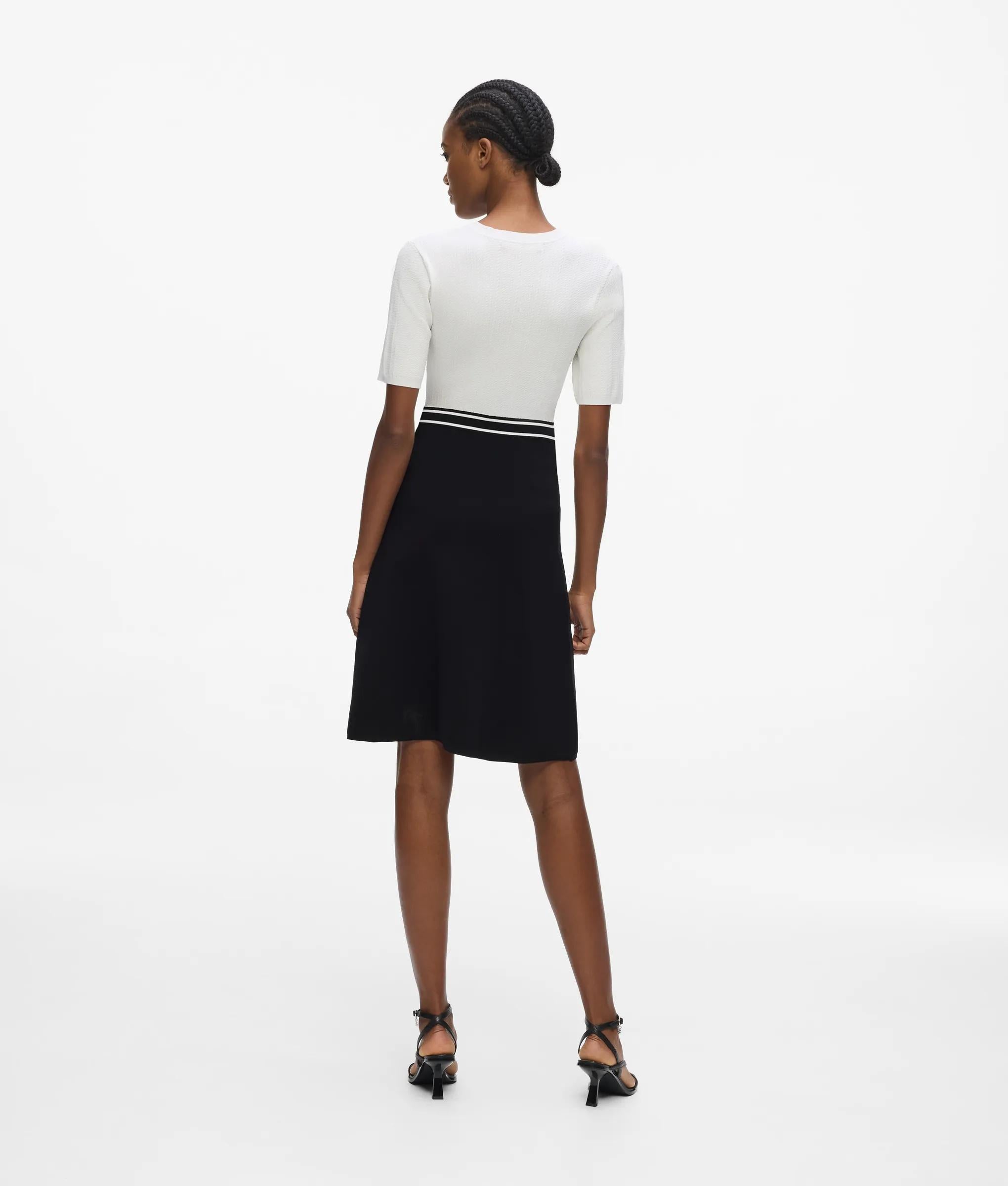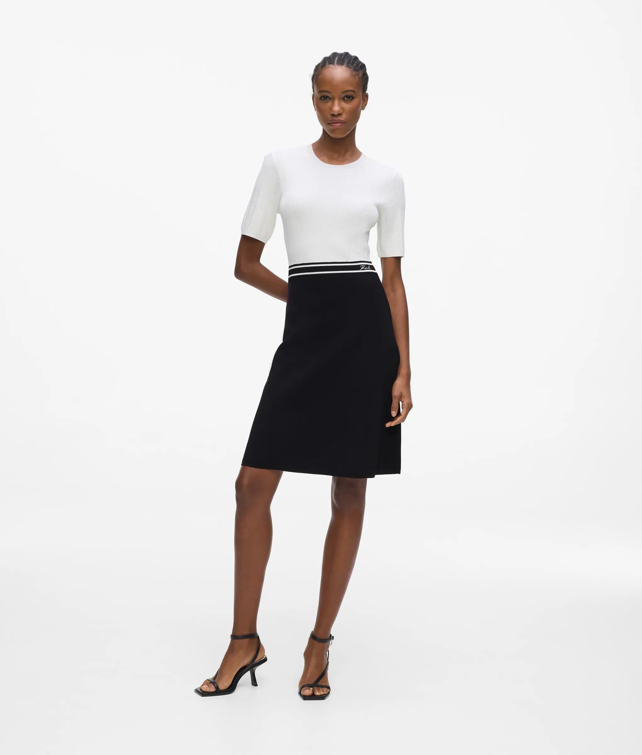 The softness of the braided knit fabric combines with the graphic contrast in this two-tone dress. The fitted design is defined by a striped elastic waistband with the unmistakable KARL LAGERFELD logo, balancing a sporty touch with Parisian sophistication.