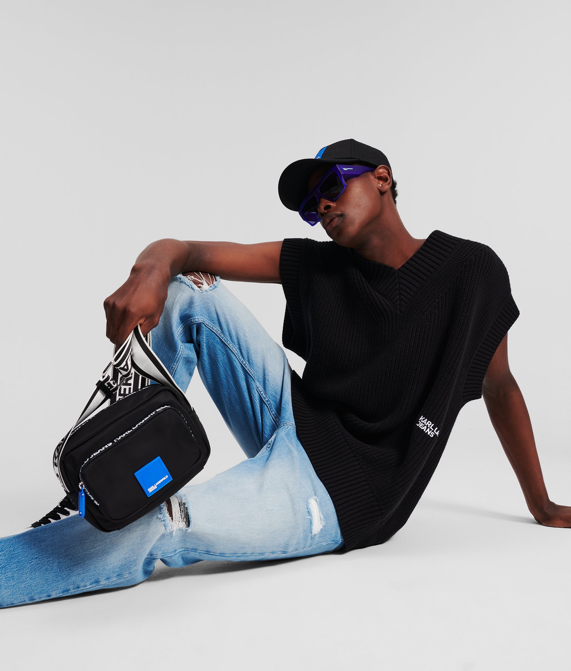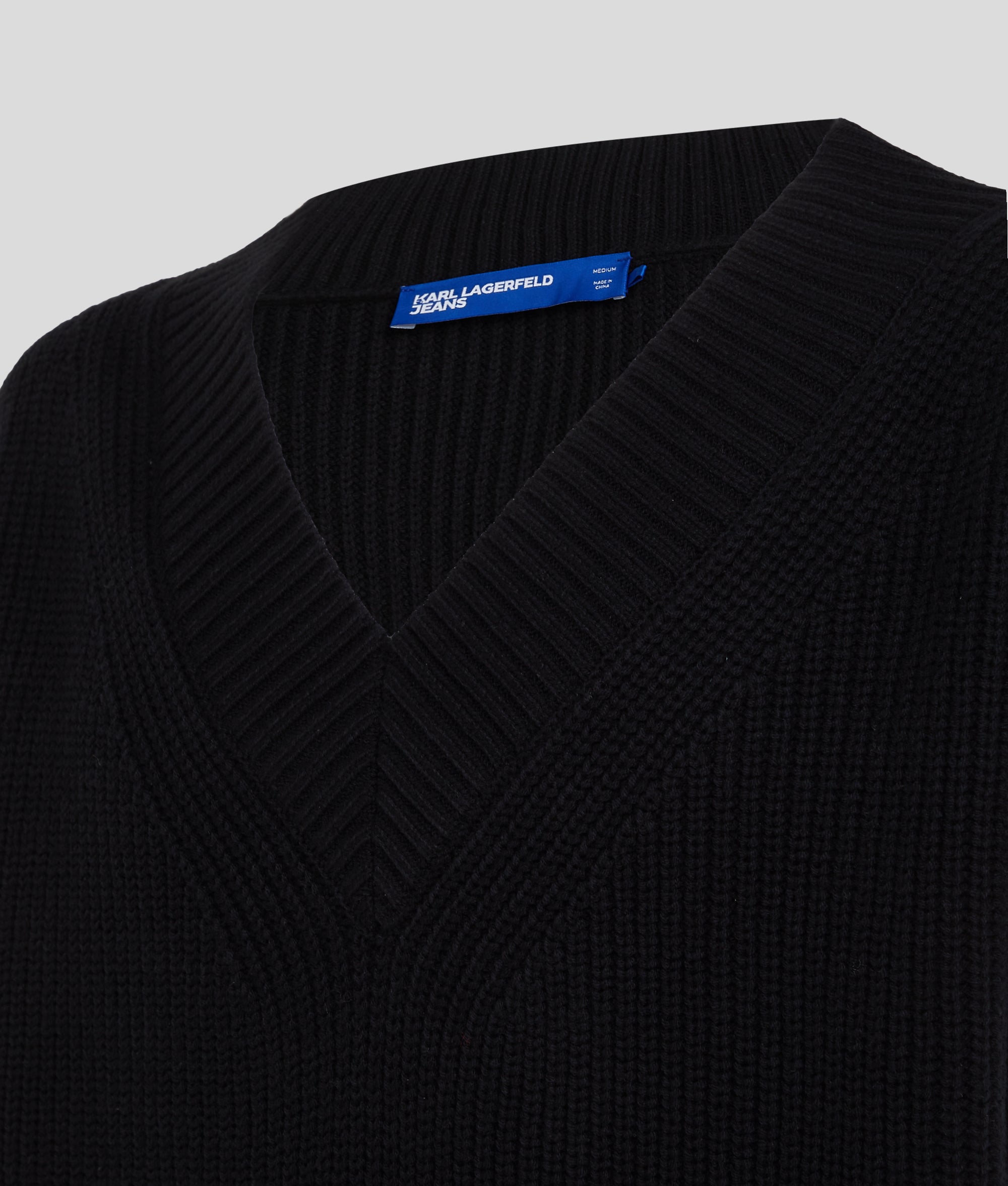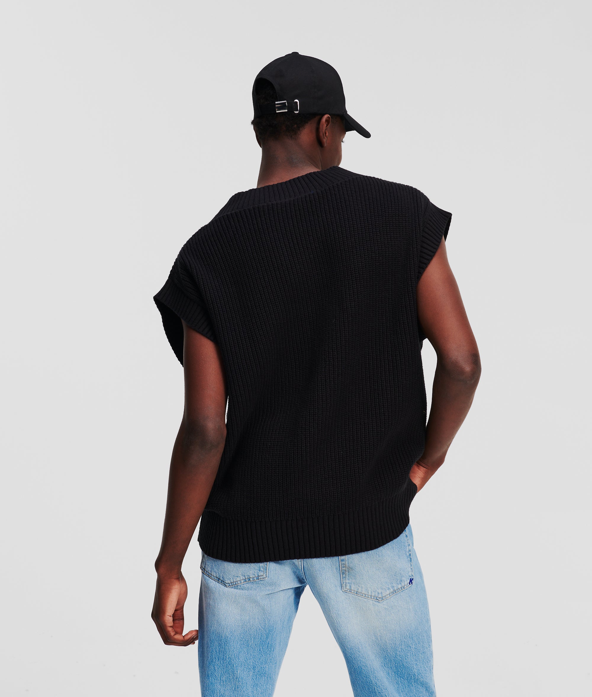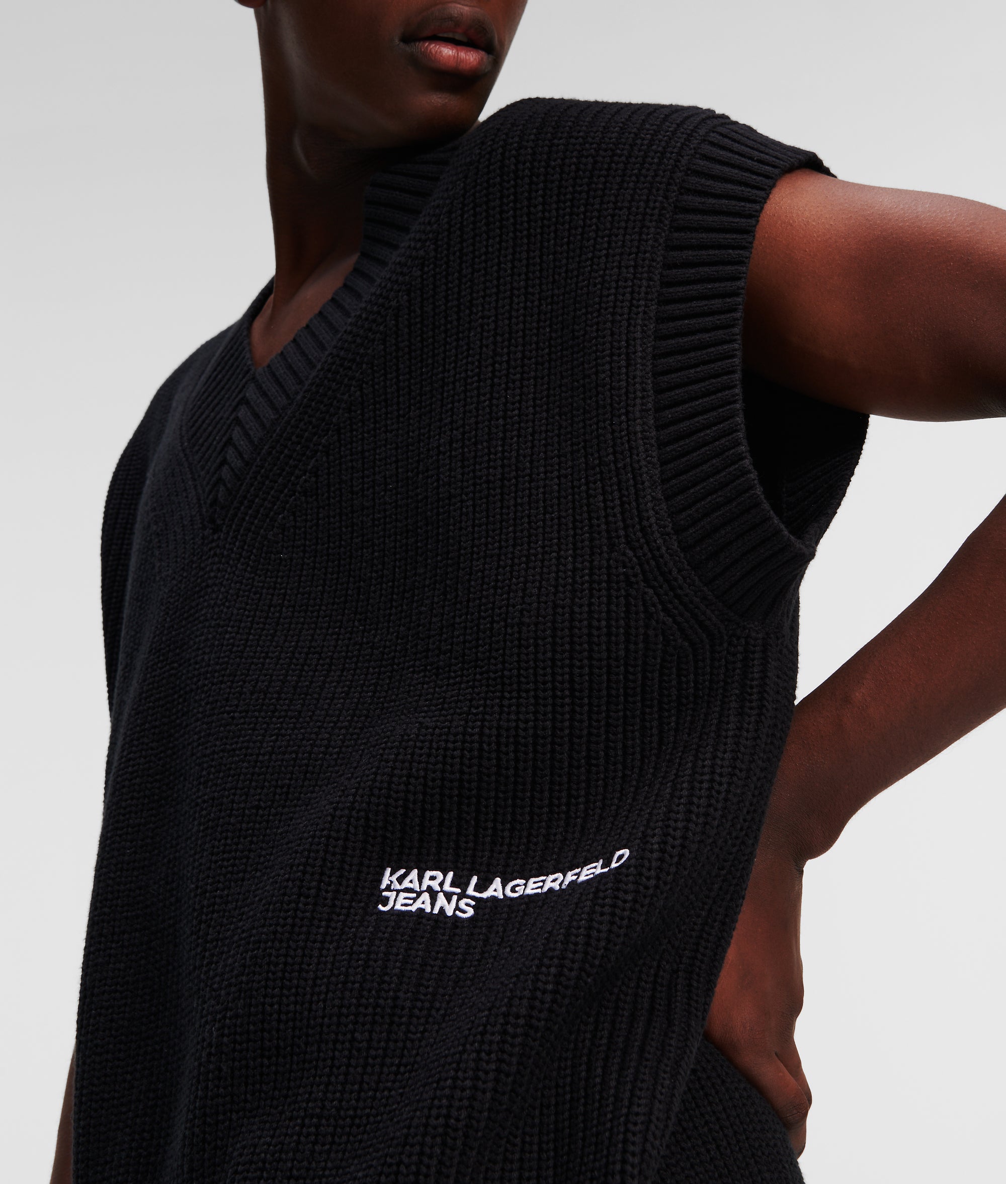 Embrace urban sophistication with this rib-knit vest offering an oversized silhouette, complemented by a preppy V-neck. KARL LAGERFELD JEANS embroidery adds a discrete yet iconic touch.