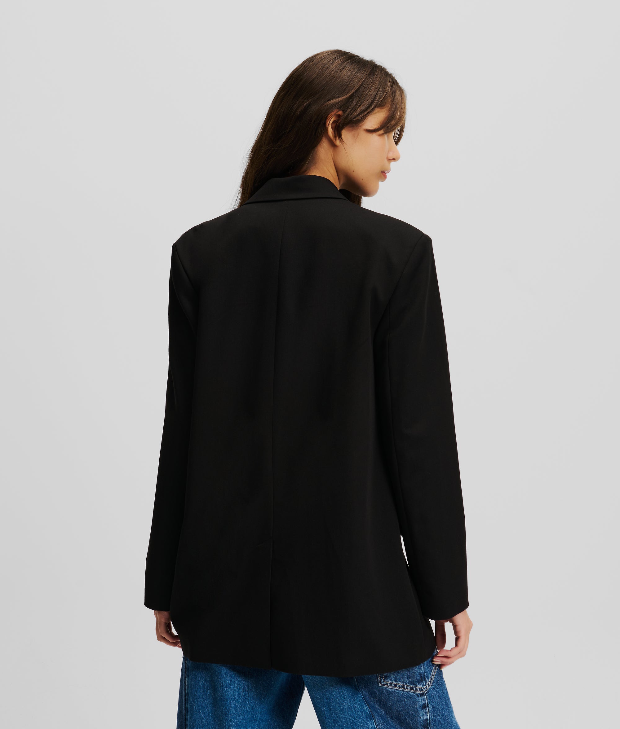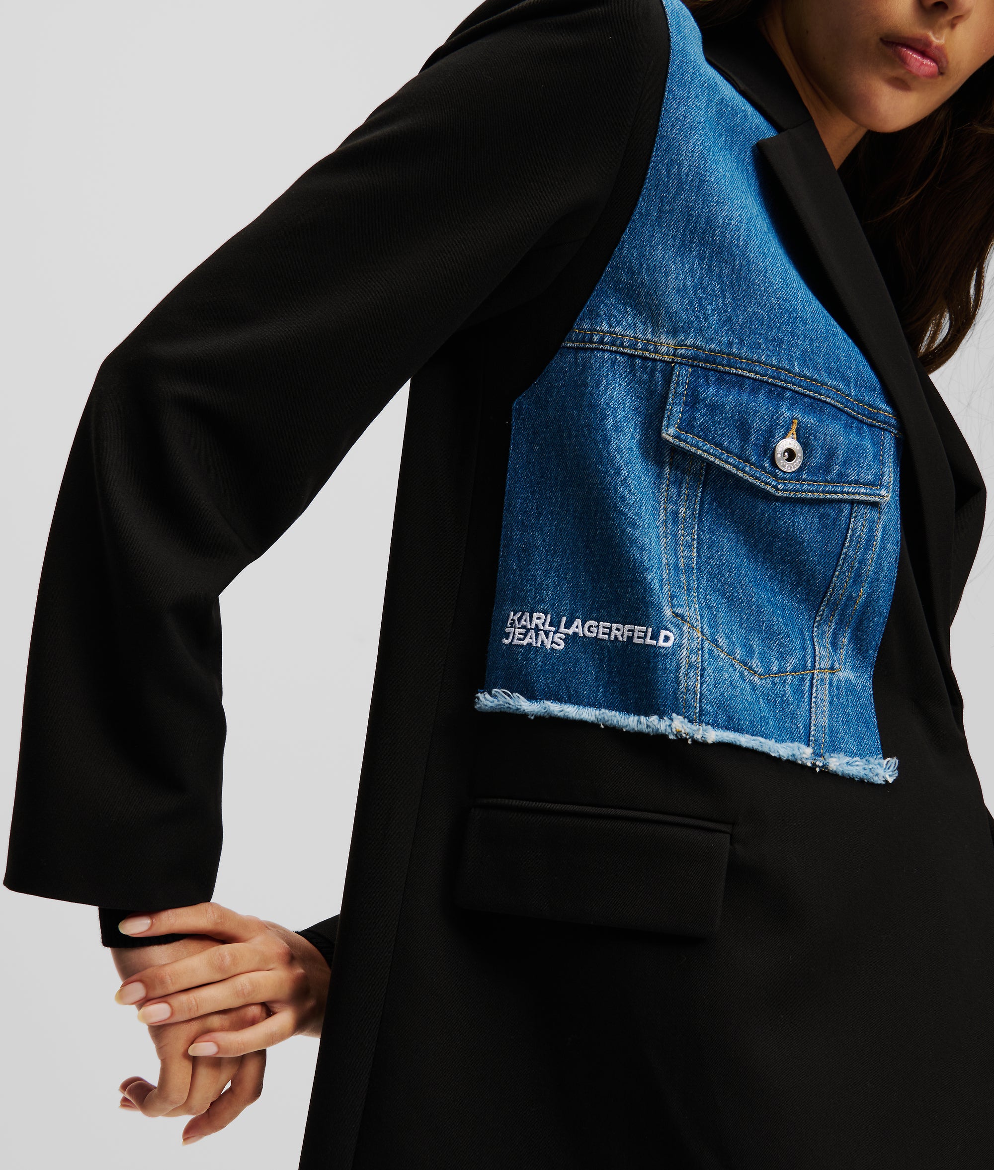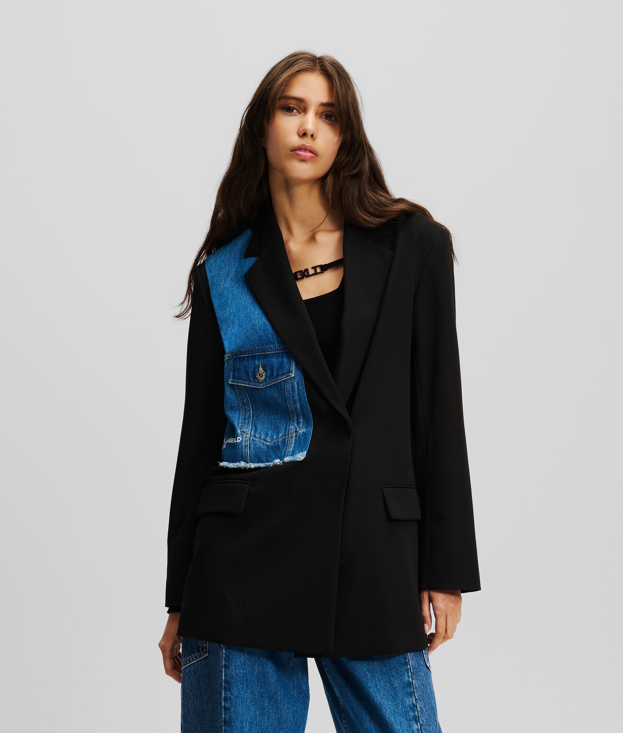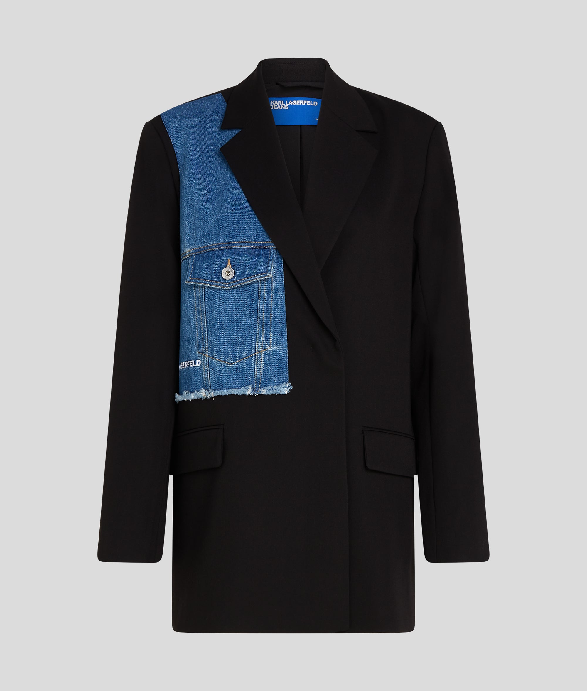 This denim jacket-inspired blazer from KARL LAGERFELD JEANS boasts a confident, double-breasted silhouette with branded buttons. Featuring a denim insert on the right chest and twin flap pockets, it's a unique addition to your wardrobe.