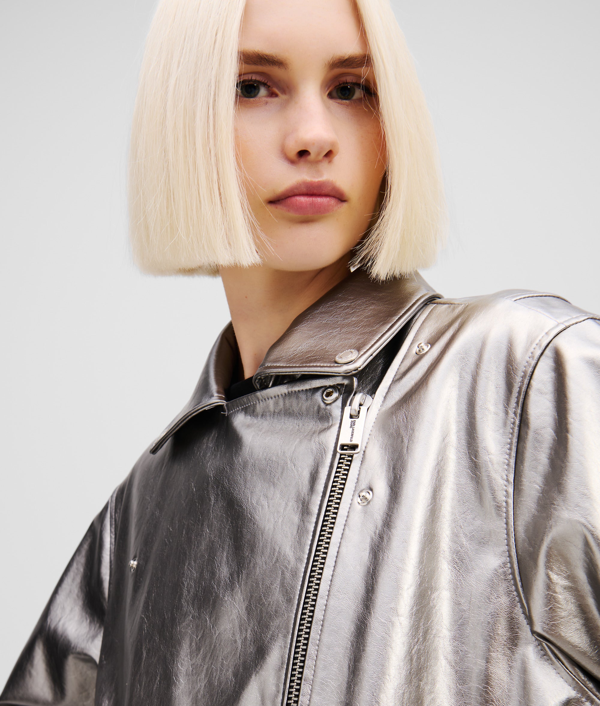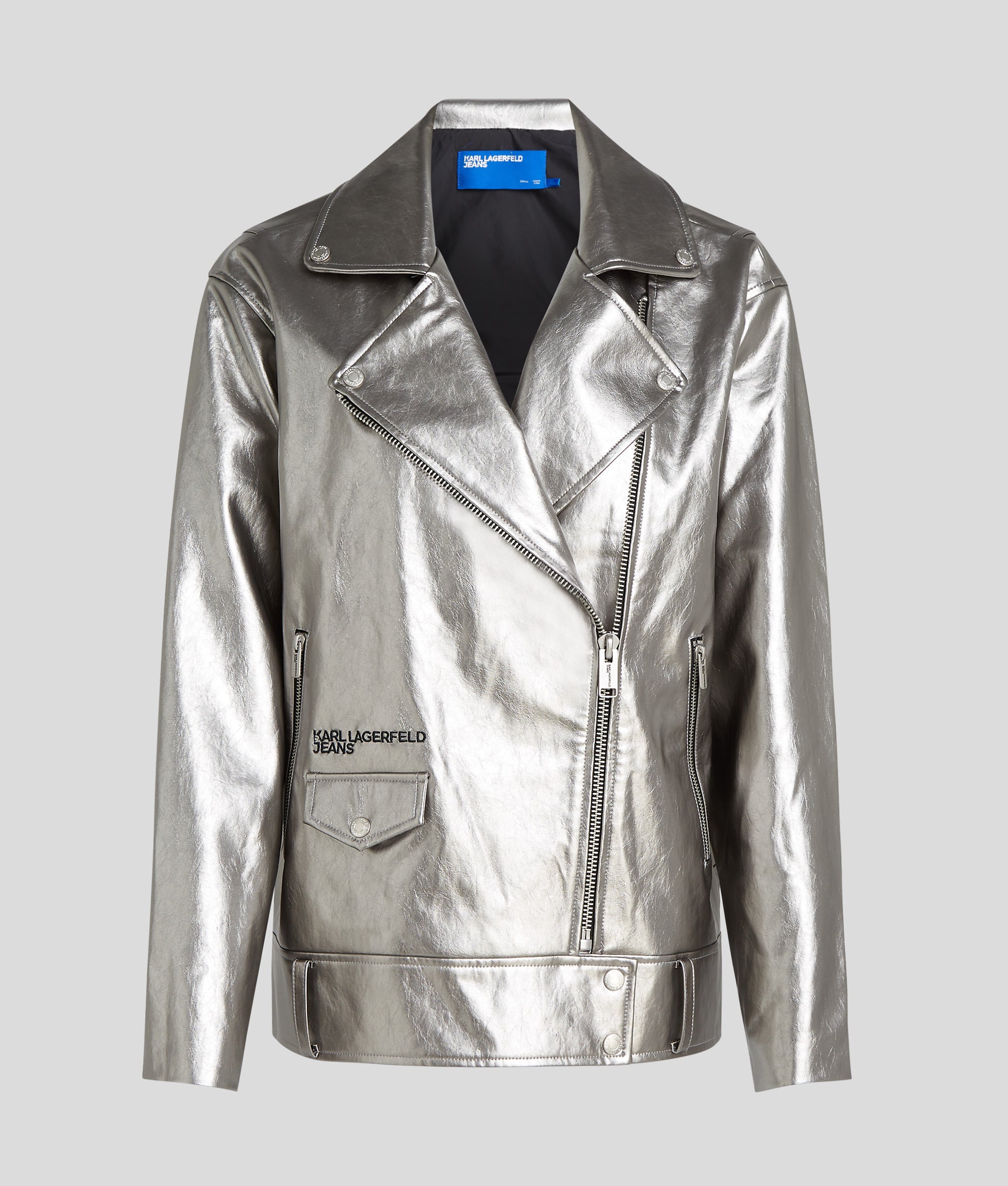 A statement high-shine finish and asymmetric zip-front closure feature on this bold biker-inspired jacket. KARL LAGERFELD JEANS branded hardware adds further individuality to this reimagined outerwear classic.