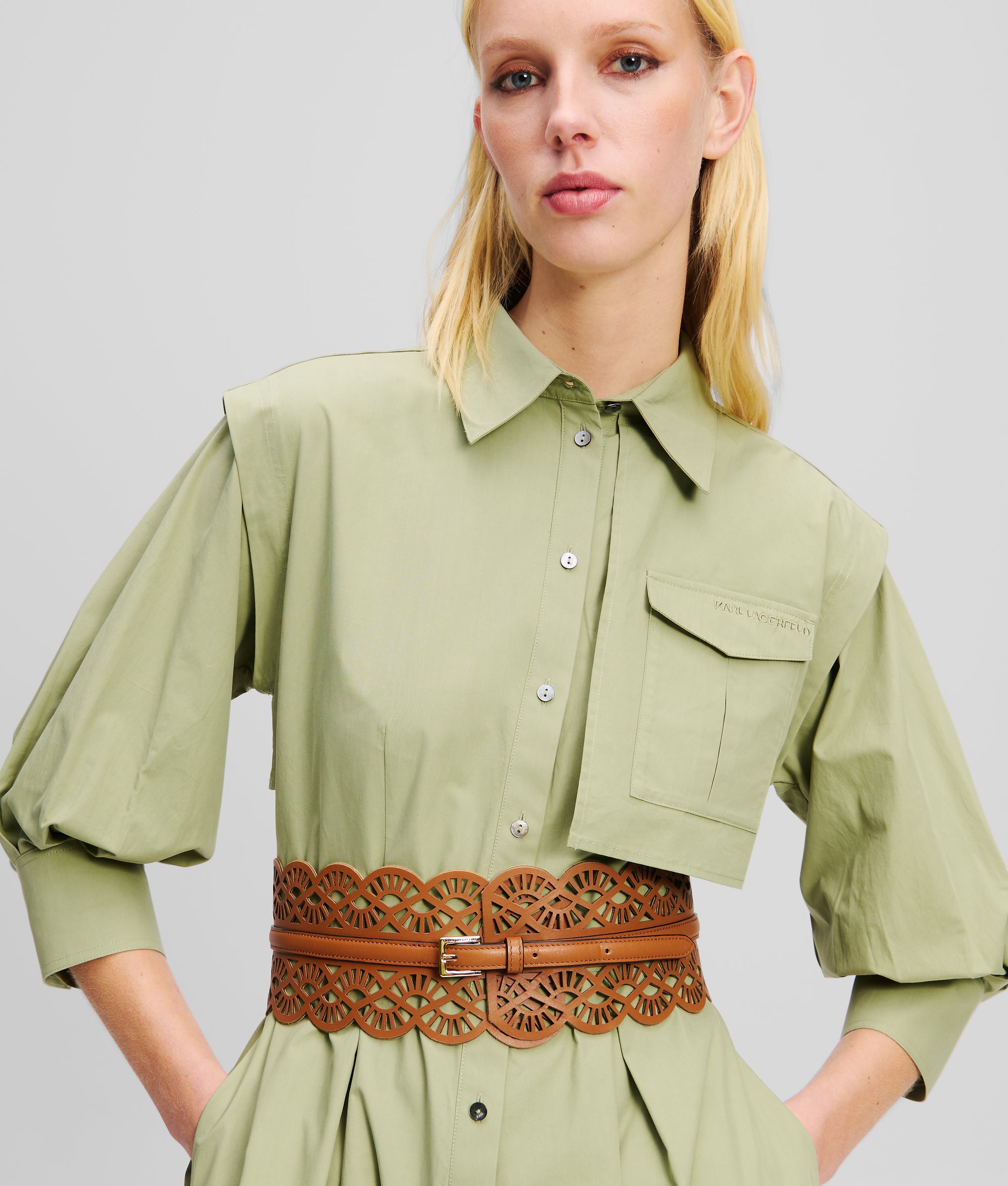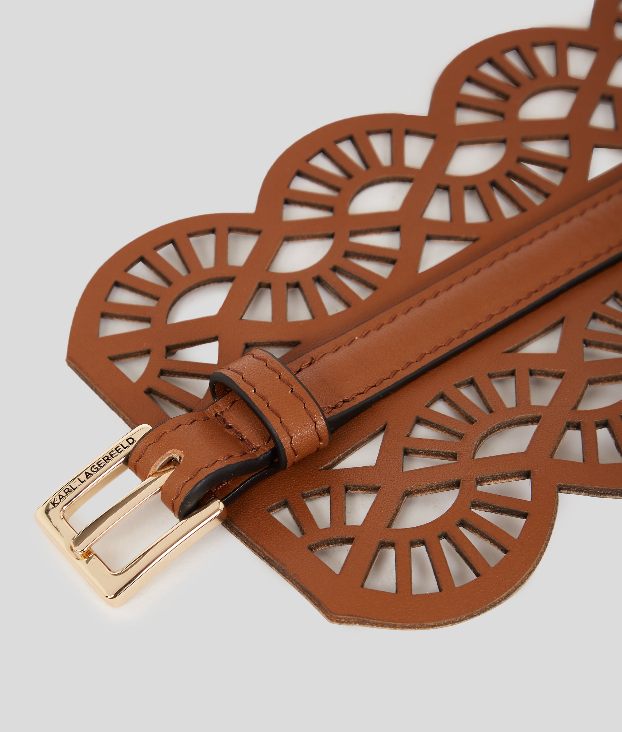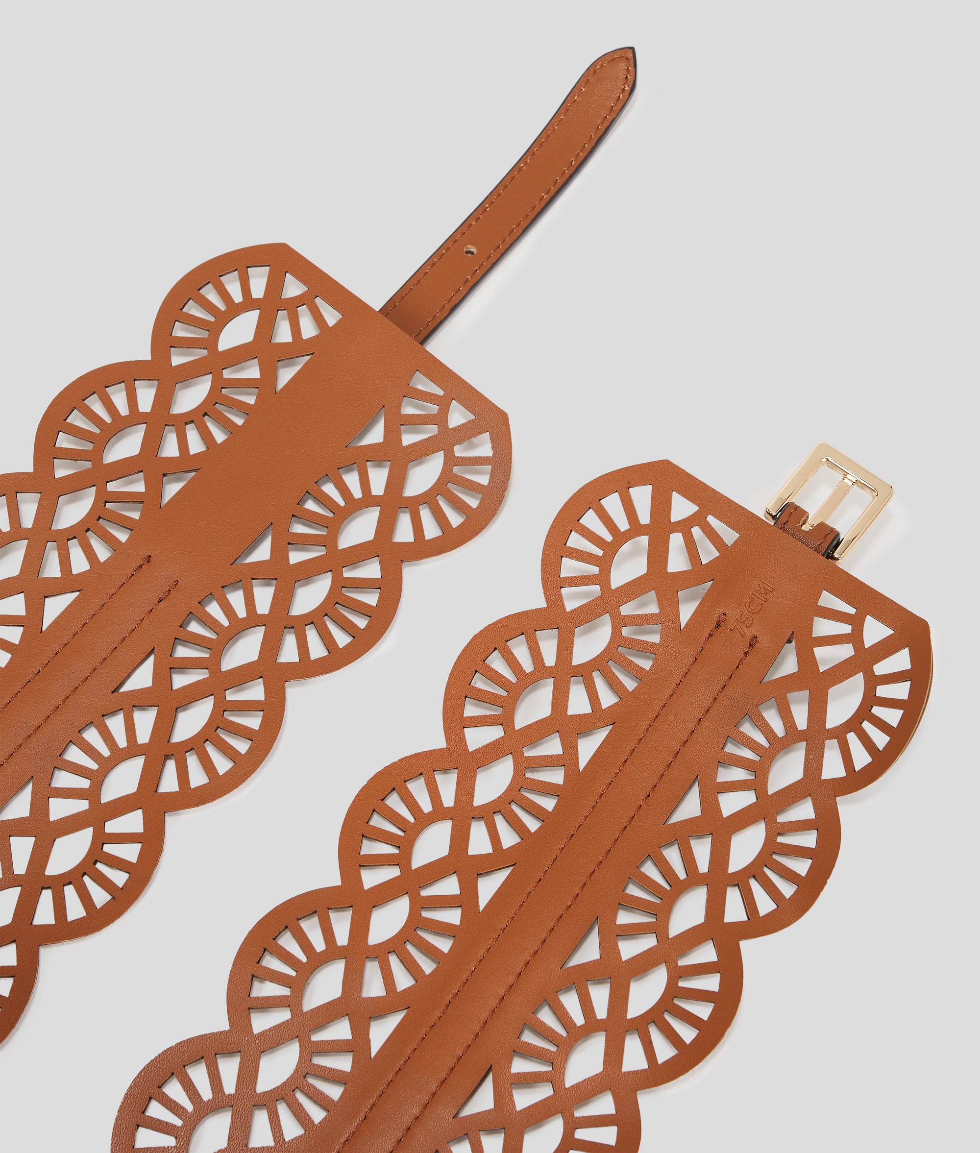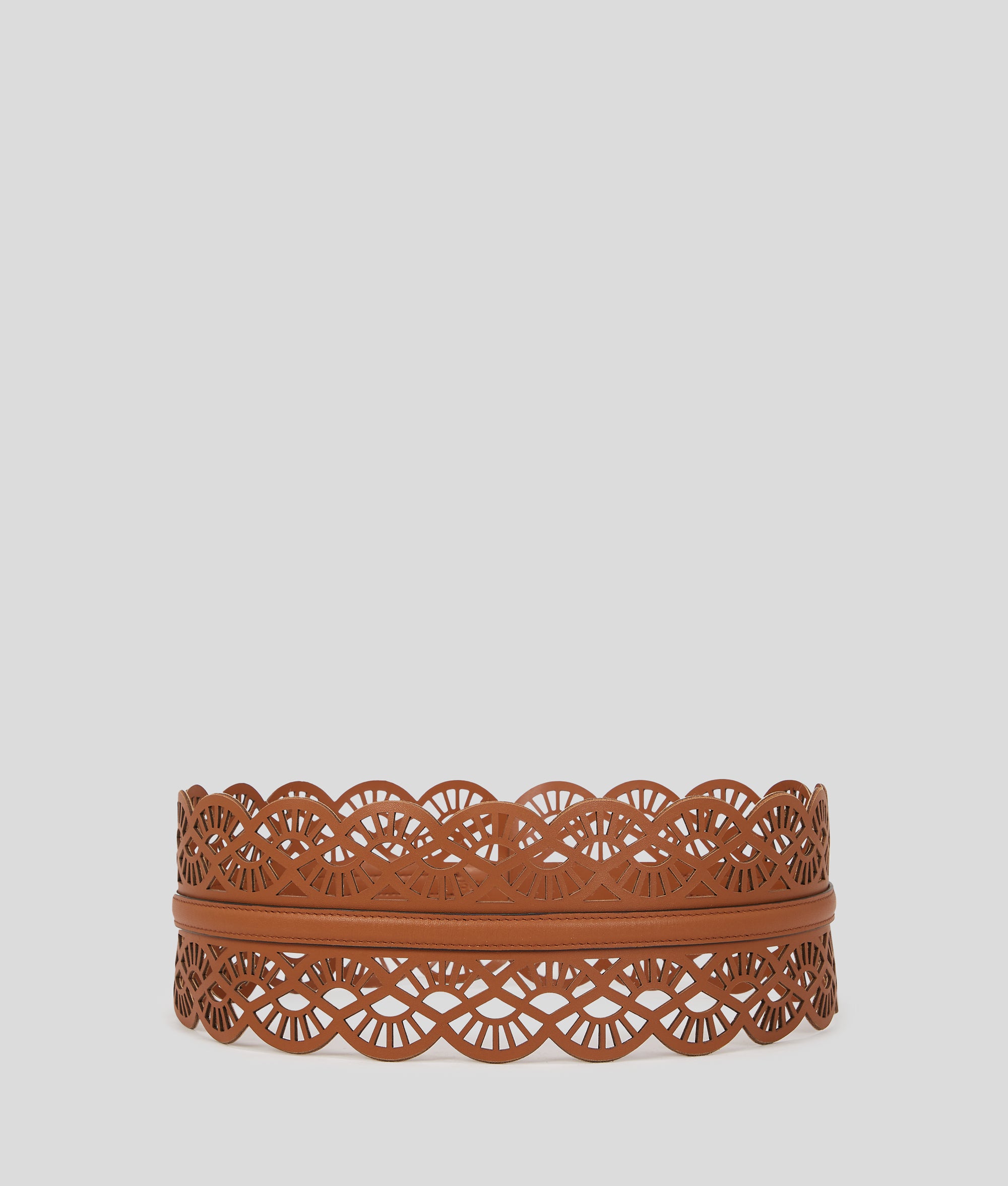 A striking finishing touch to any ensemble, this ultra-wide waist belt features a laser-cut fan design, introducing texture and intrigue on every occasion.