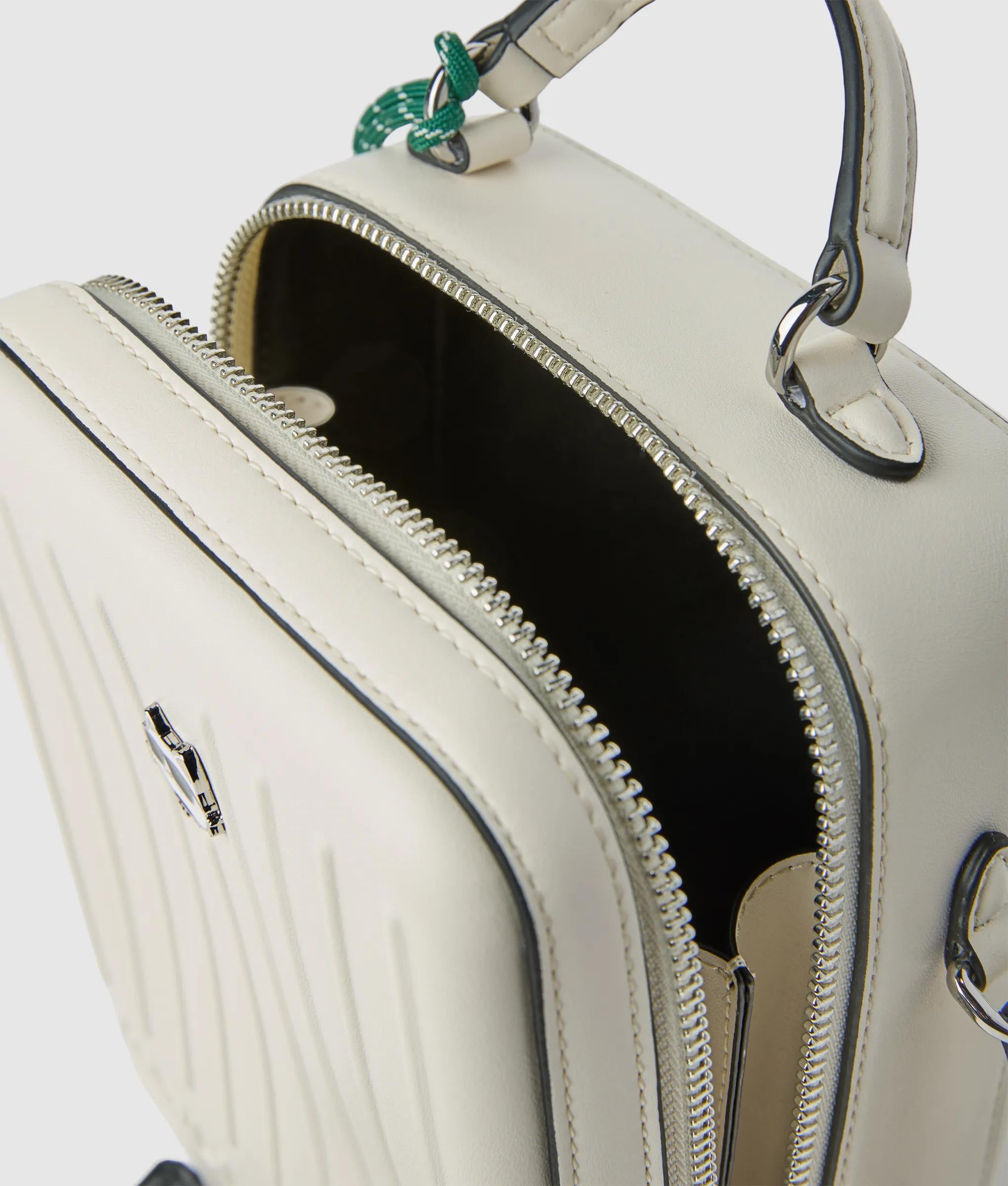 The perfect travel companion, this structured crossbody bag is shaped as a suitcase with zip pulls inspired by a padlock and key. A charming Ikon Choupette motif completes the playful piece.
