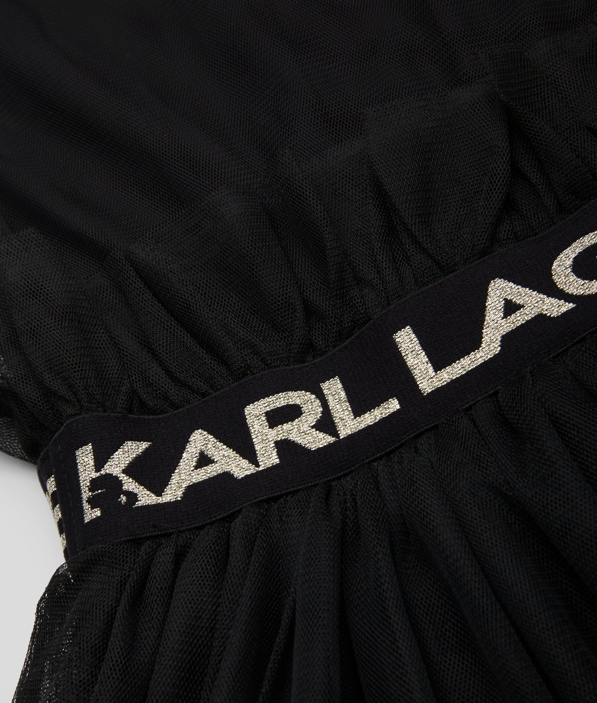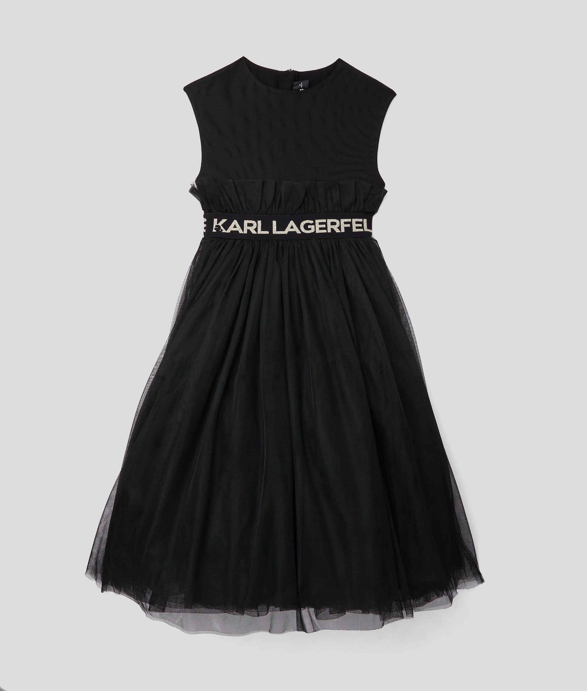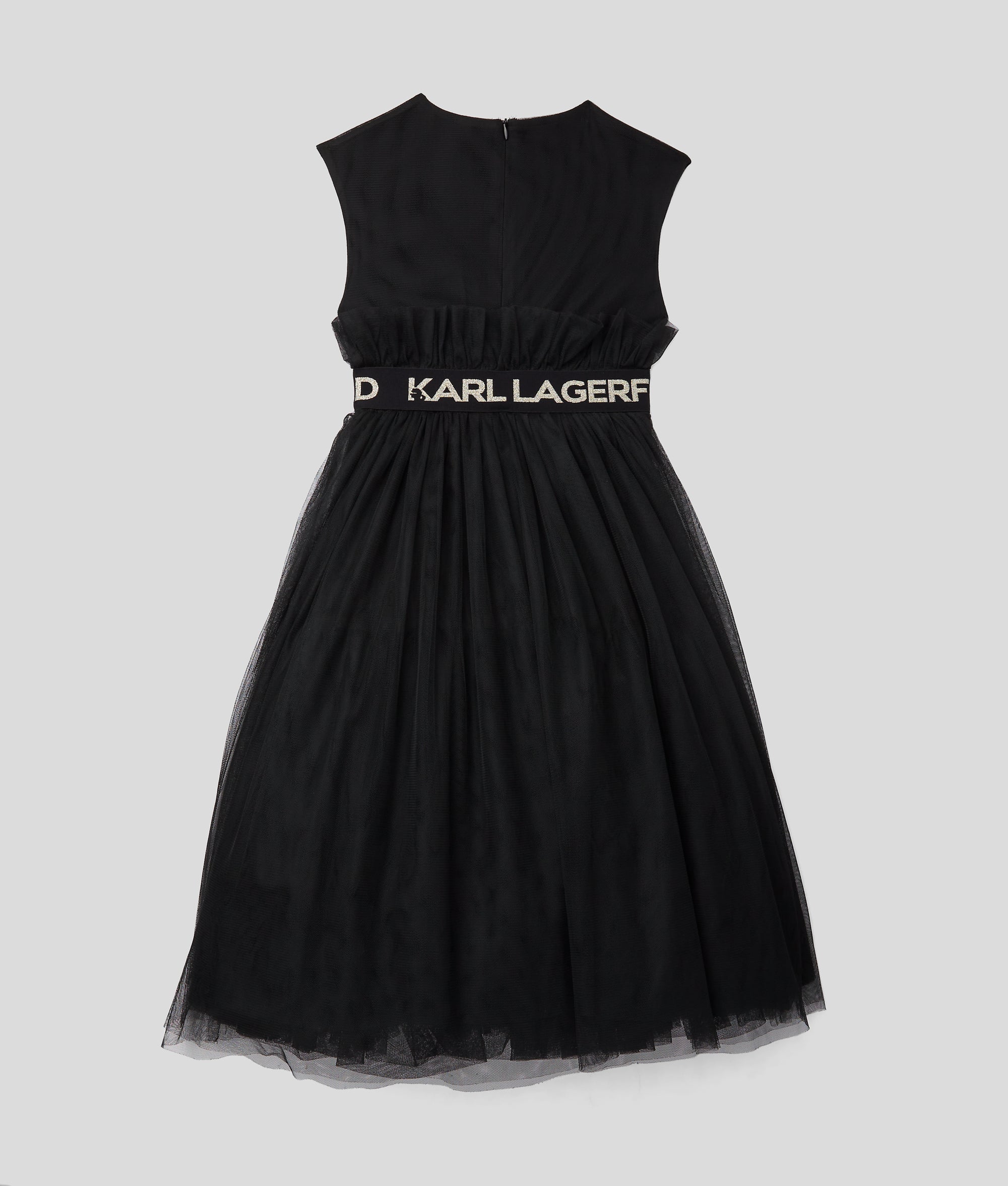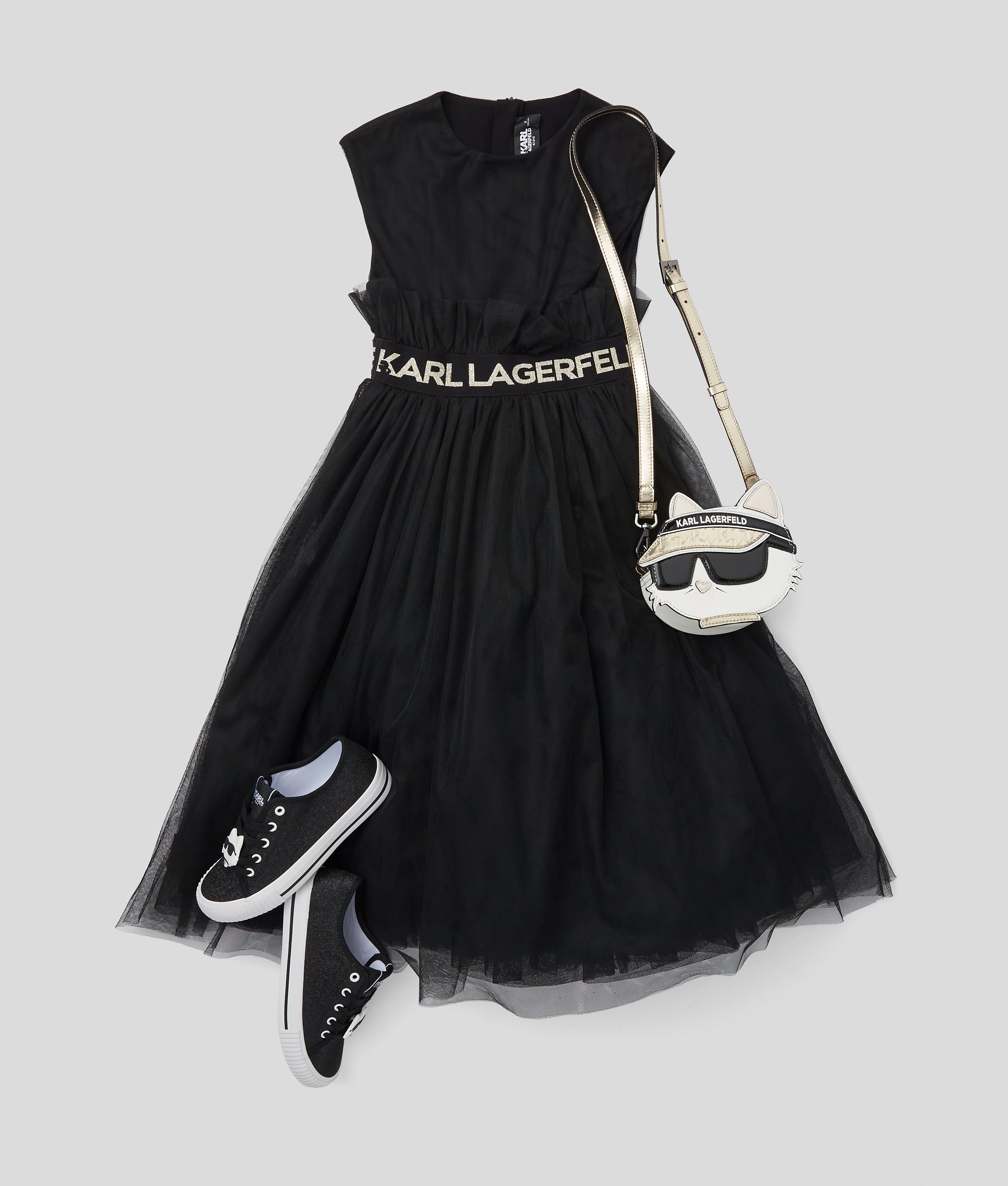 This playful party dress features a voluminous A-line skirt that twirls with every move. The zip fastening at the back ensures easy dressing, while the KARL LAGERFELD logo tape waistband adds statement style.