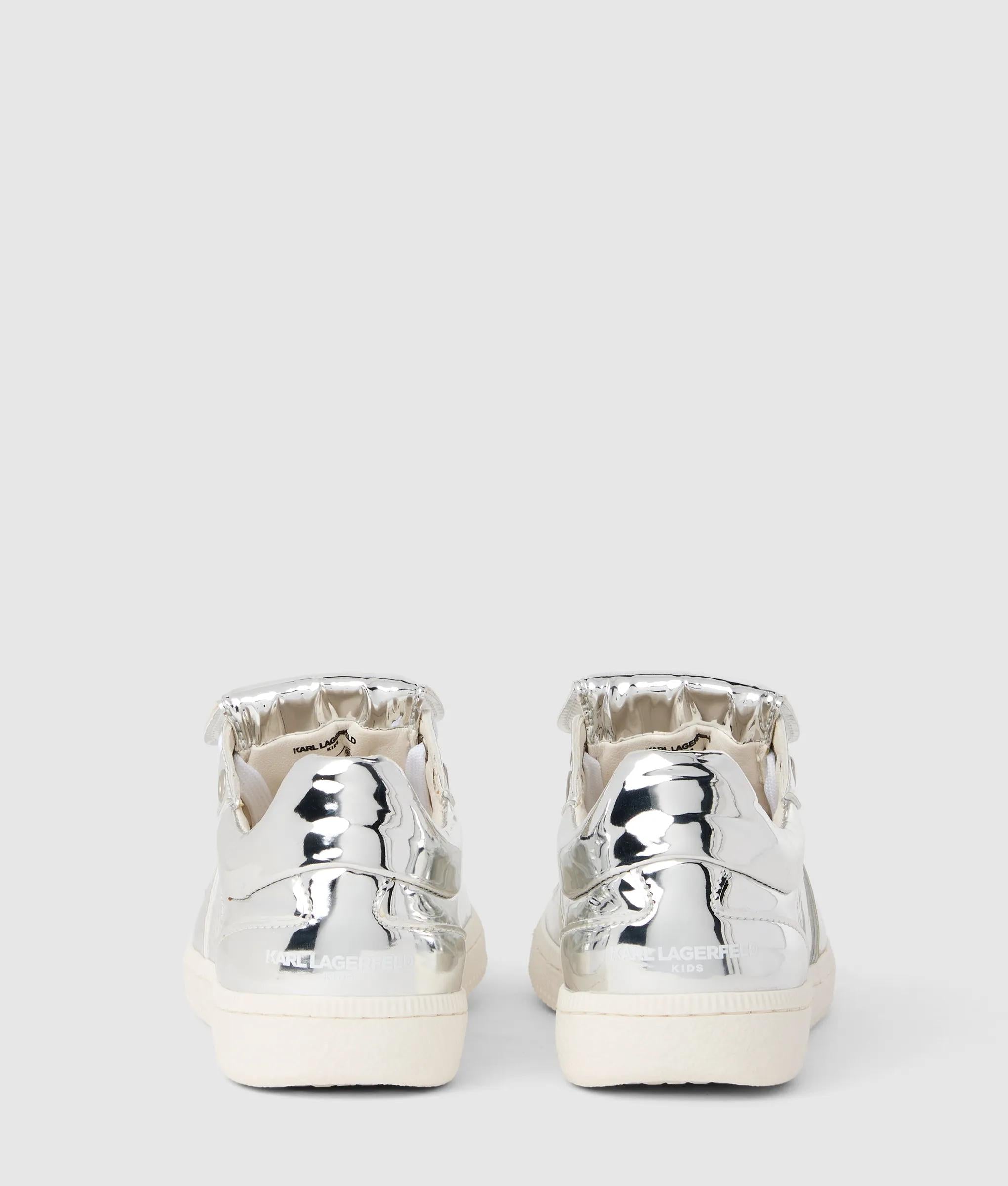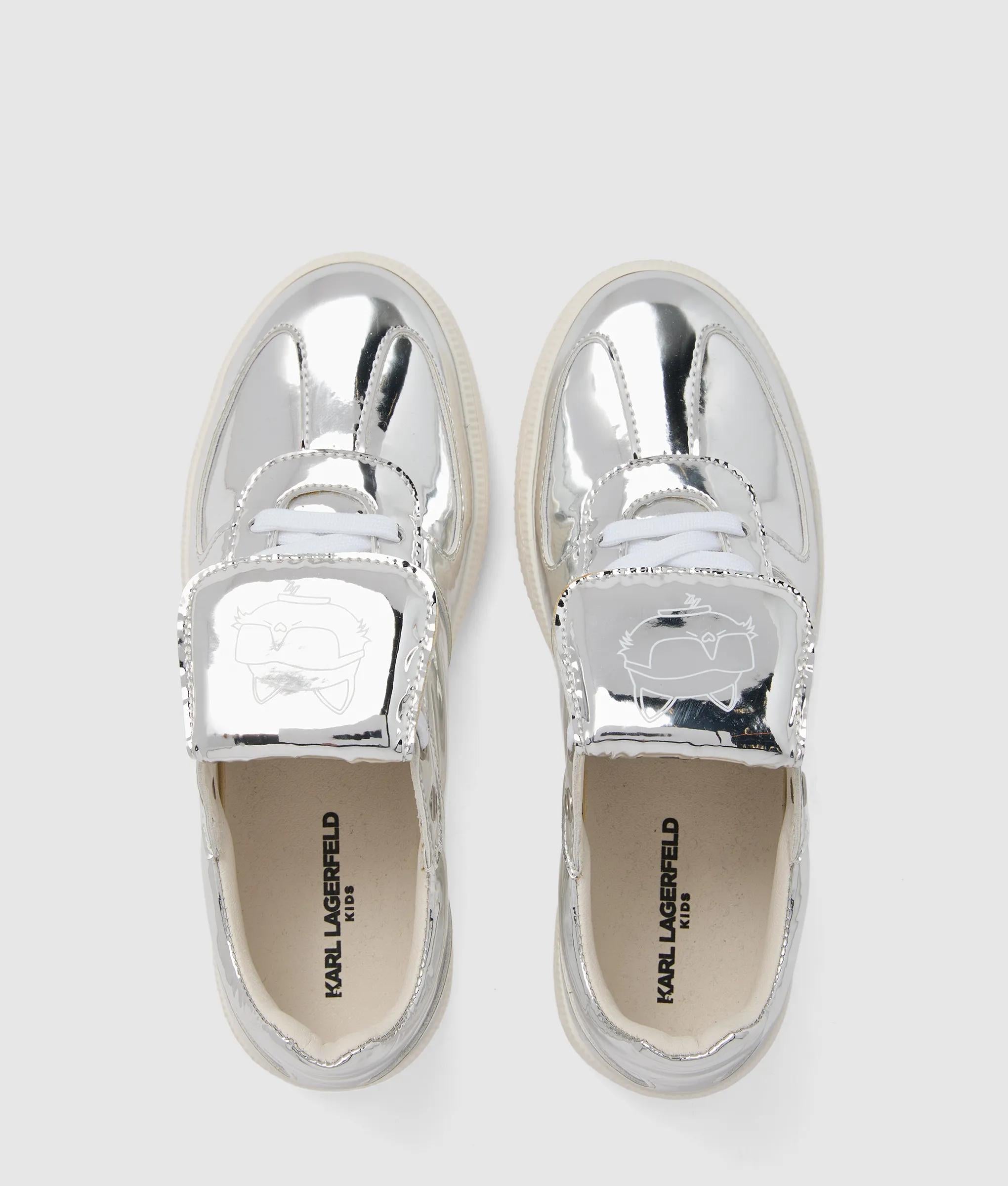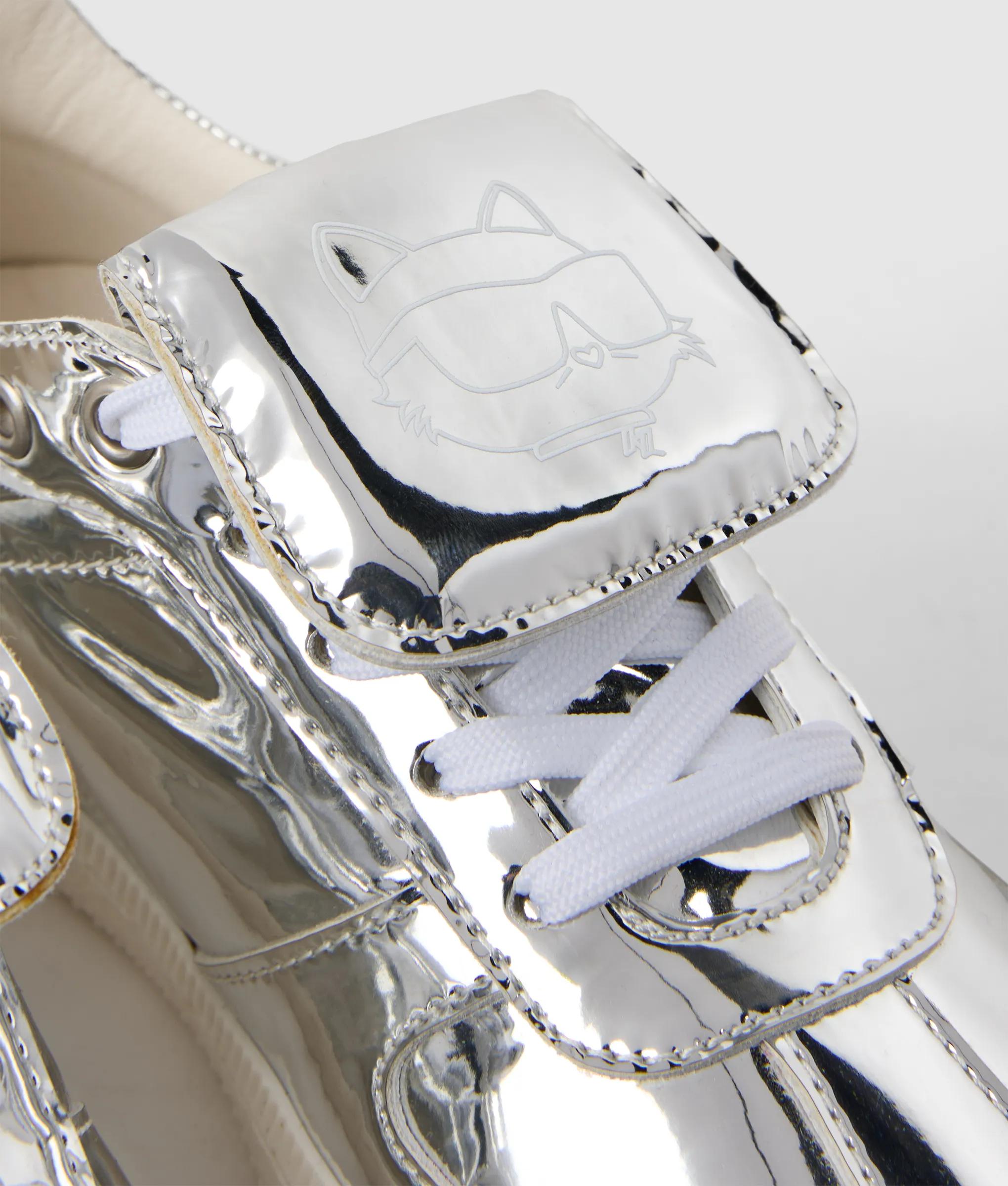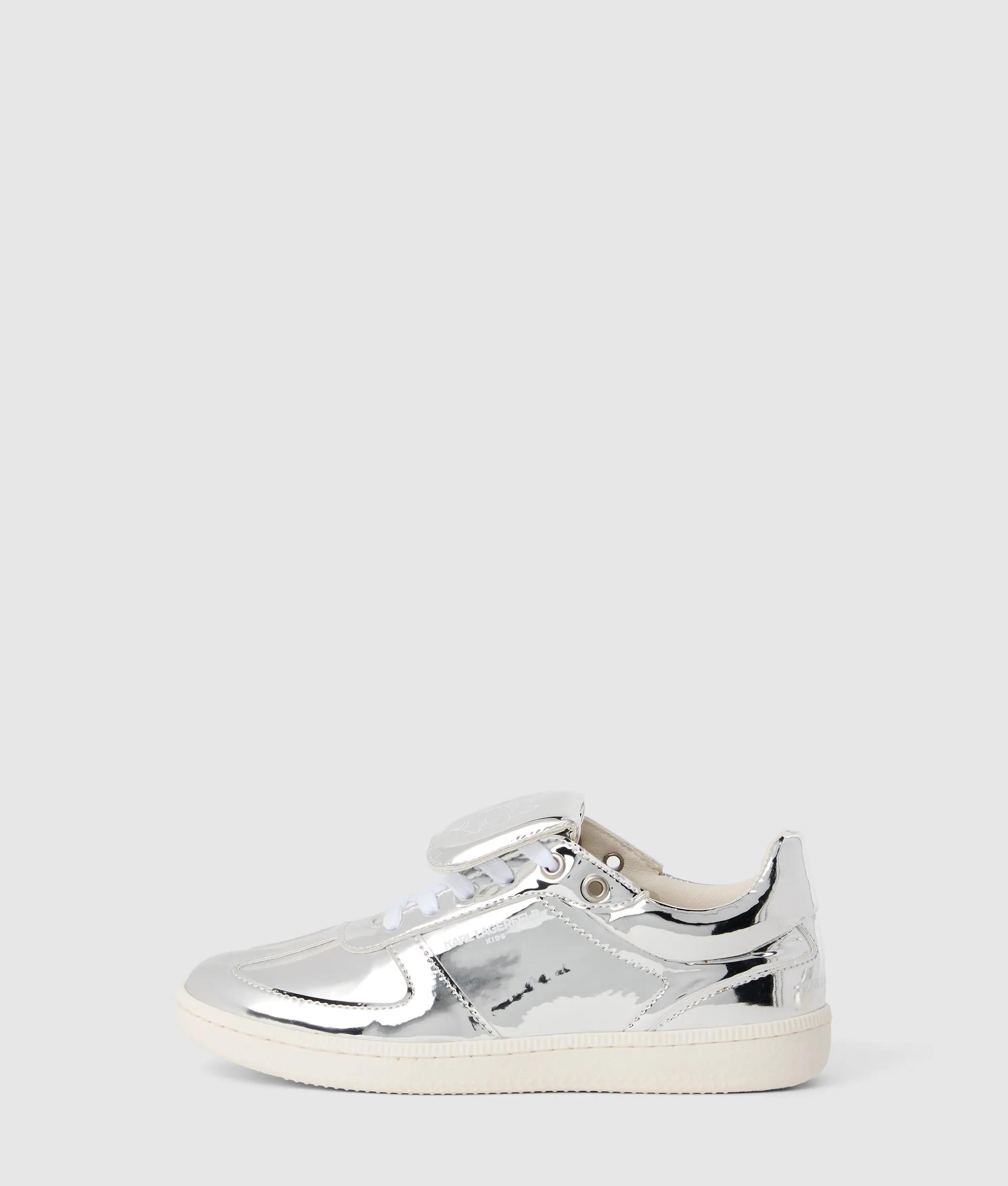 These low-top silver sneakers shine with a mirror-effect fabrication, delivering standout impact from the ground up.