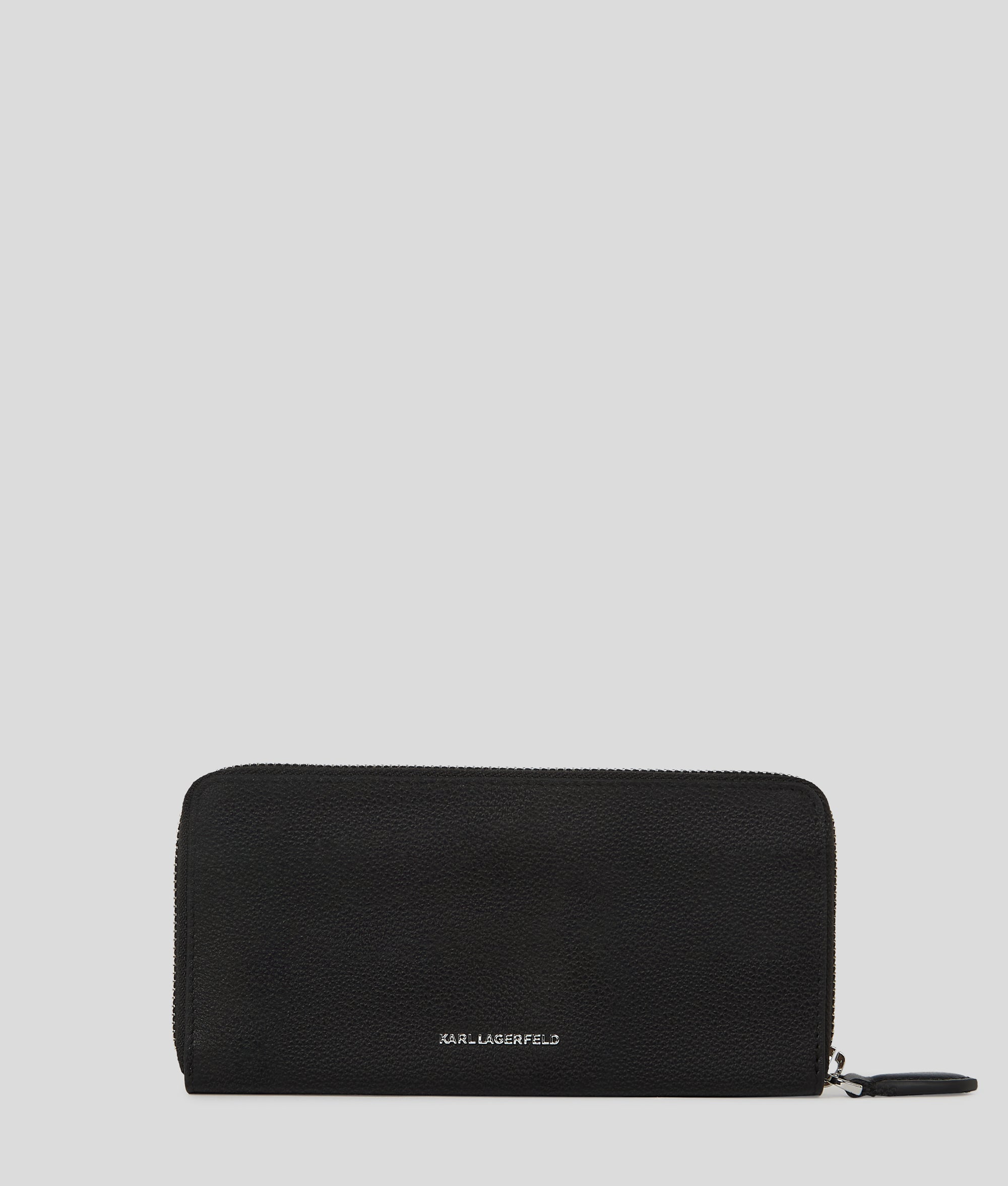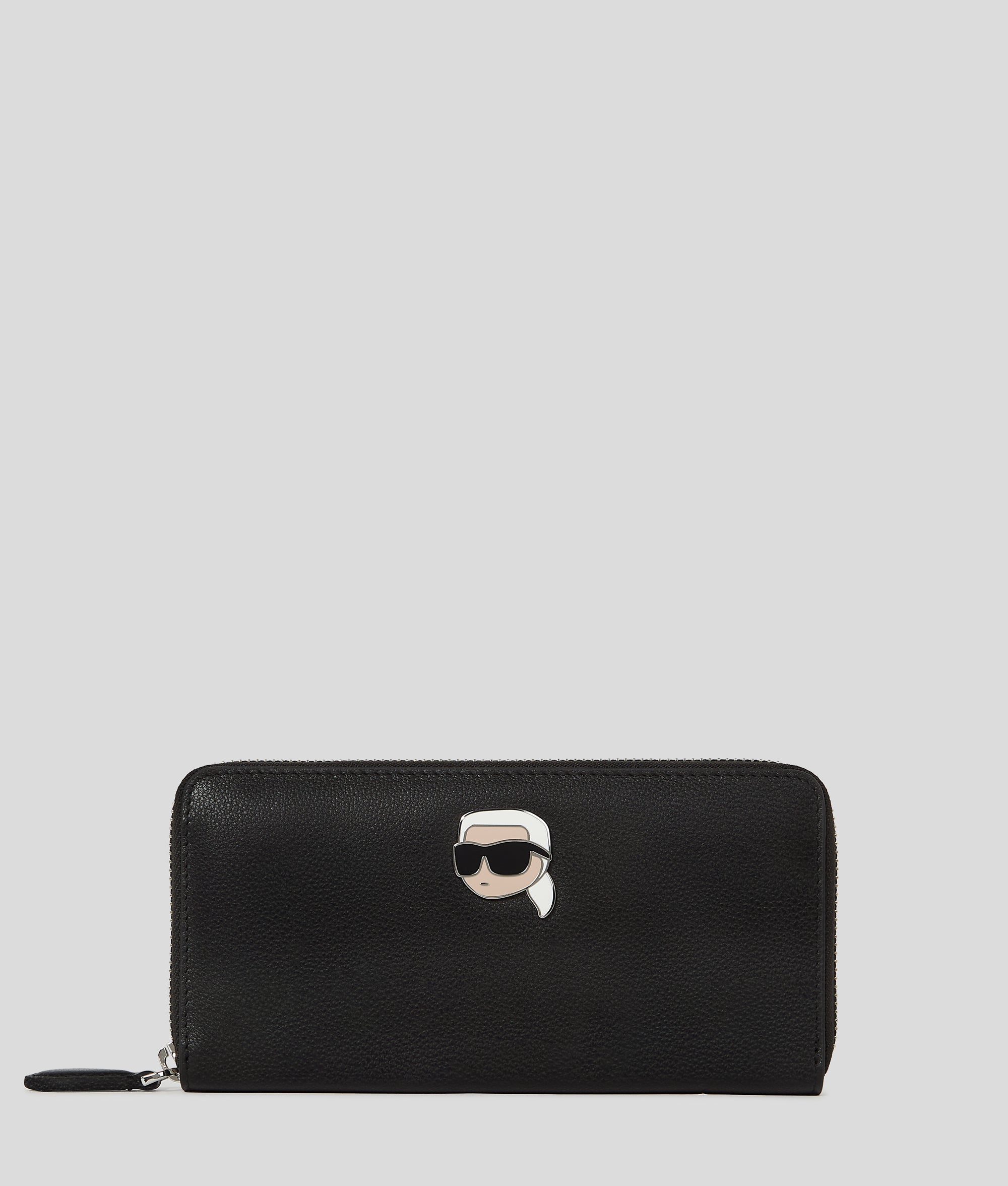 This wallet features a spacious design, perfect for organizing daily essentials. A zip-around closure reveals multiple compartments, while playful IKON Karl hardware adds a unique touch. The distinctive pebble finish enhances its charm.