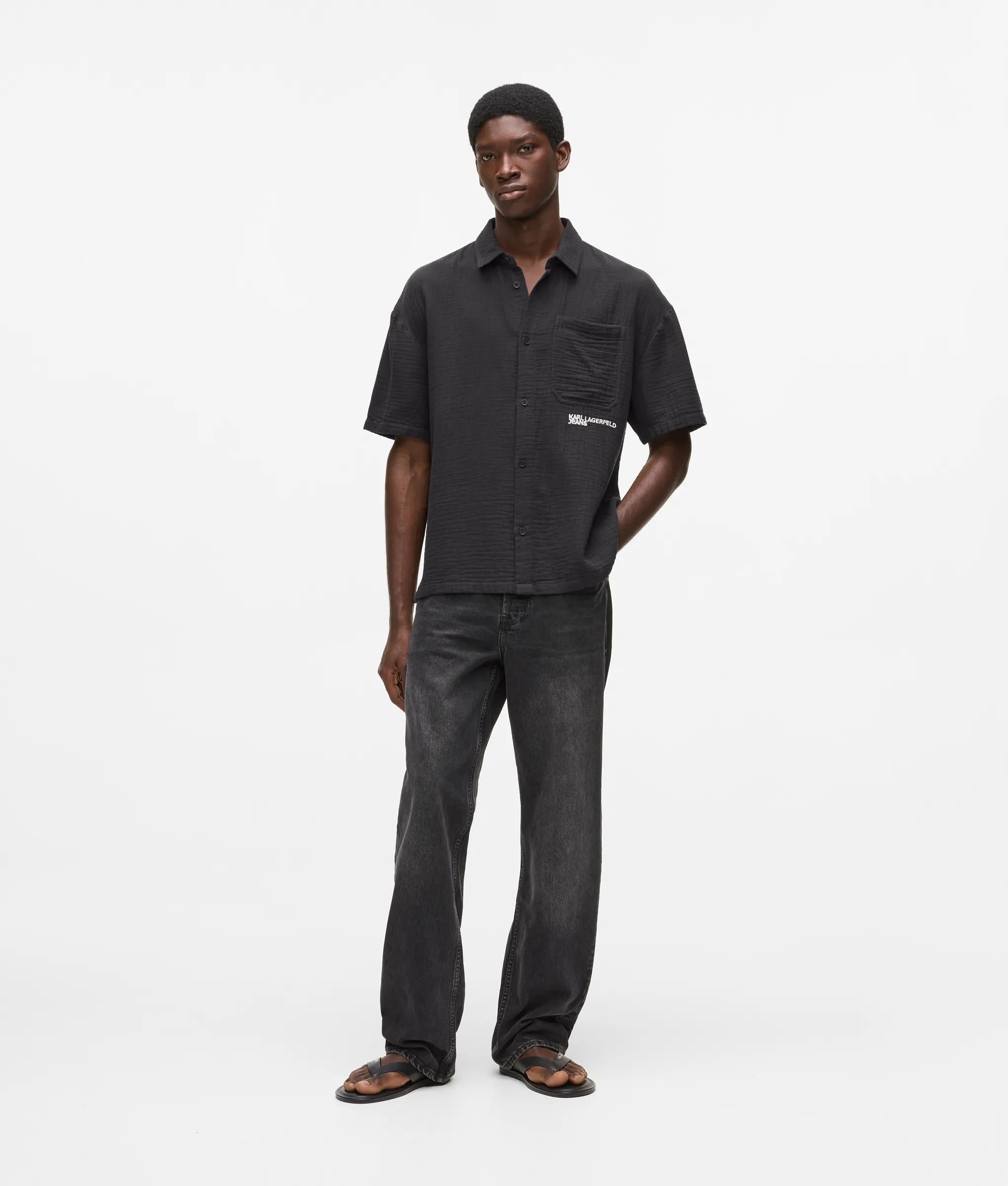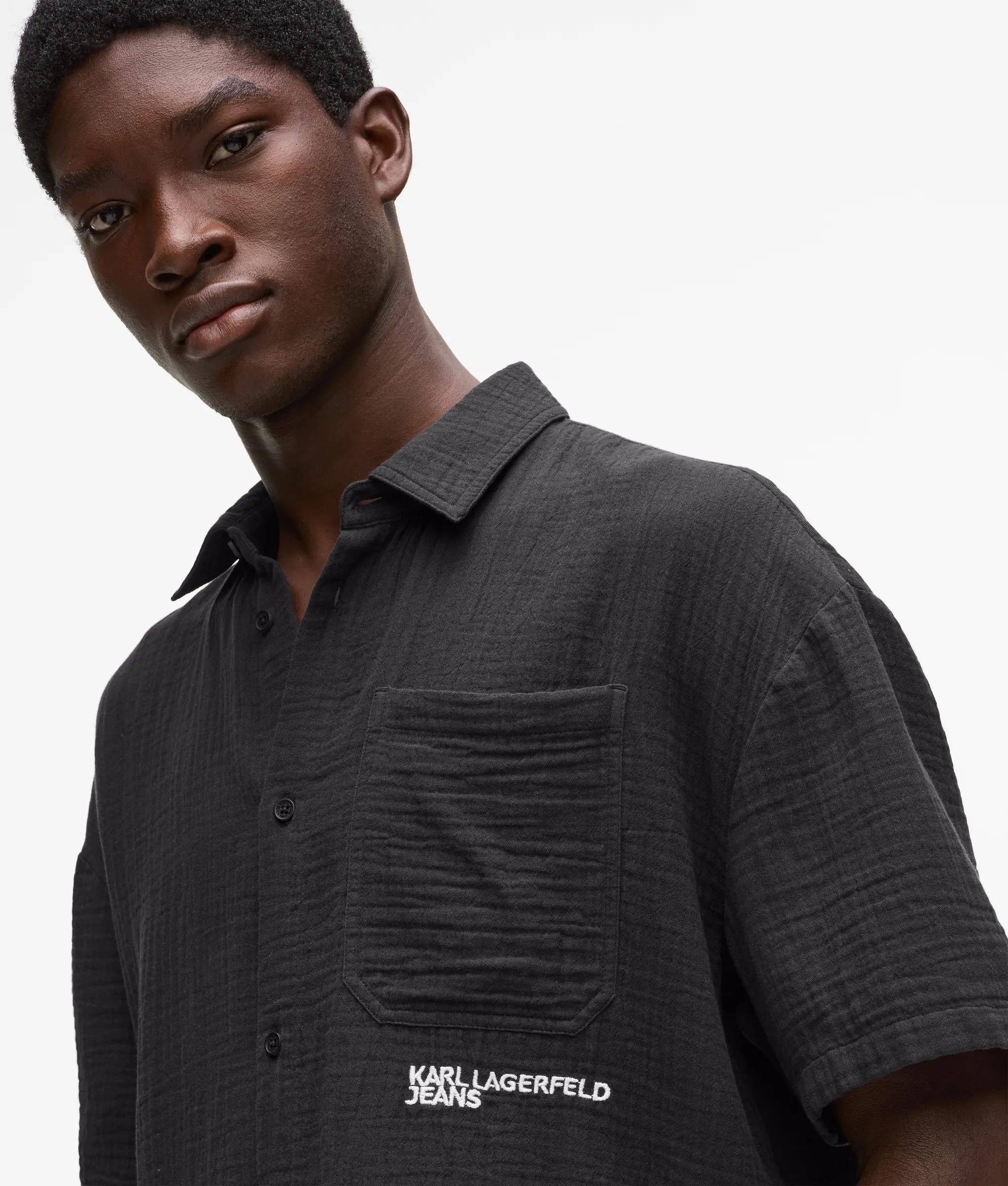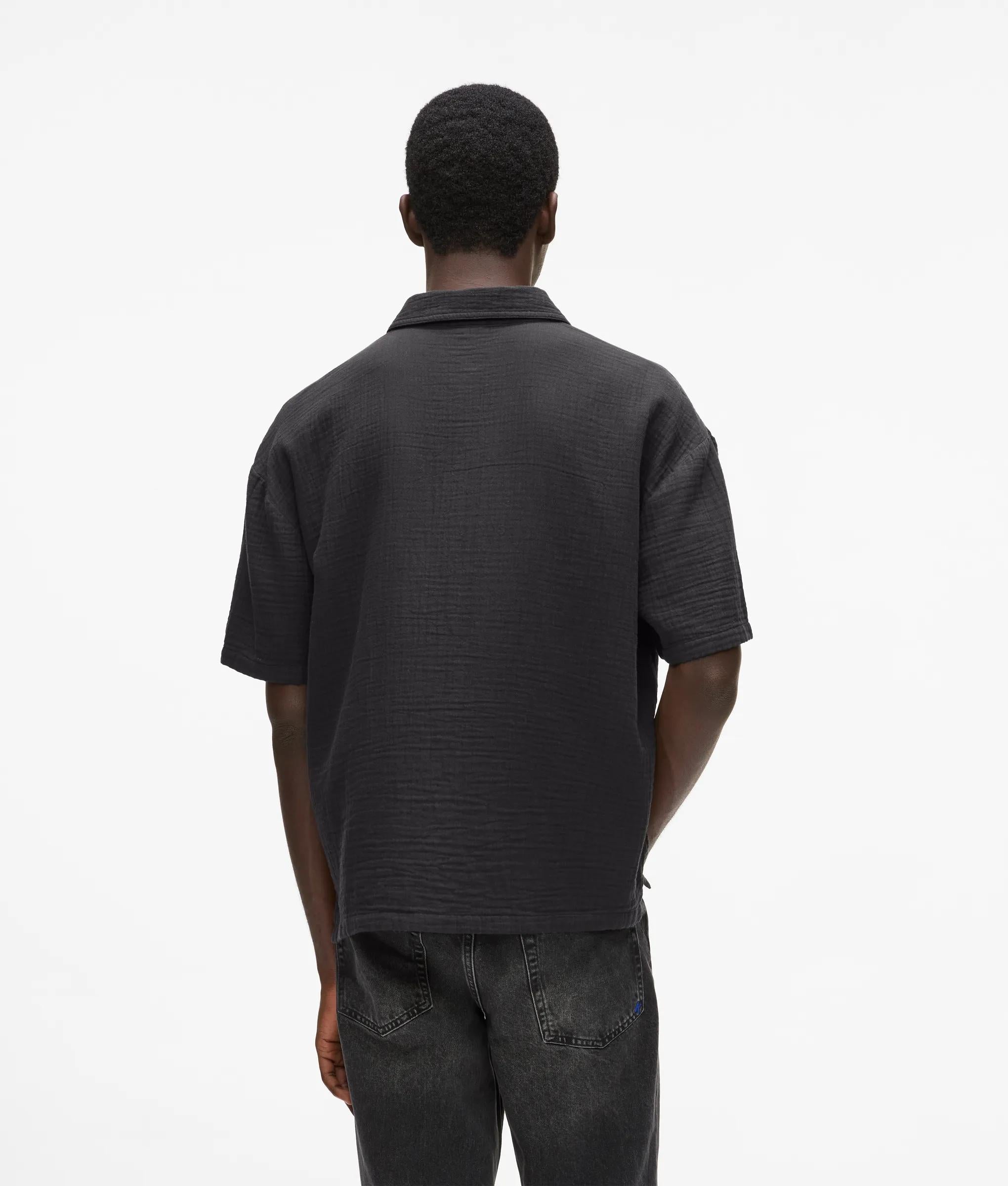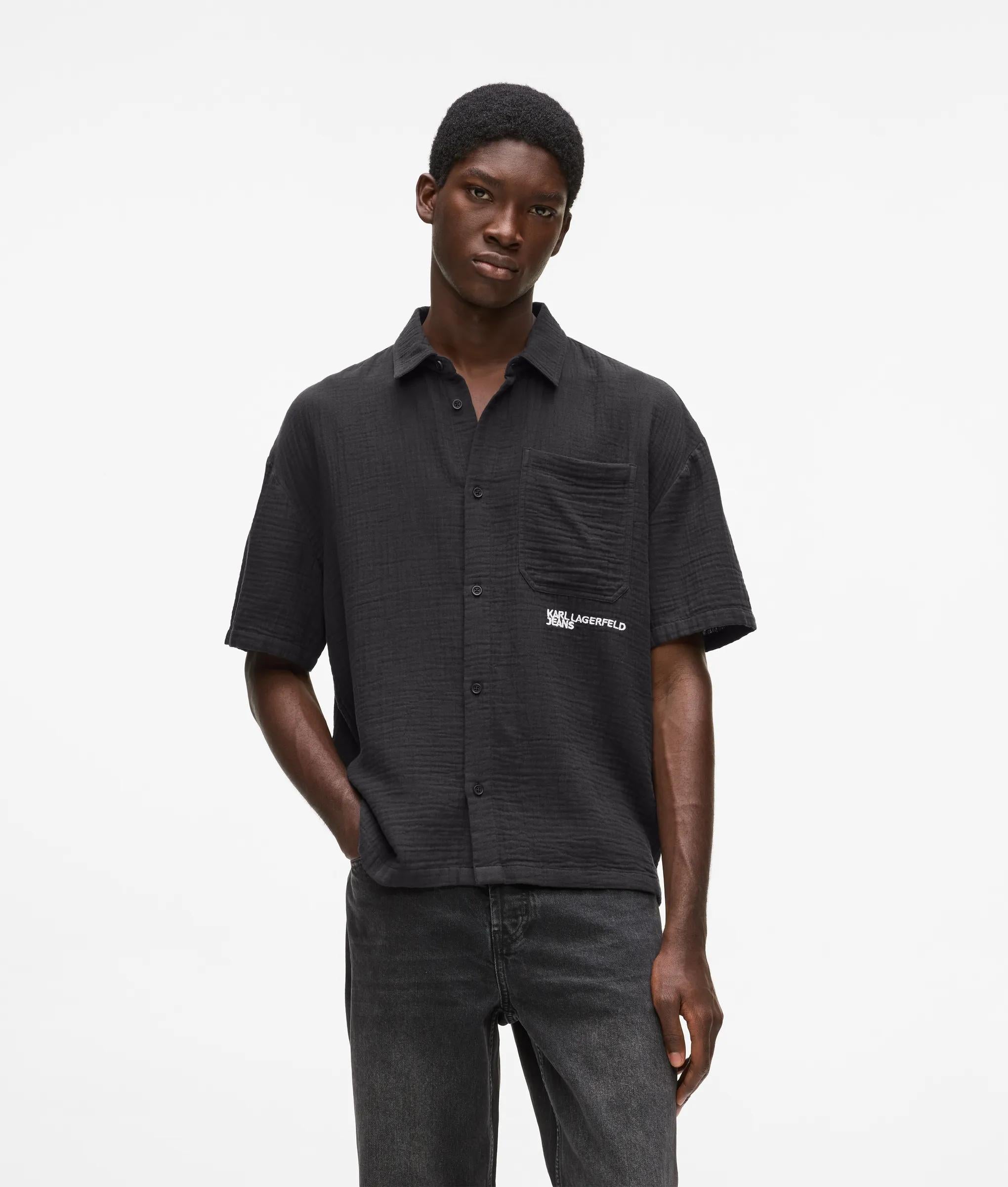 A short-sleeved shirt with a tactile crinkled texture and sharp button-front closure, punctuated by a bold logo at the chest pocket for a confident, modern edge.