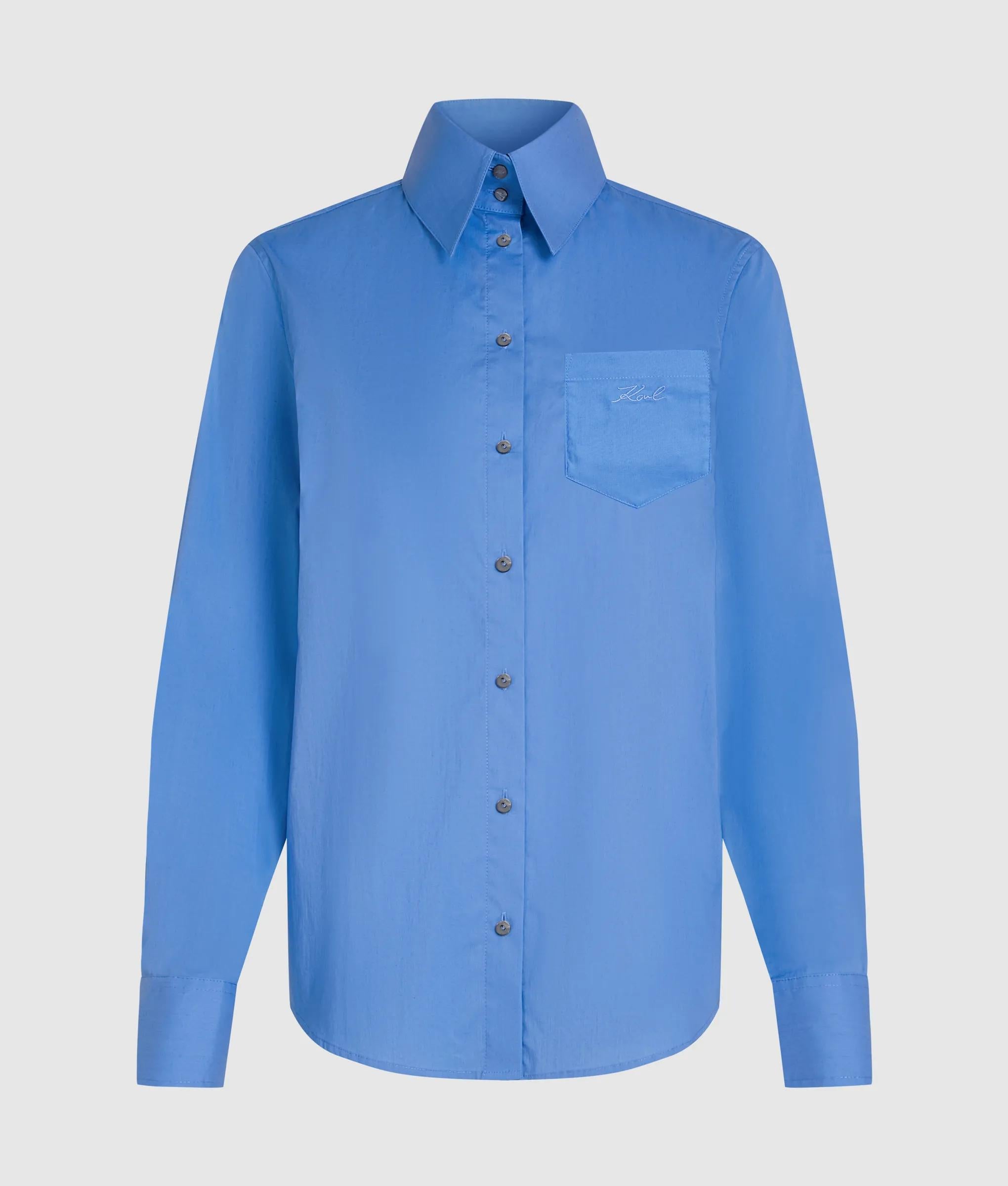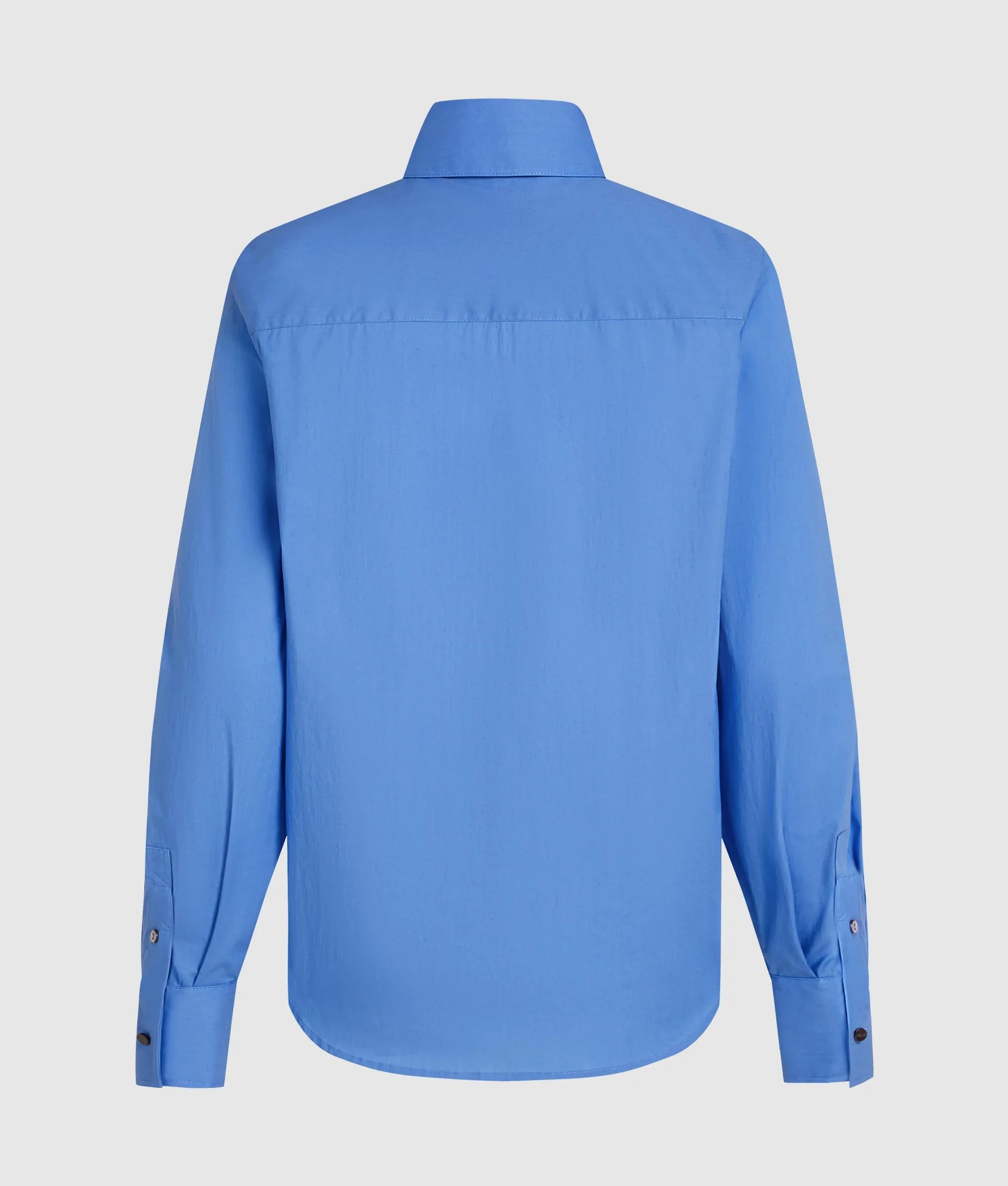 This poplin shirt features built-in stretch for effortless wear. The timeless button-down silhouette is enhanced by a chest patch pocket with tonal logo embroidery.