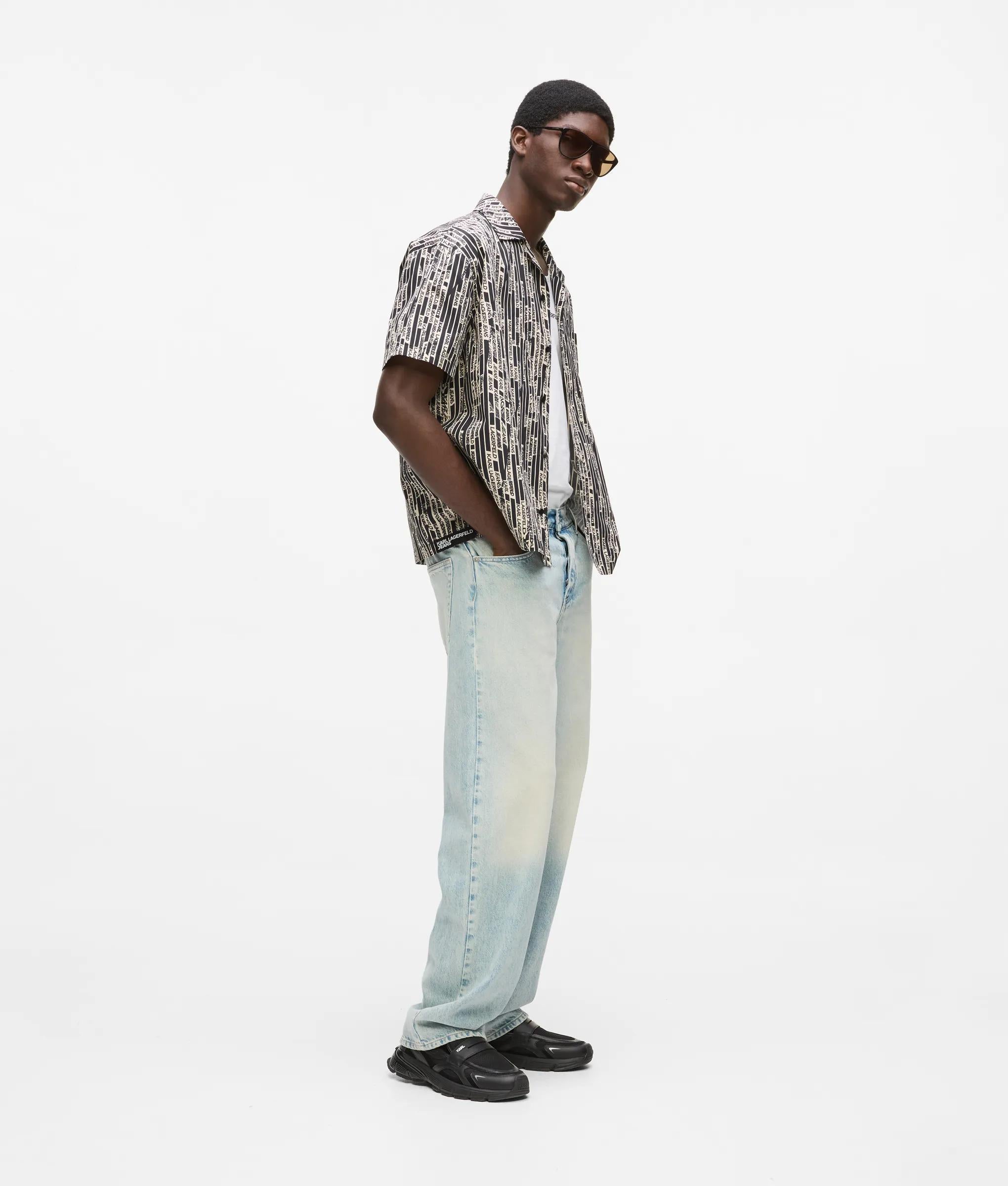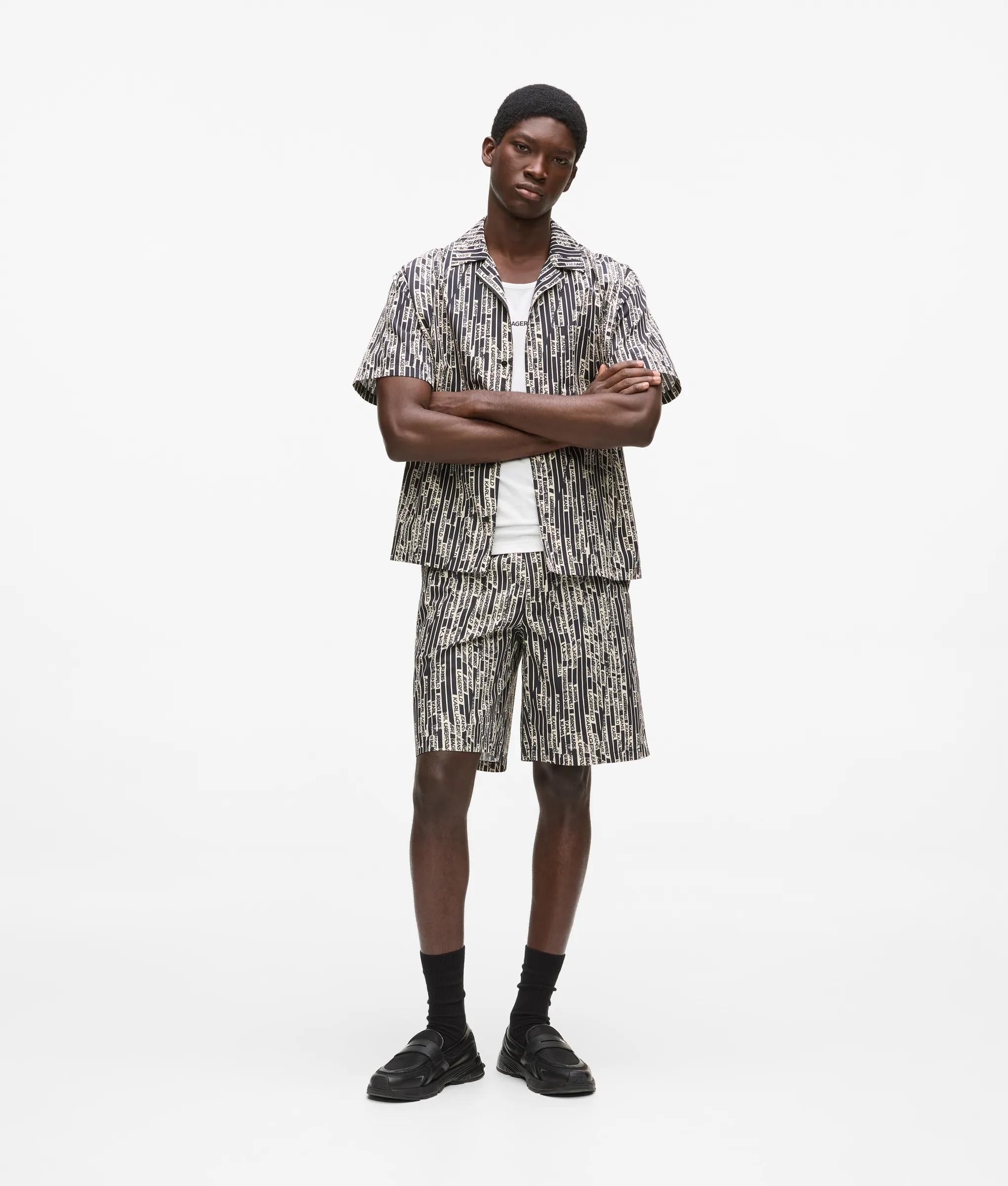 Made to make a statement, this short-sleeved shirt is transformed by an all-over logo print. Team yours with the matching shorts for full graphic appeal.