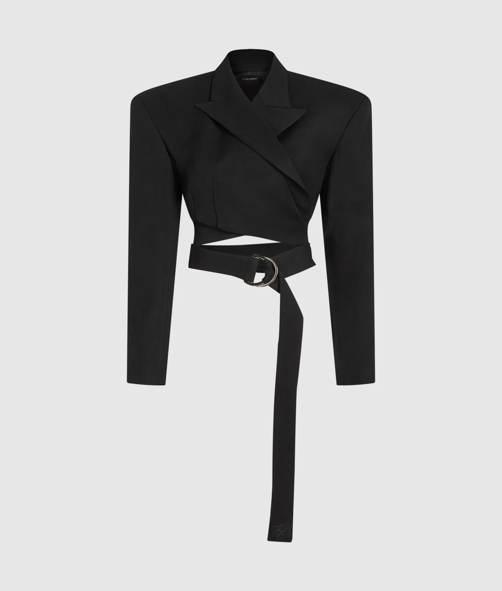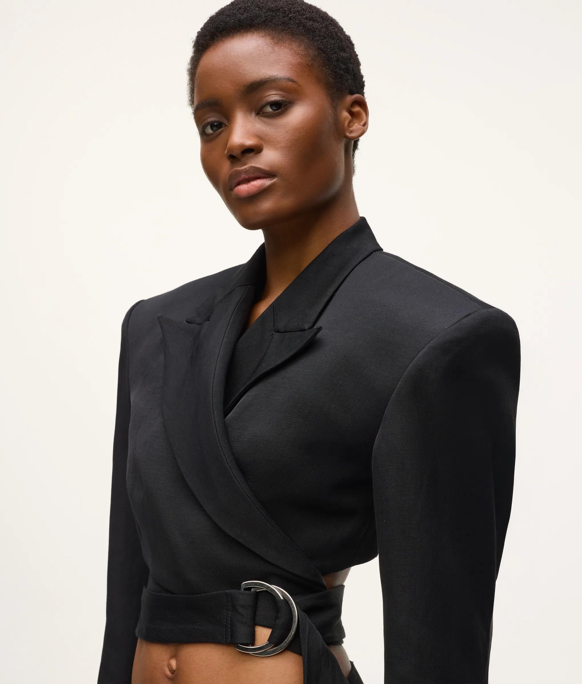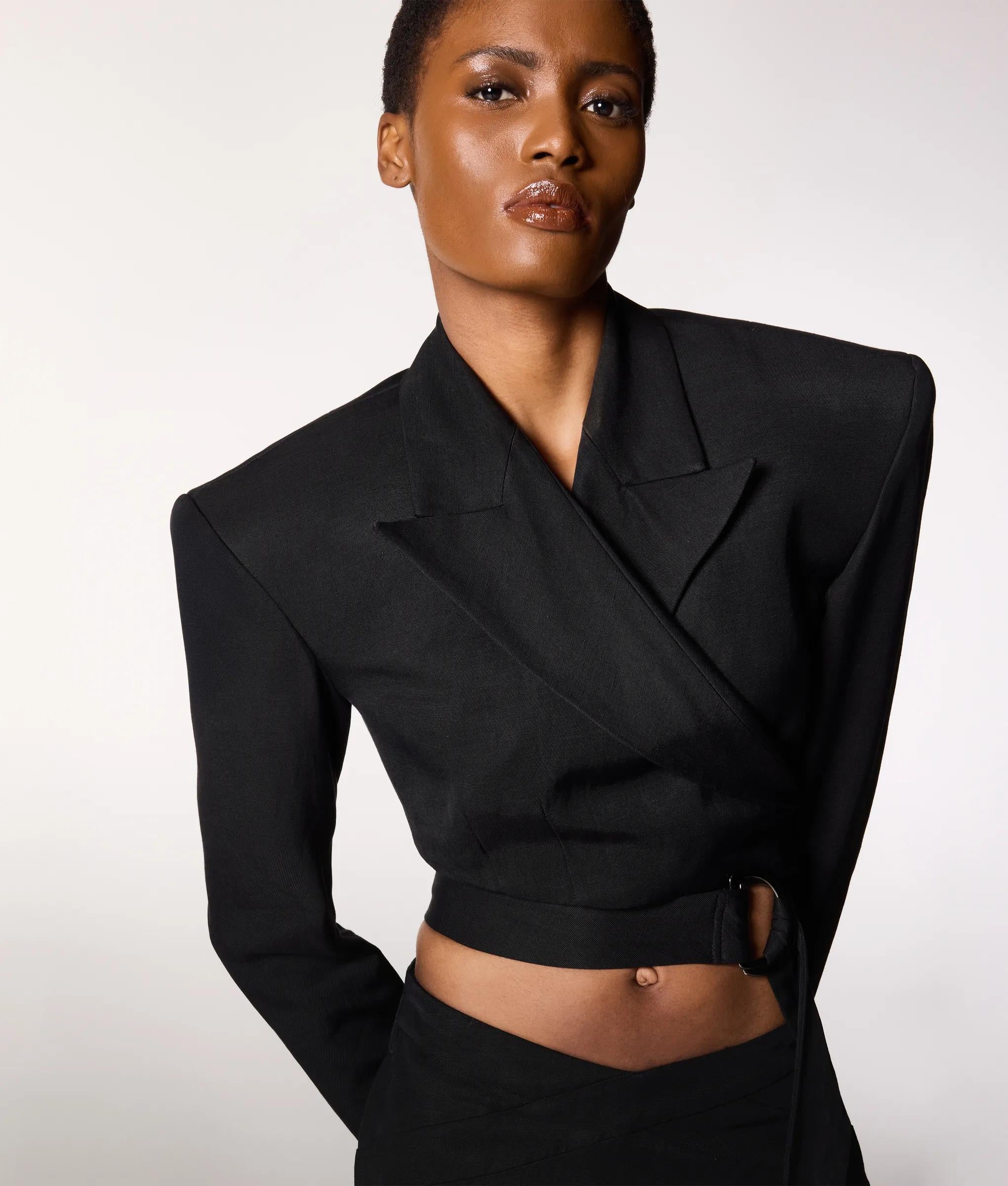 Cut to command attention. The cropped silhouette wraps at the waist with a D-ring belt and sharp shoulders. Designed to pair with the matching skort, this wrap blazer redefines modern tailoring with confidence.