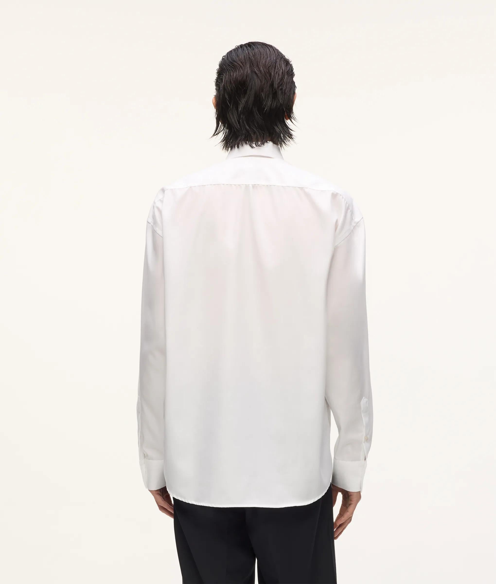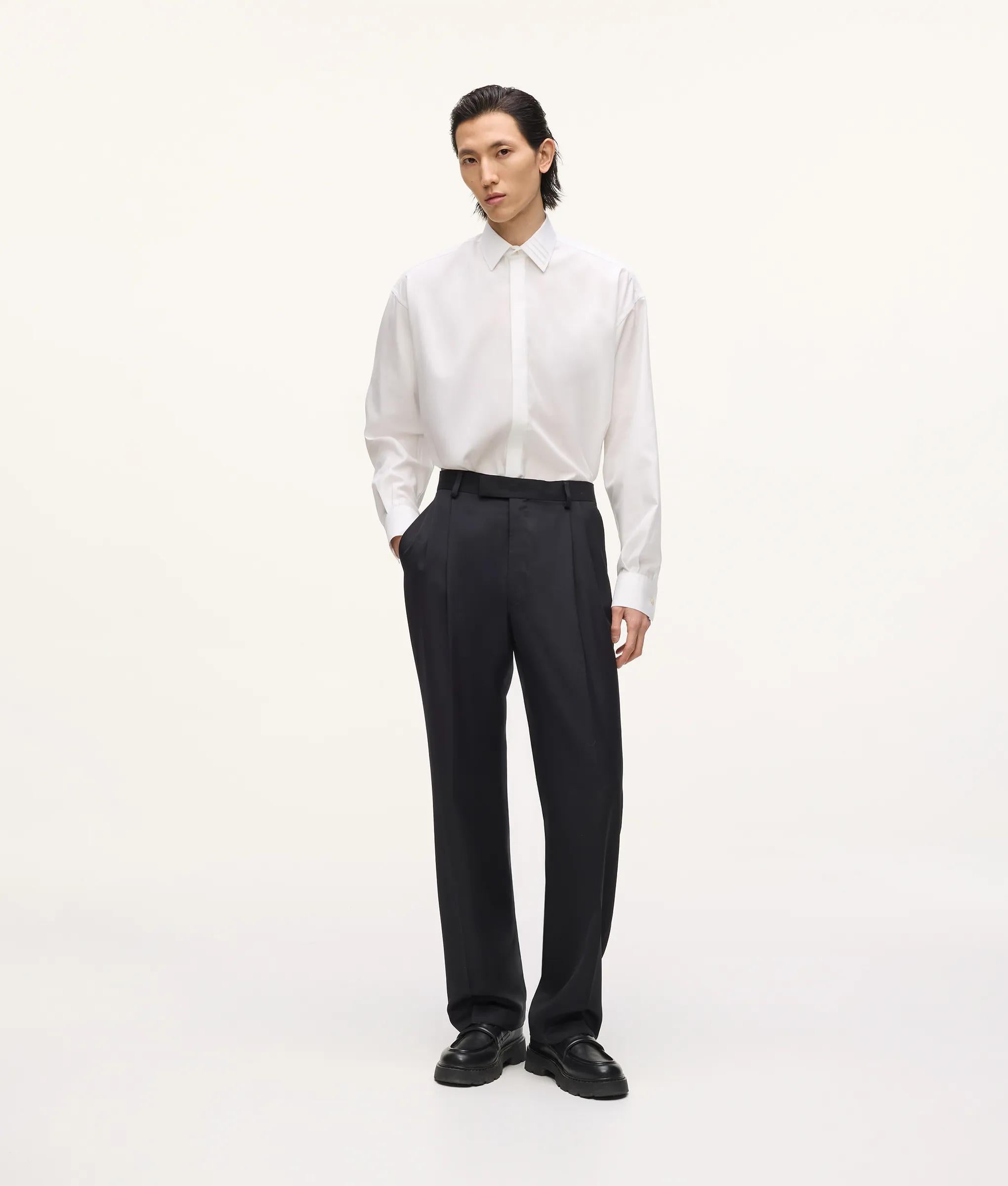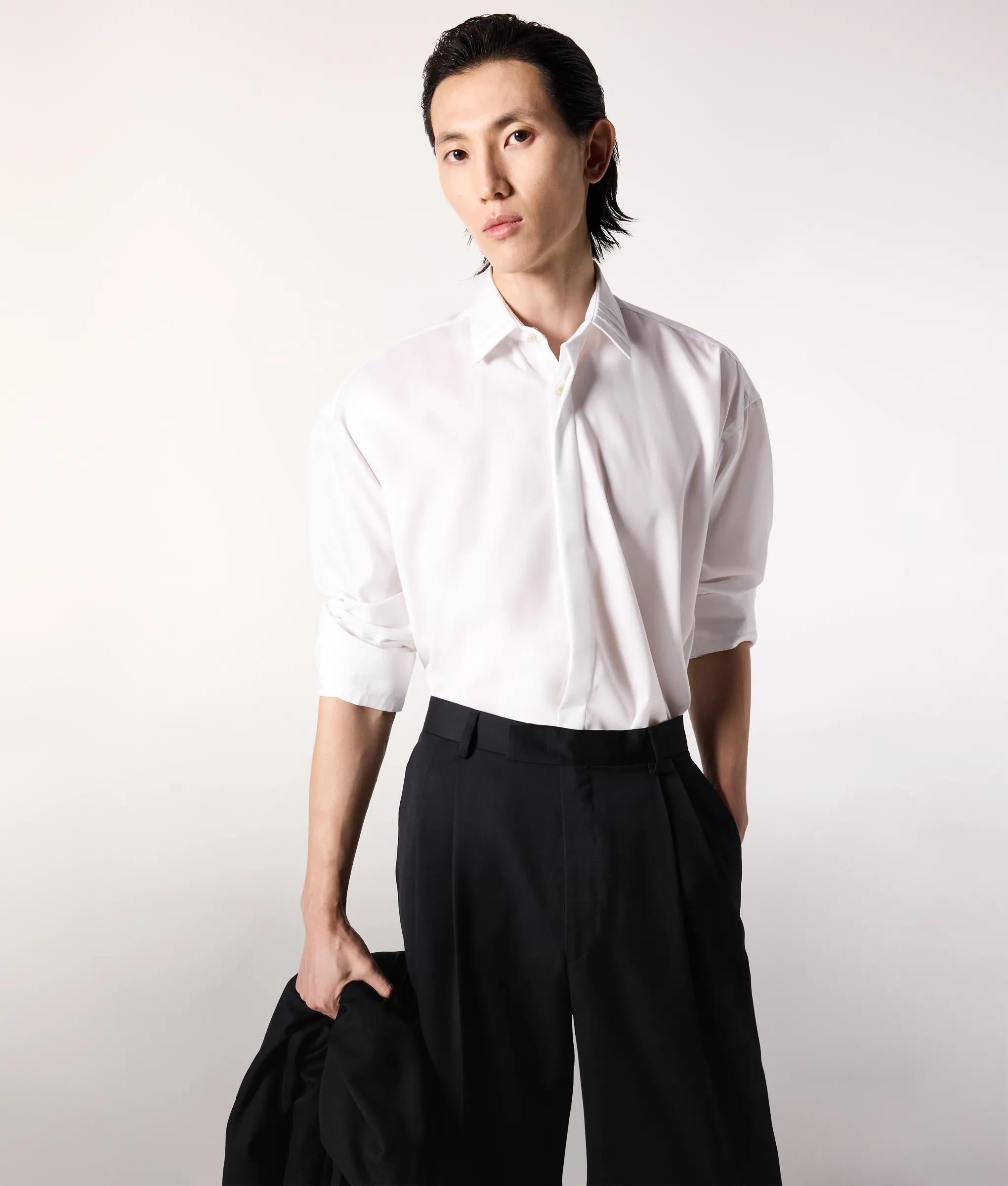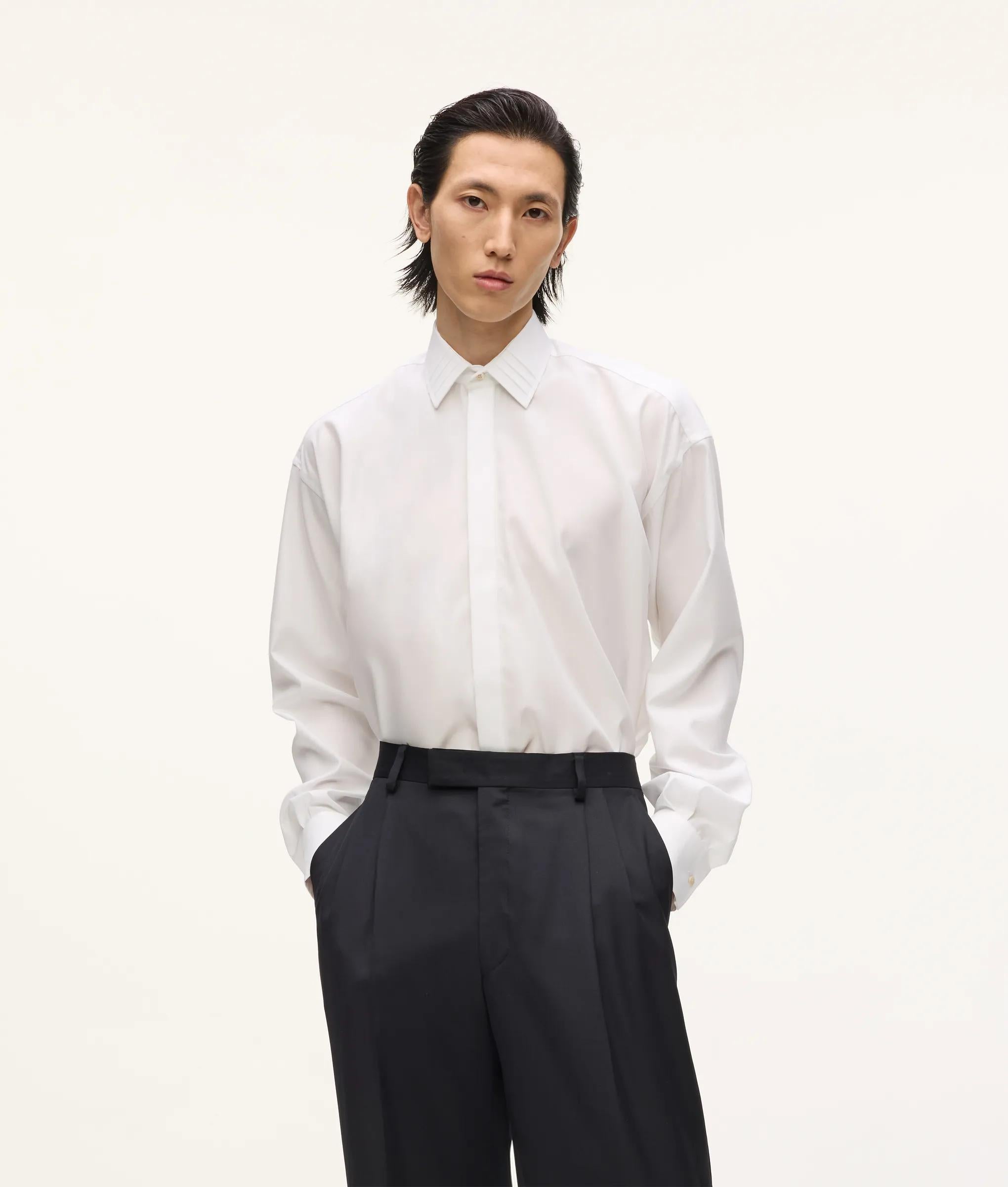 An elevated essential with subtle structure: a stand collar, knife pleats and a concealed button front. The result is a loose-fit shirt that layers neatly under tailoring and looks just as good worn untucked.