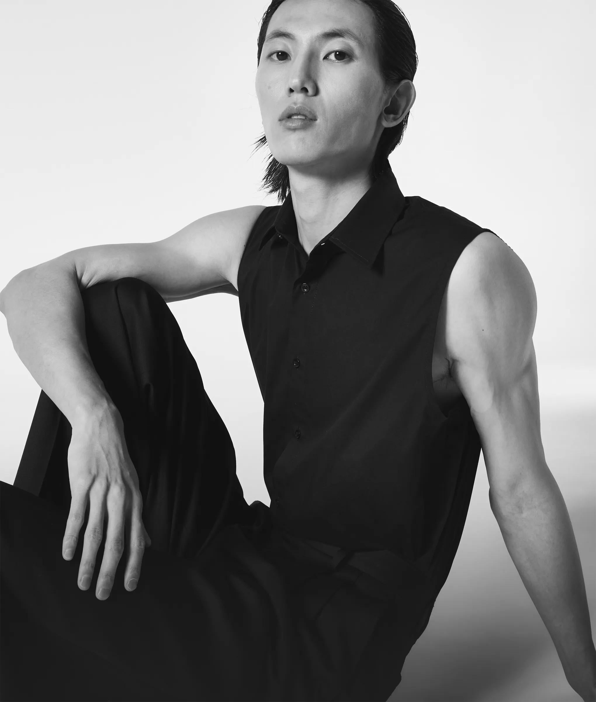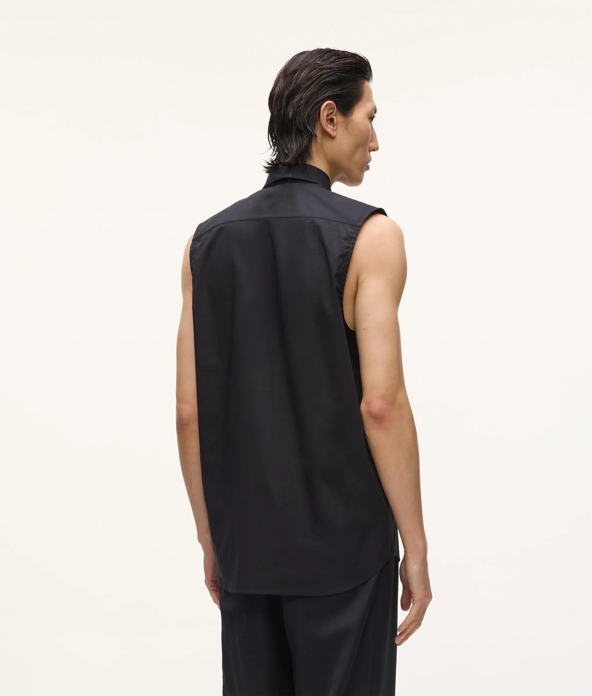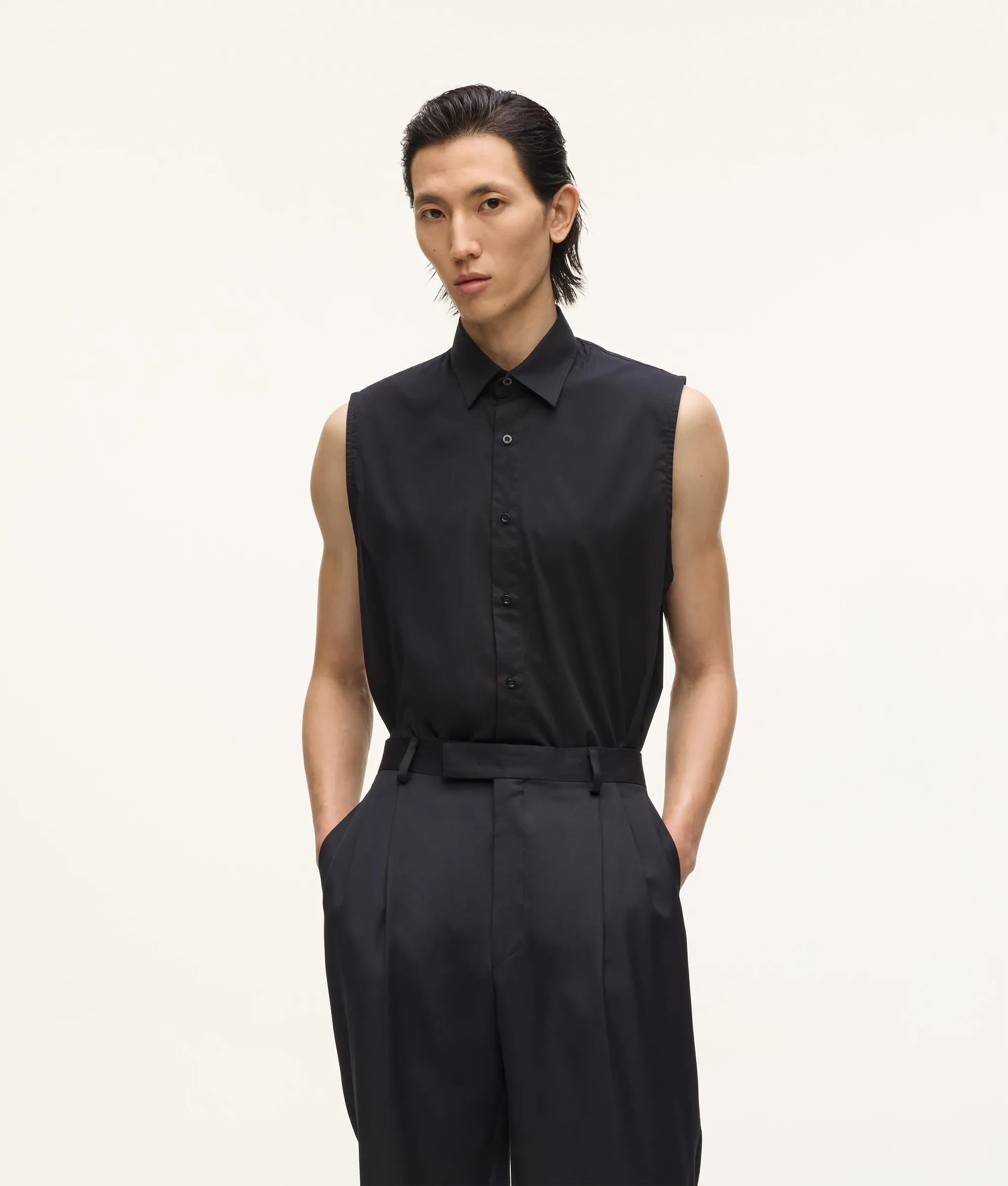 This sleeveless shirt has the ease of summer, with the attitude of tailoring. It’s finished with a crisp collar and a clean button front, then cut with a longer line that looks intentional whether you wear it tucked in or left loose.
