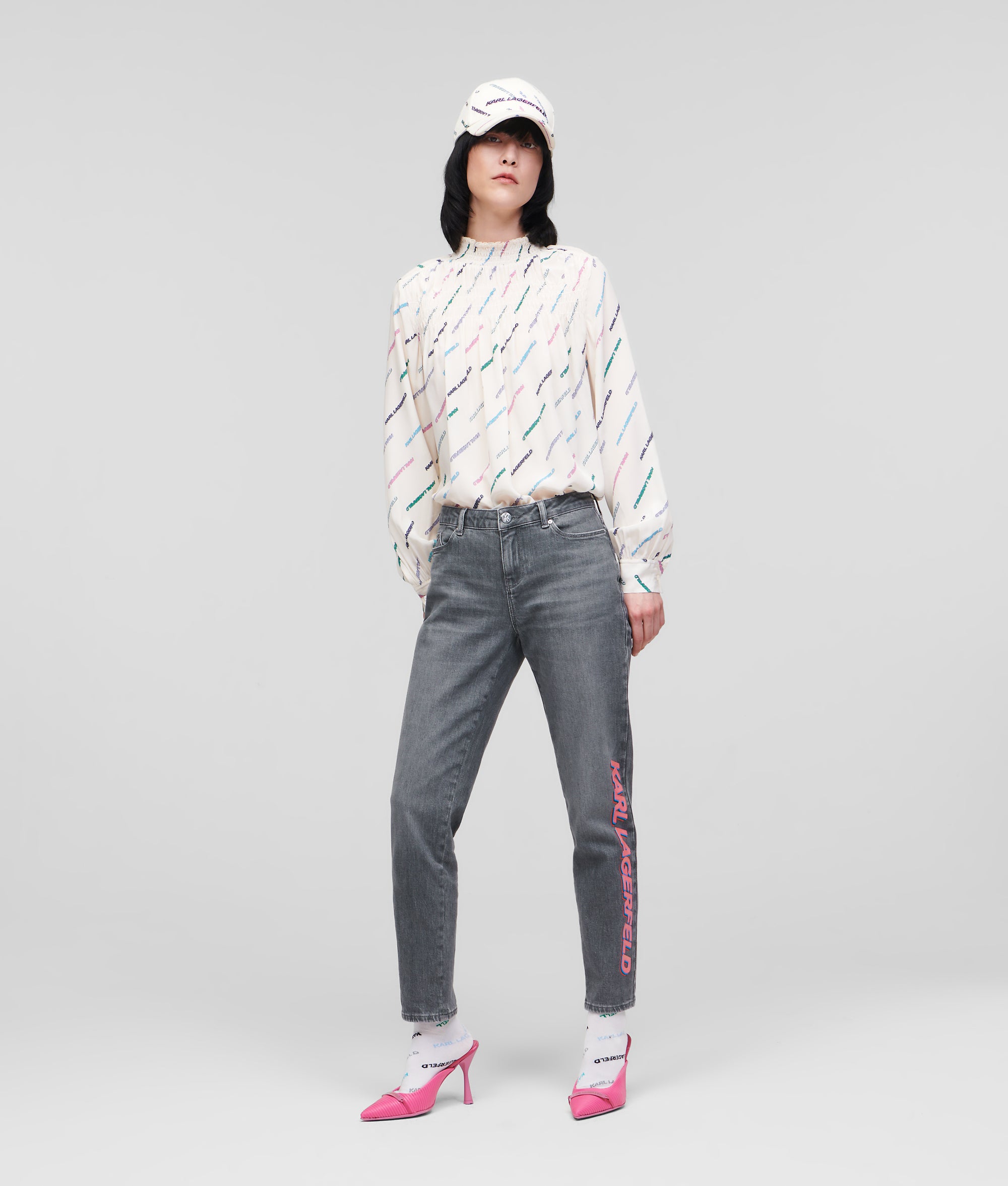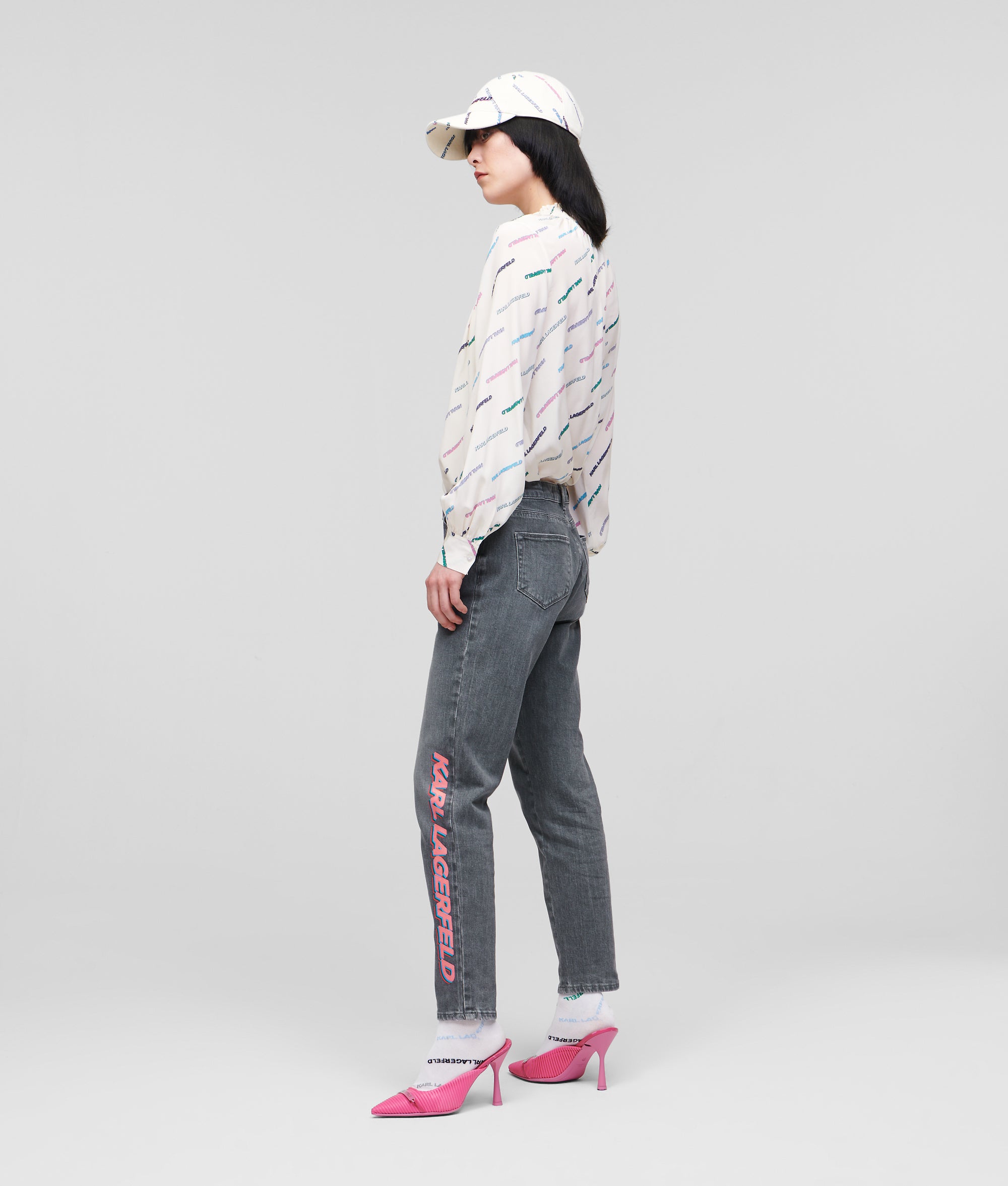 A futuristic, 3D-effect KARL logo in vivid pink brings color-pop impact to these girlfriend-fit jeans. Cut from gray denim, the five-pocket style features shiny silver metal hardware and is completed with a rubber logo patch at the back waistband.