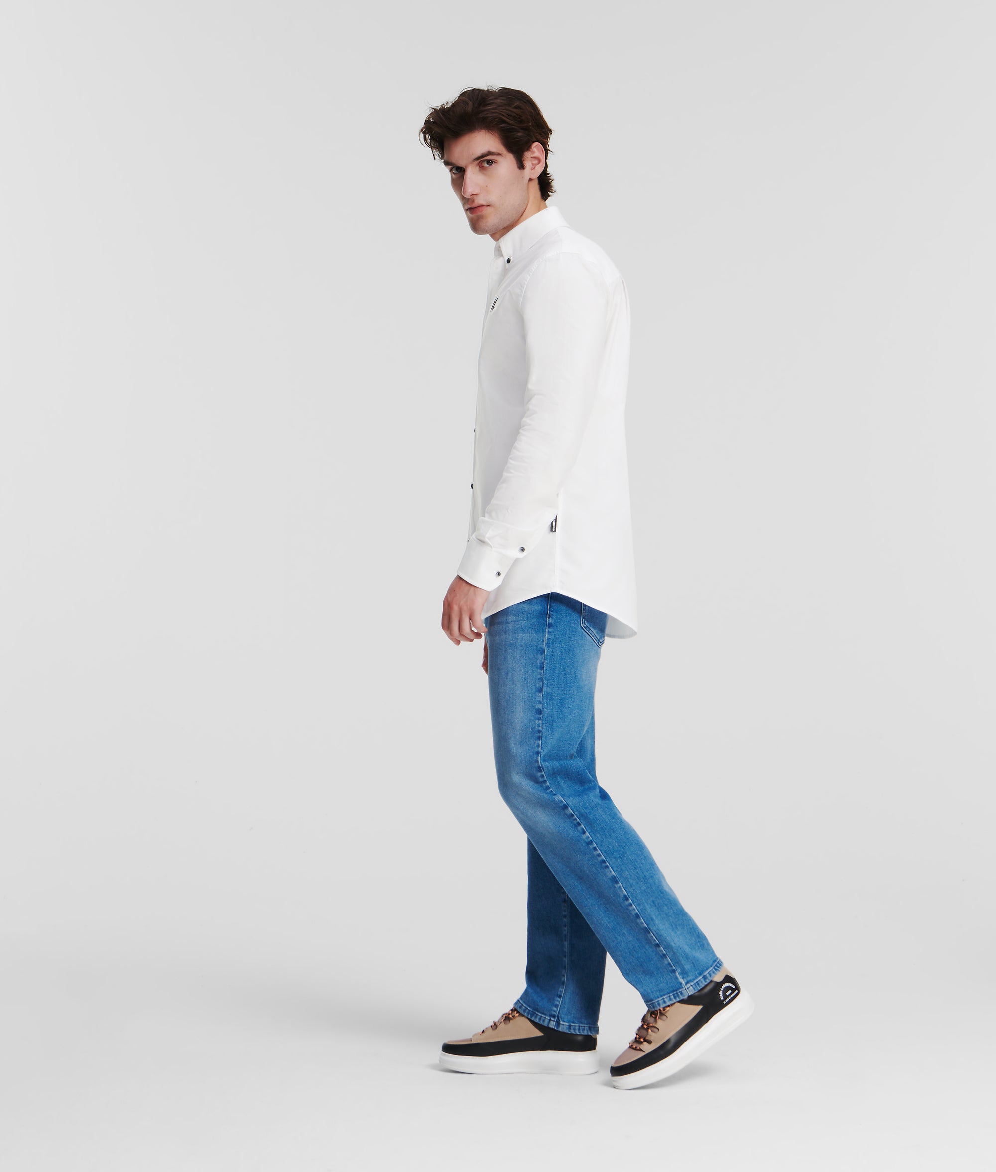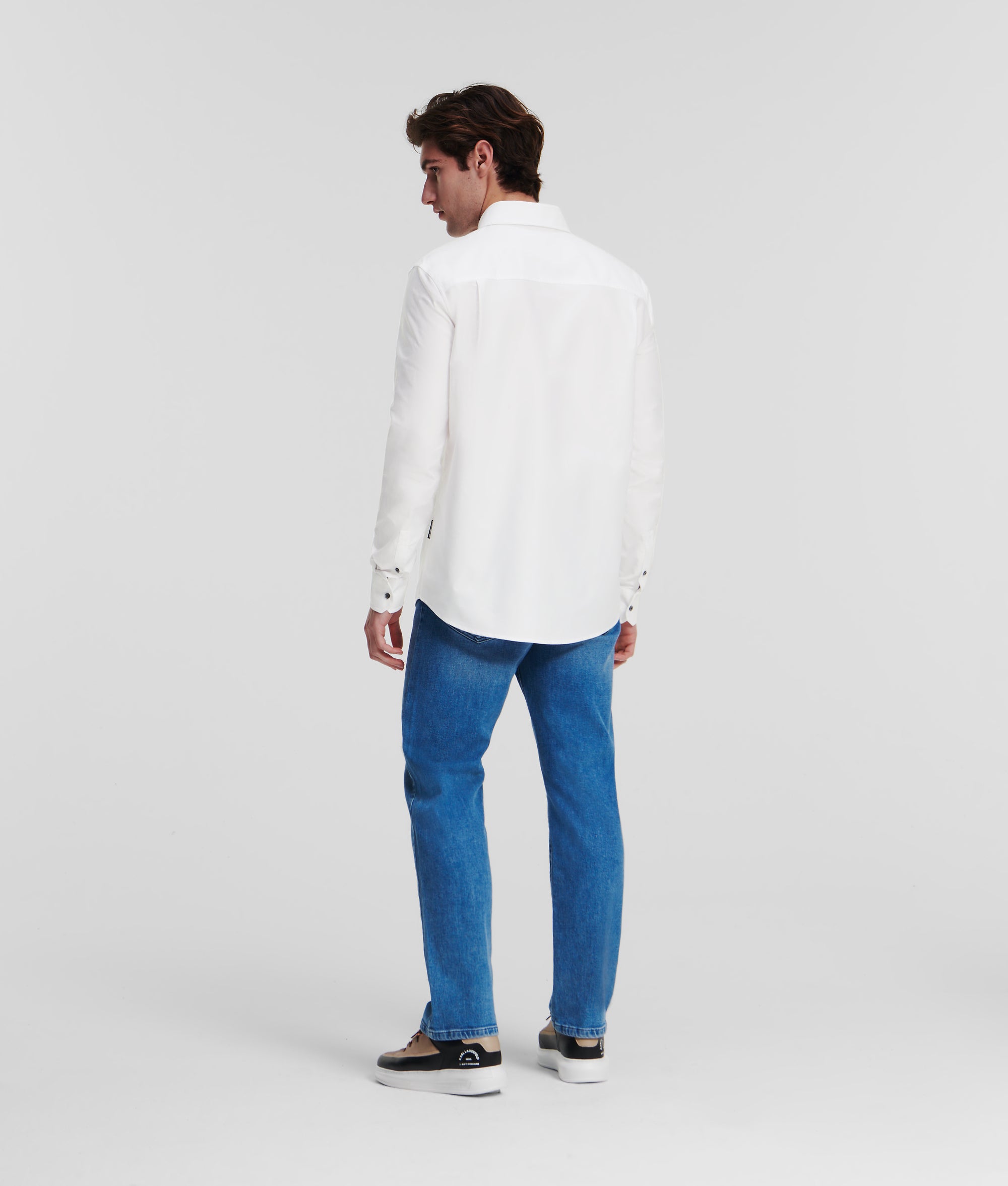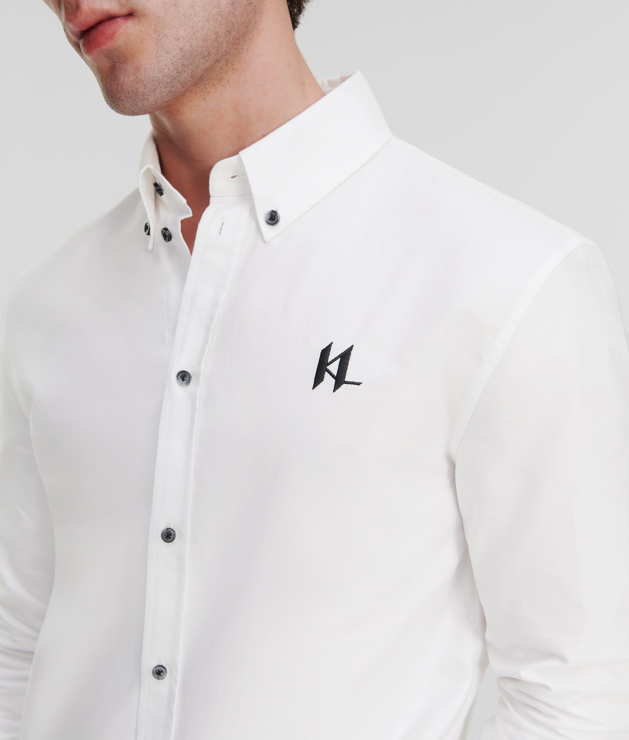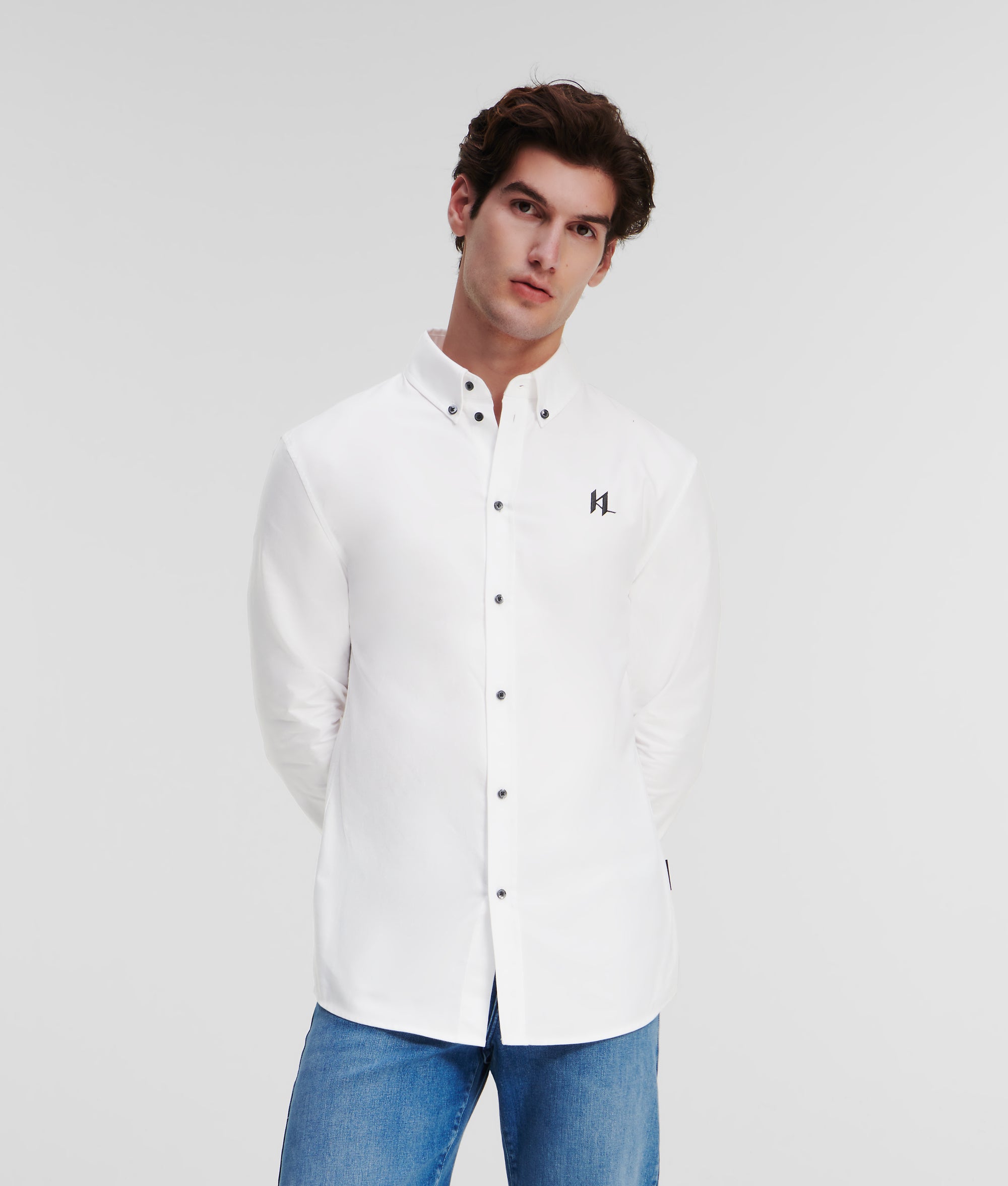 A classic button-down shirt with unmistakable KARL detailing. Made from crisp cotton, this timeless Oxford shirt is enriched by contrasting buttons at the front, collar and sleeve cuffs, and delicate KL Monogram embroidery at the chest.