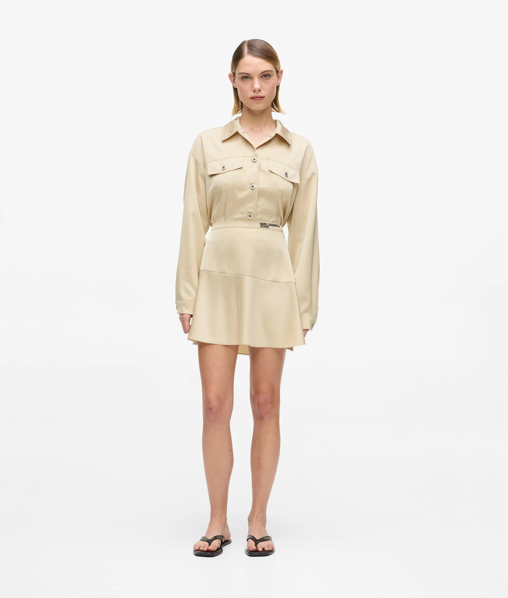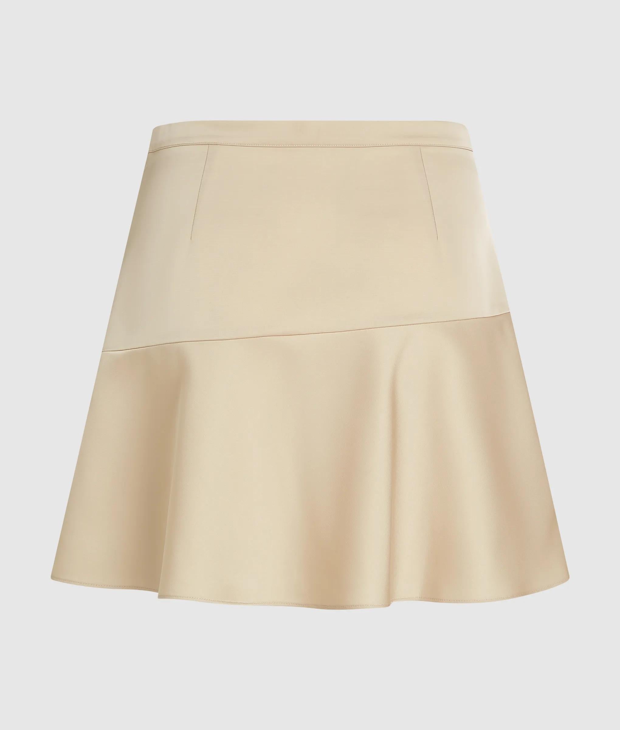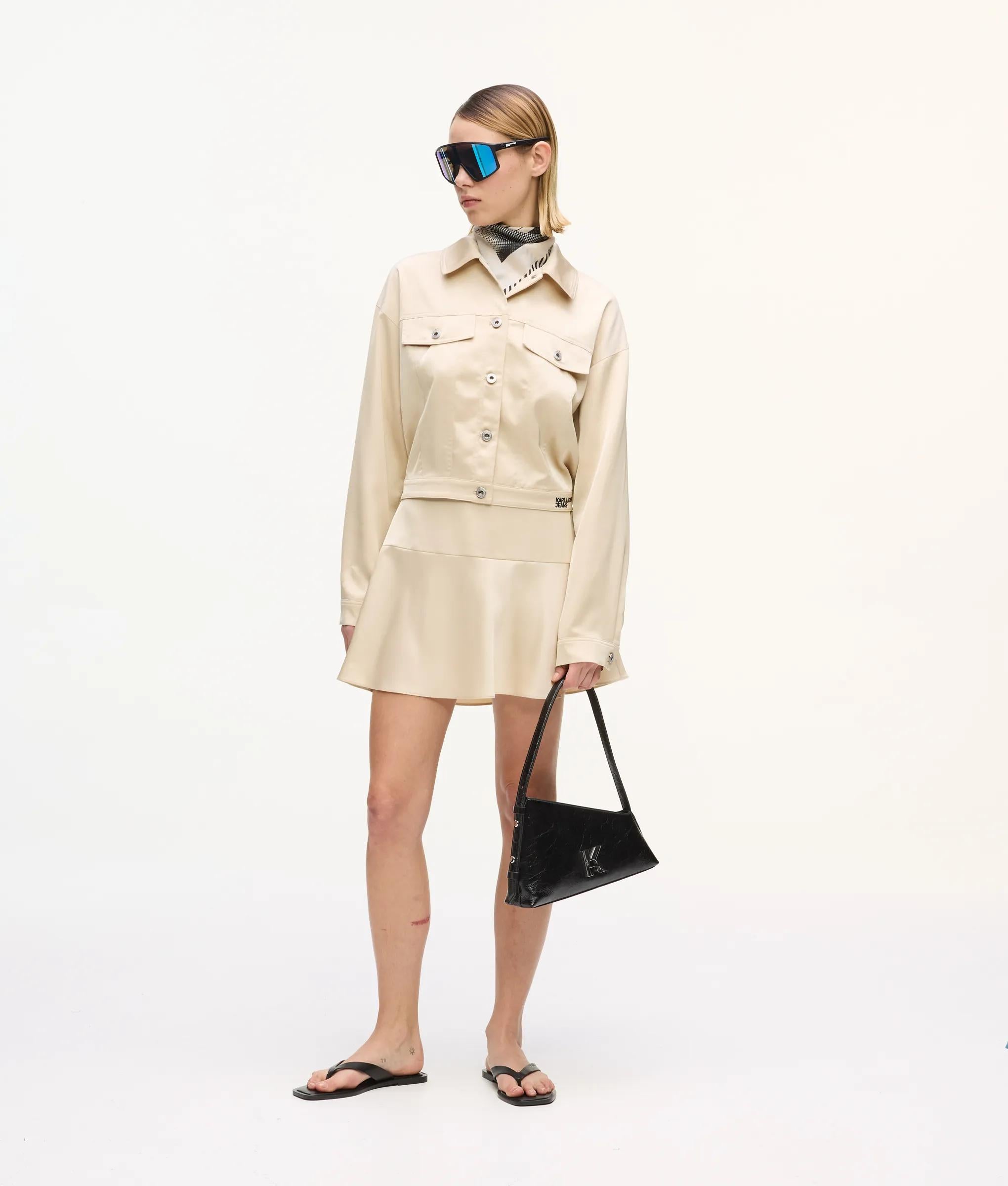 Made for high-impact summer styling, this satin mini skirt turns heads with its sleek silhouette and iridescent finish. Wear it with the matching jacket for a statement coordinated look.