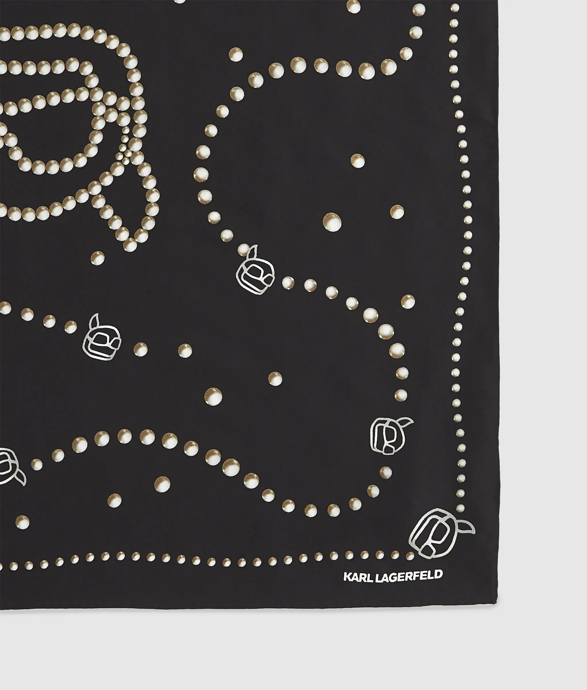 Pearl motifs and Ikon Karl prints converge on this silk scarf. Perfect for layering over tailored coats or elevating casual styles.