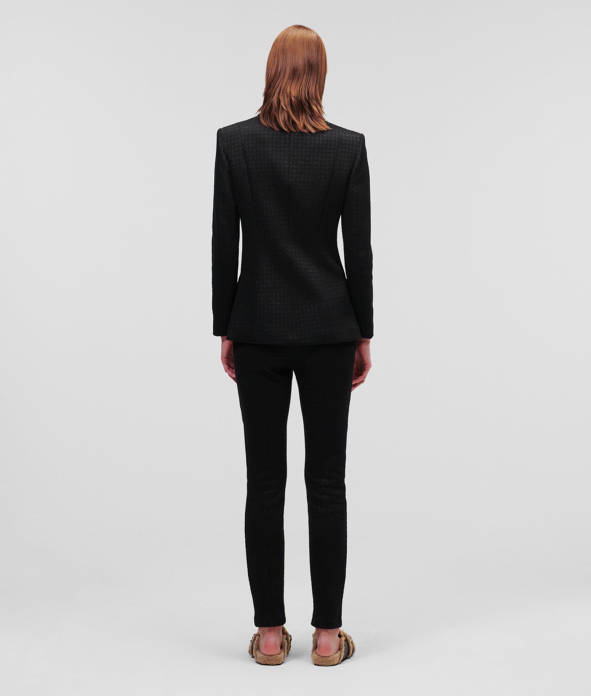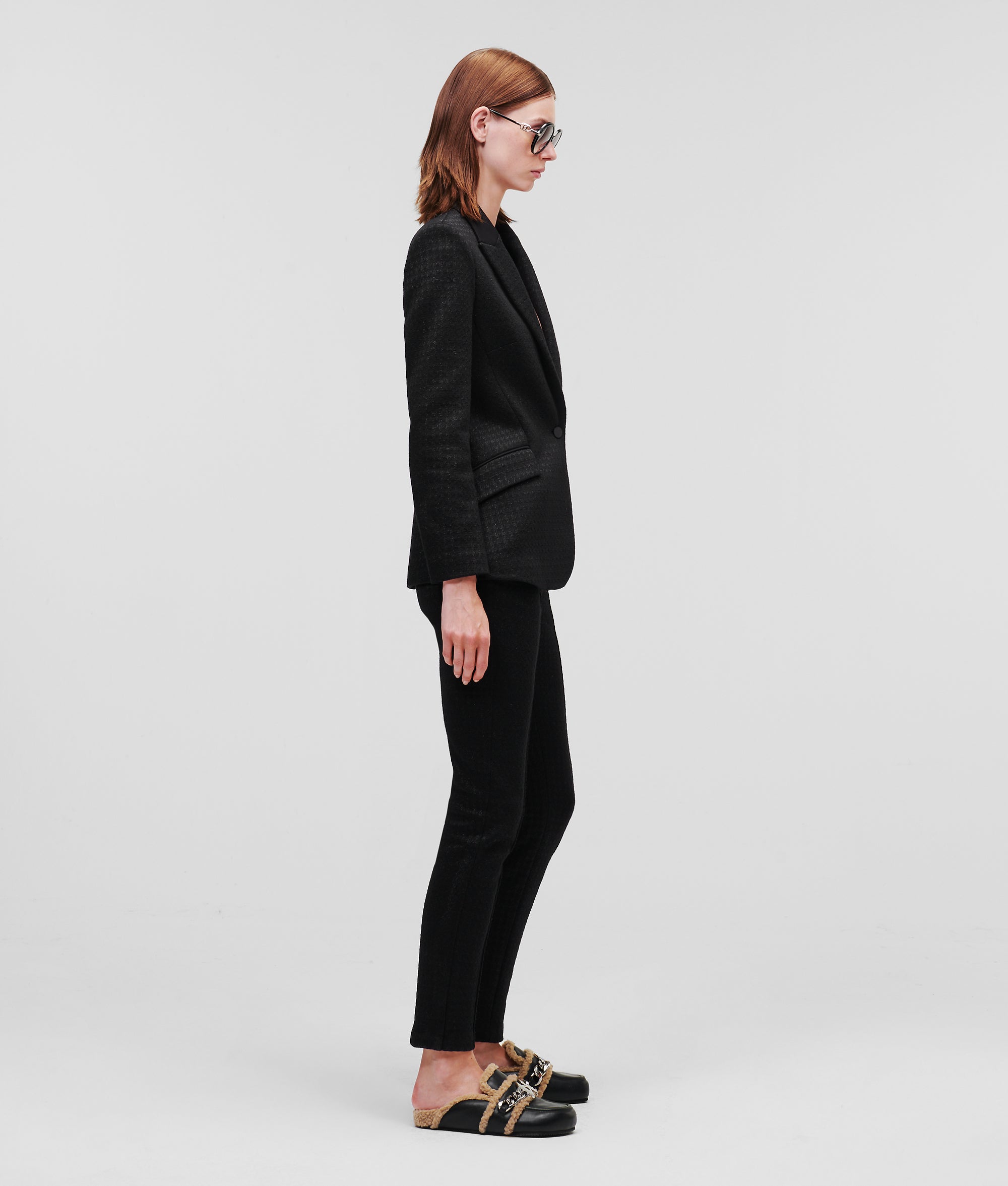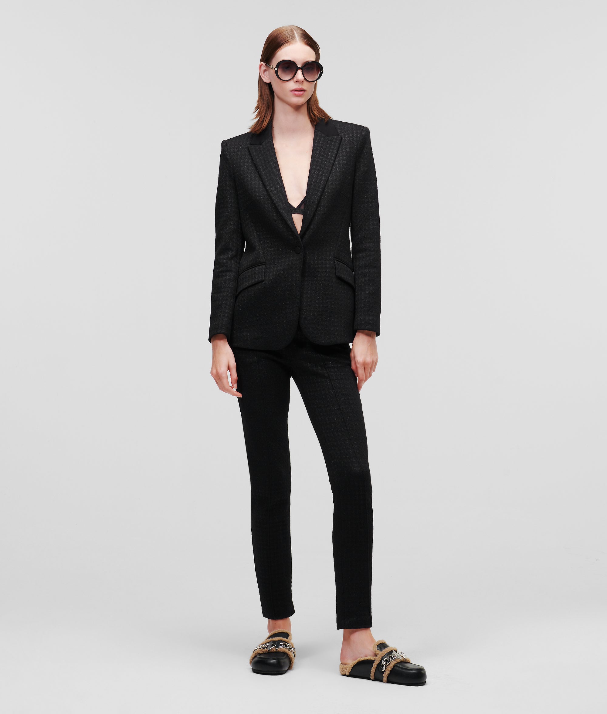 A premium punto jacket embellished with an all-over KARL Monogram design for contemporary tailoring. This comfortable yet chic jacket is crafted from a cotton-viscose blend and features ultra-stretch lining at the inner sleeves. The single-breasted style is completed with peaked lapels and a satin-covered button at the front closure.