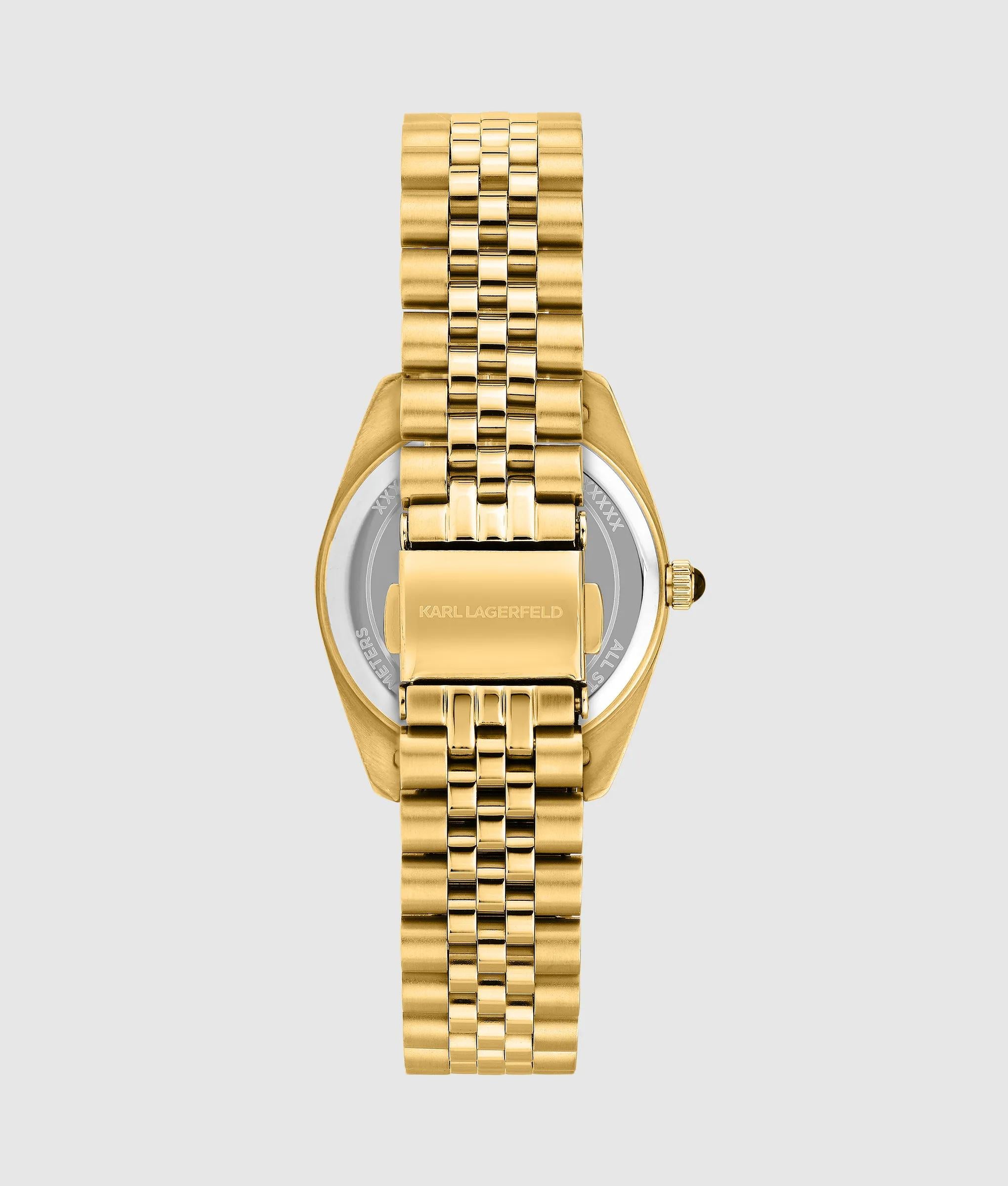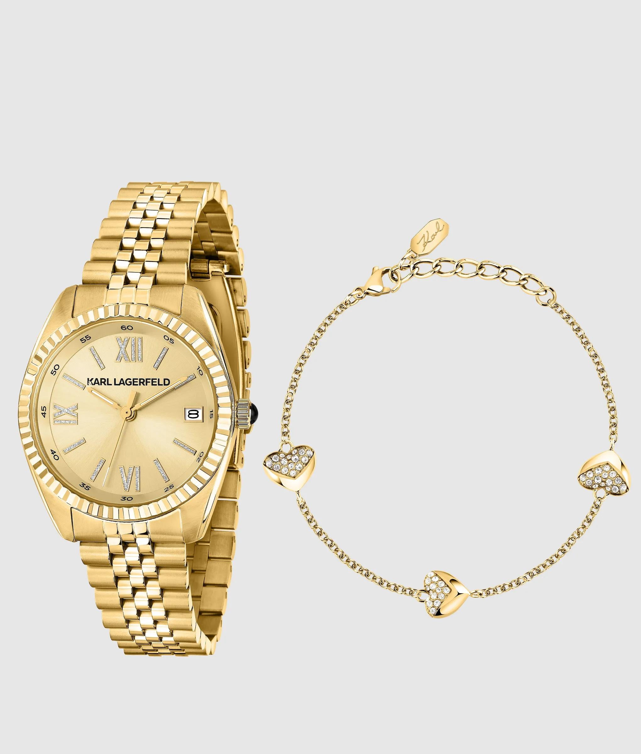 A refined watch and bracelet set blending sleek gold tones with delicate pavé heart charms. The watch features a sleek round dial topped with the KARL LAGERFELD logo, while the delicate chain bracelet is adorned with sparkling heart charms for subtle elegance.