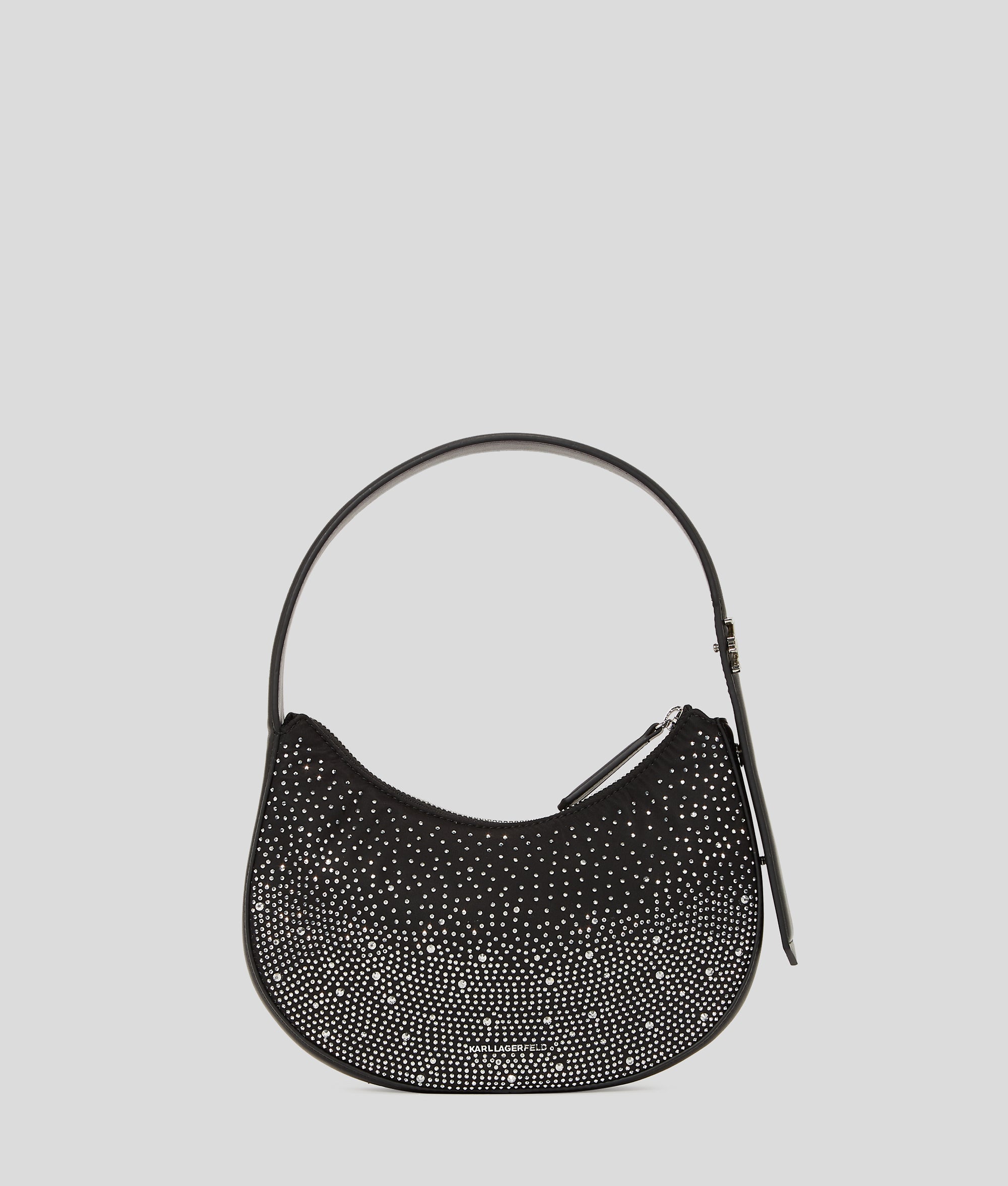 A stunning half-moon bag adorned with shimmering rhinestones for statement accessorizing. The zip-top closure keeps evening essentials safely stored, while a snap button at the inside of the shoulder strap transforms the bag's silhouette for versatile styling.