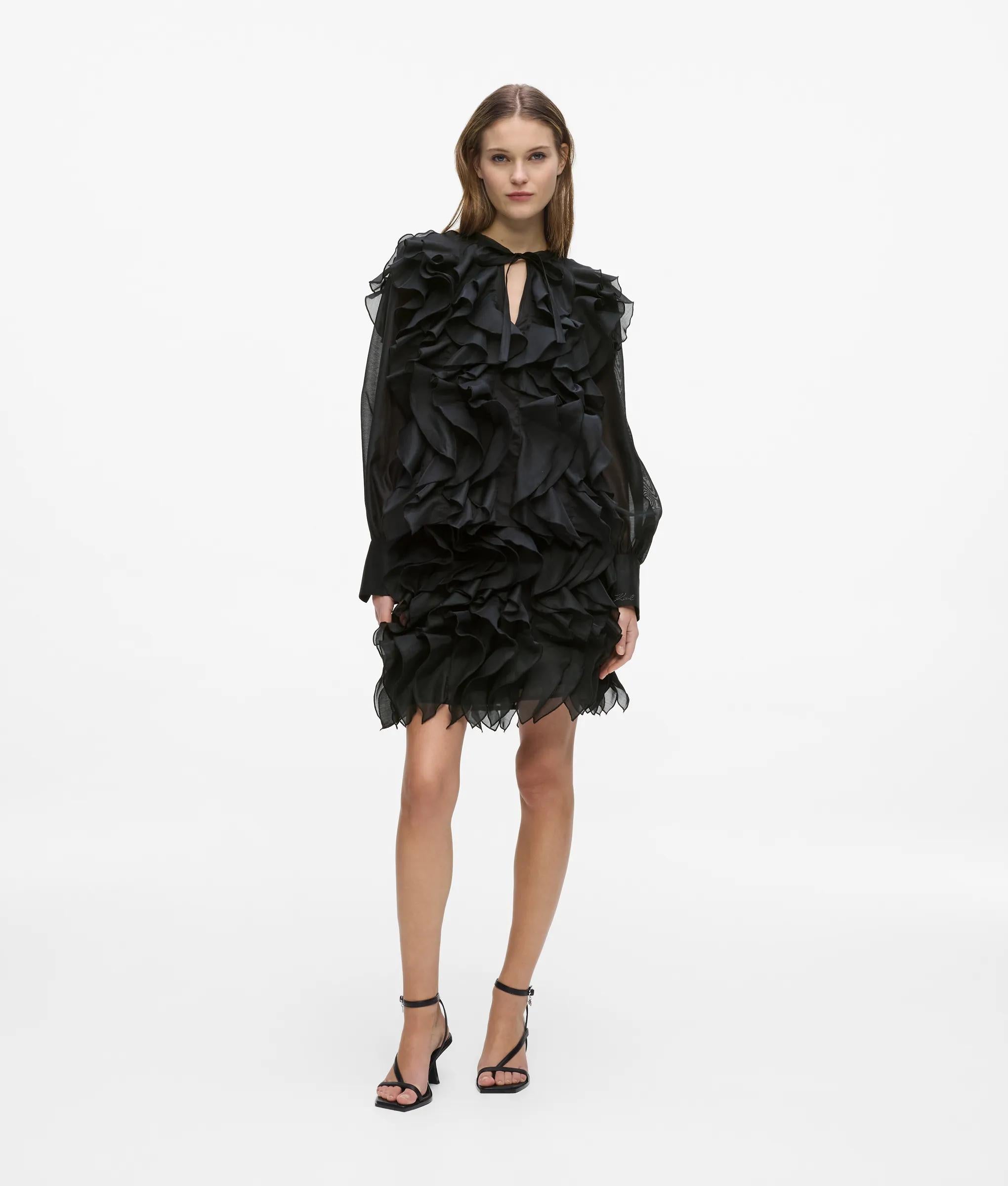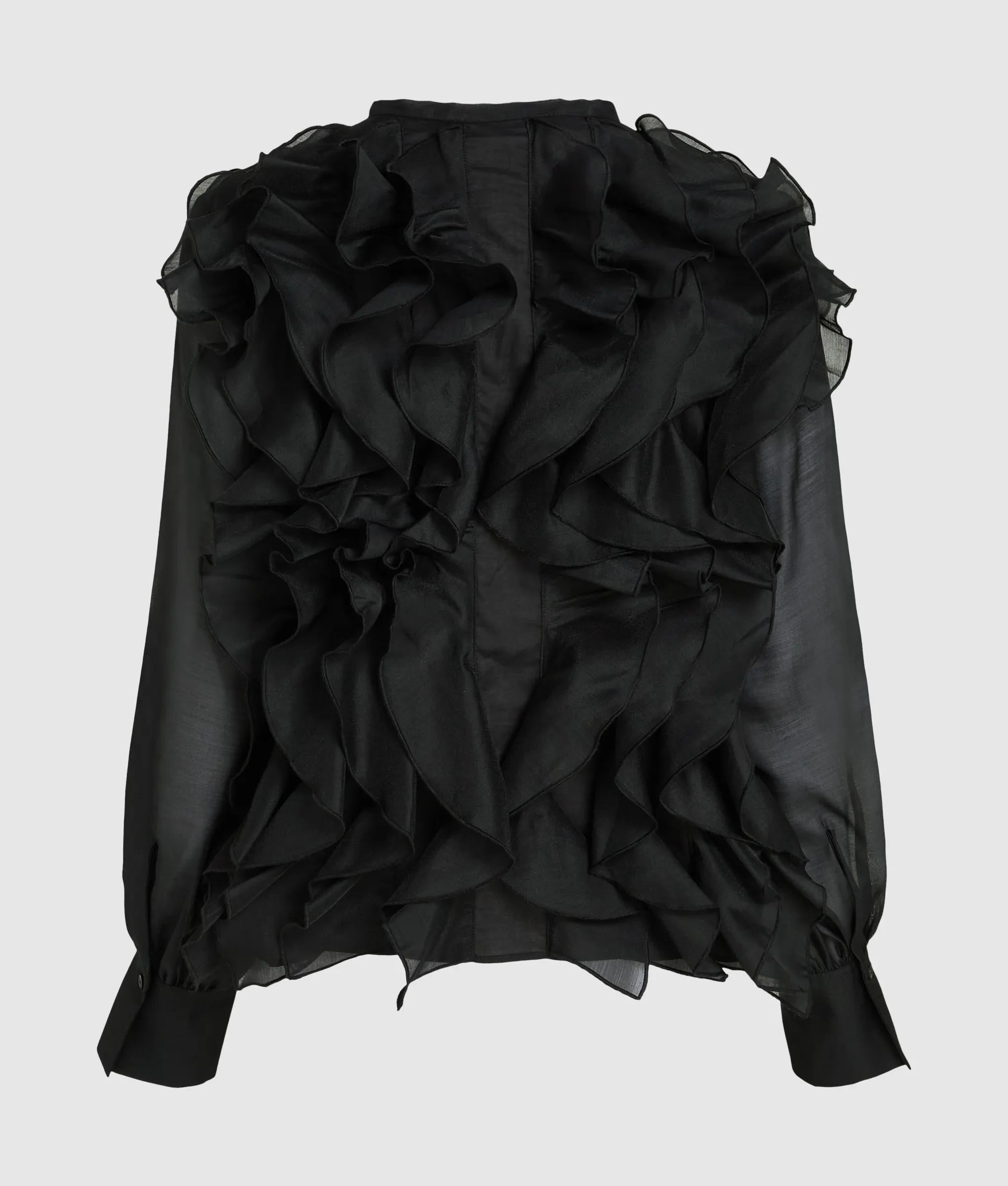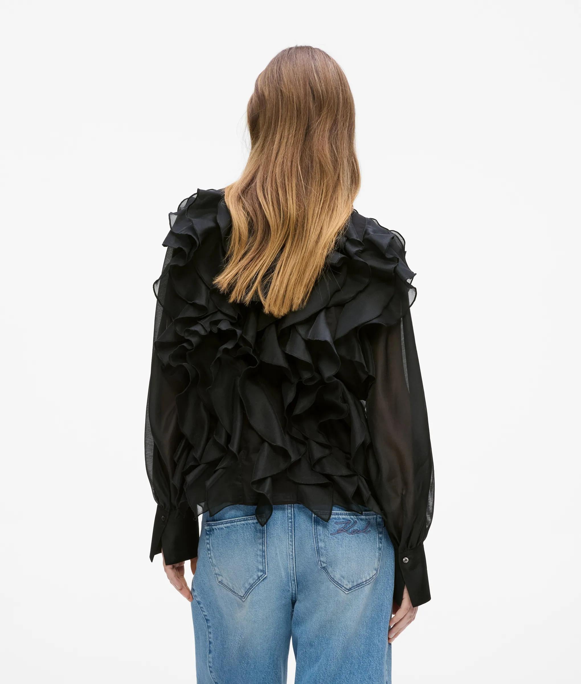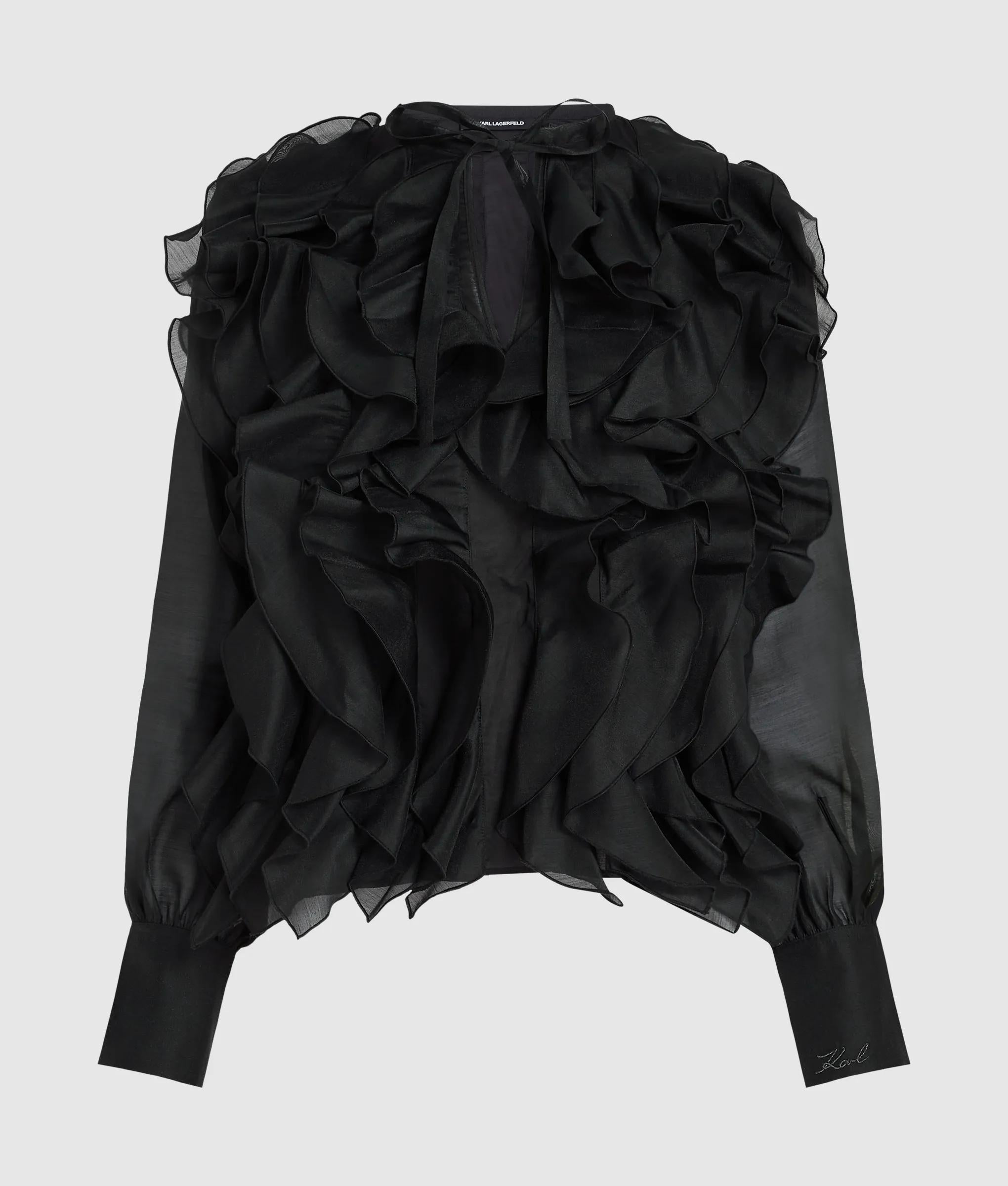 Inspired by the stage costumes KARL LAGERFELD created for the Paris Opera Ballet, this collarless shirt is adorned with cascading organza ruffles. Style the striking silhouette with sharp tailoring or sleek leather.
