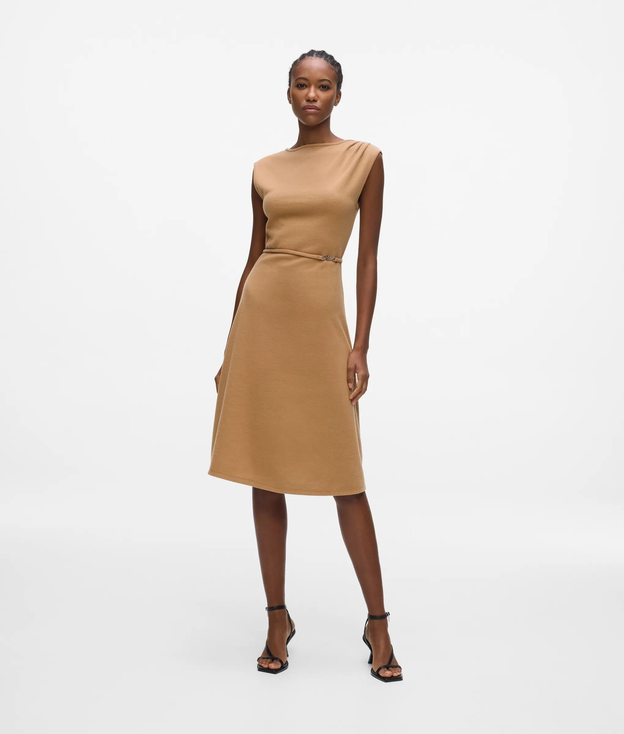 Fluid pleats and a sculpted waistbelt define this sleeveless dress, blending effortless elegance with subtle shaping. Made from a soft jersey for easy, all-day wear, this dress brings a refined edge to casual style.