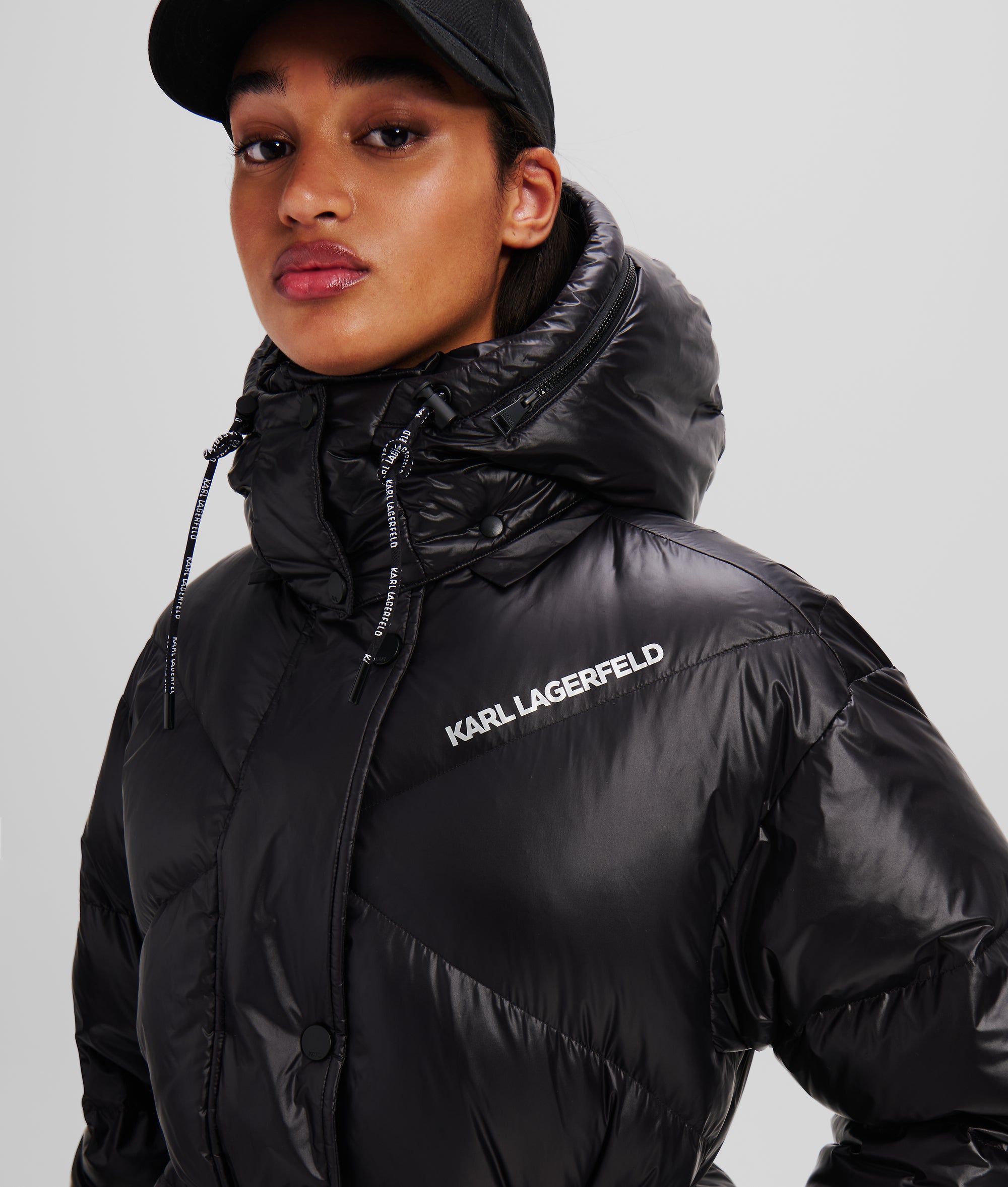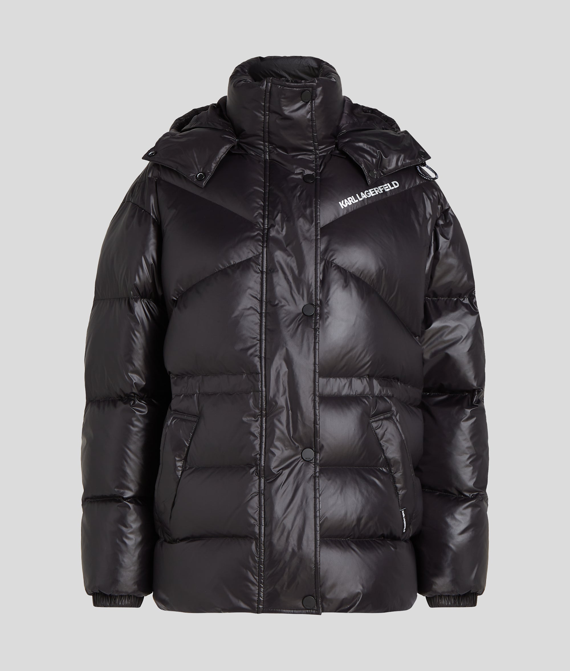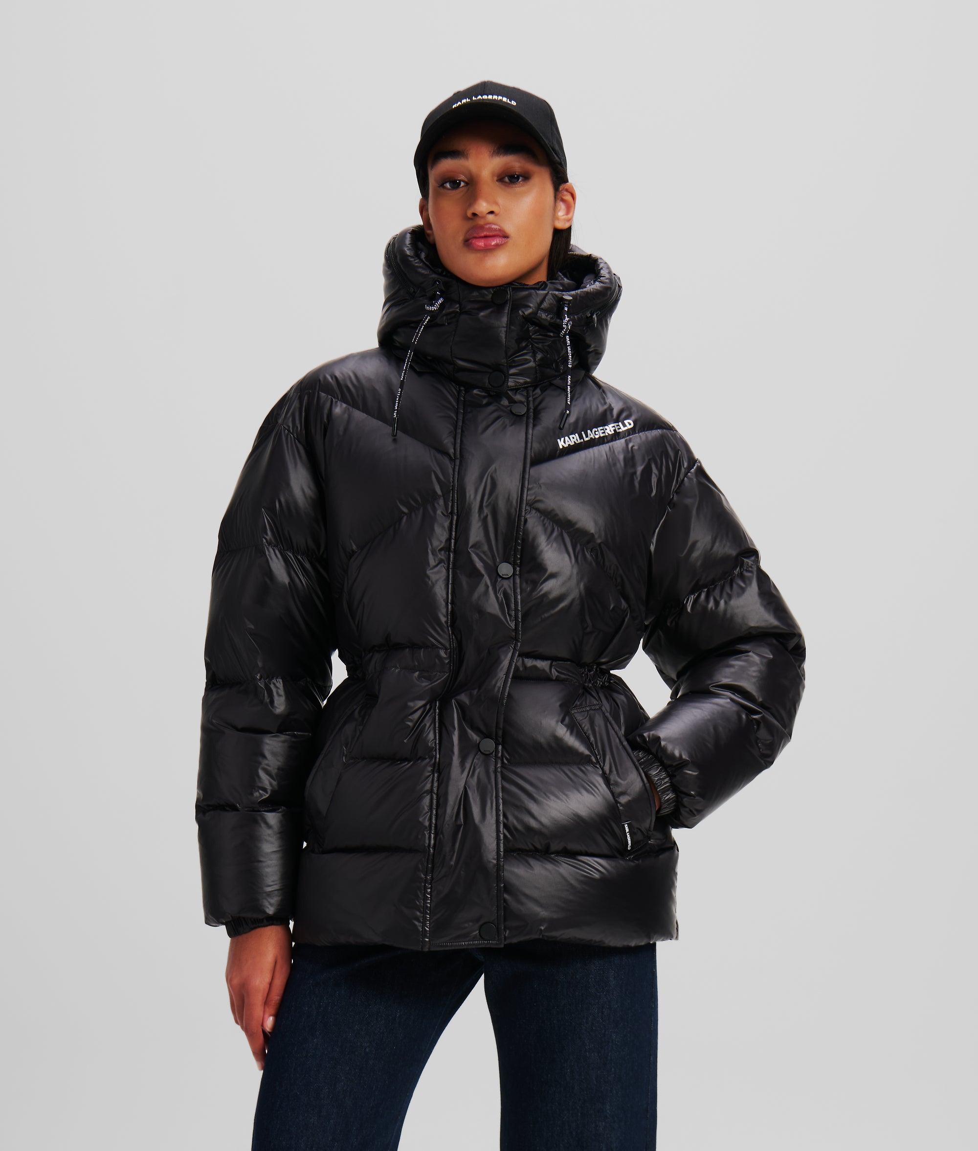 This puffer jacket is a winter outerwear essential. Designed for cold-weather, it features a hidden zip-front closure, detachable hood, and adjustable inner bungee cord for cinching the waist.