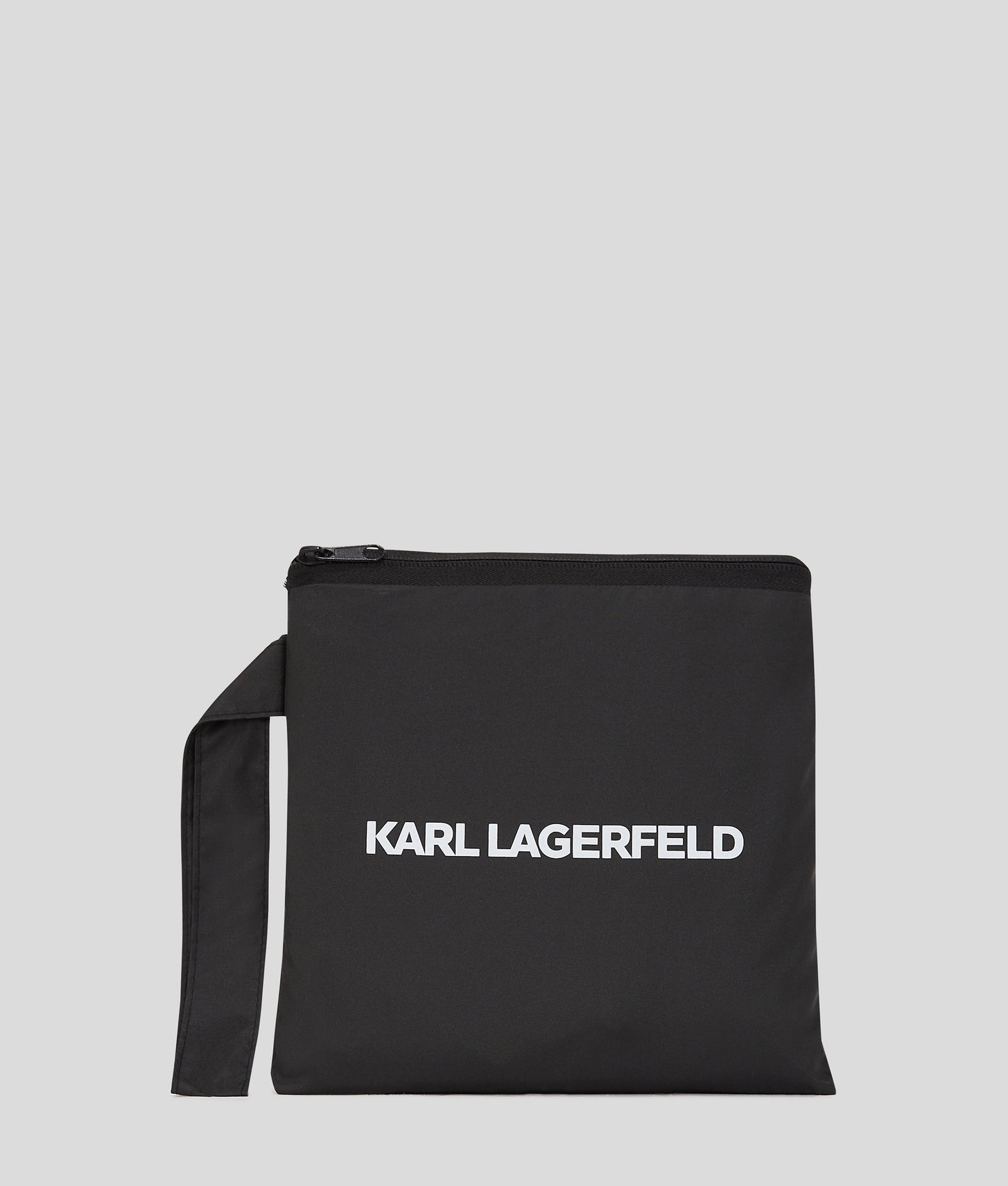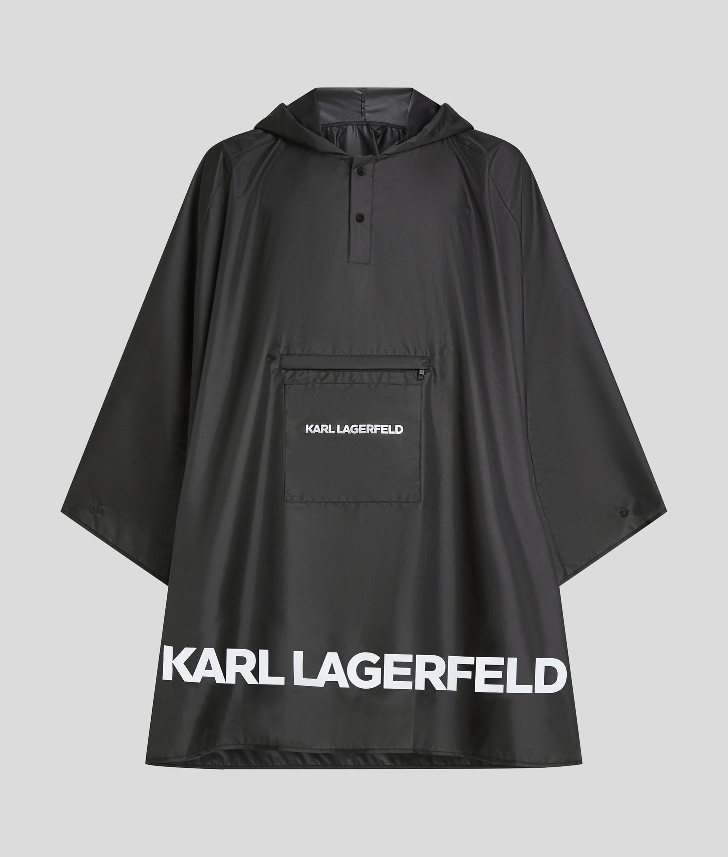 A long, roomy silhouette crafted from lightweight, water-resistant fabric makes this poncho an essential for unpredictable weather. The press button placket leads to a cozy hood, while the front pocket cleverly transforms into a compact case. Bold KARL LAGERFELD branding adds a statement touch.