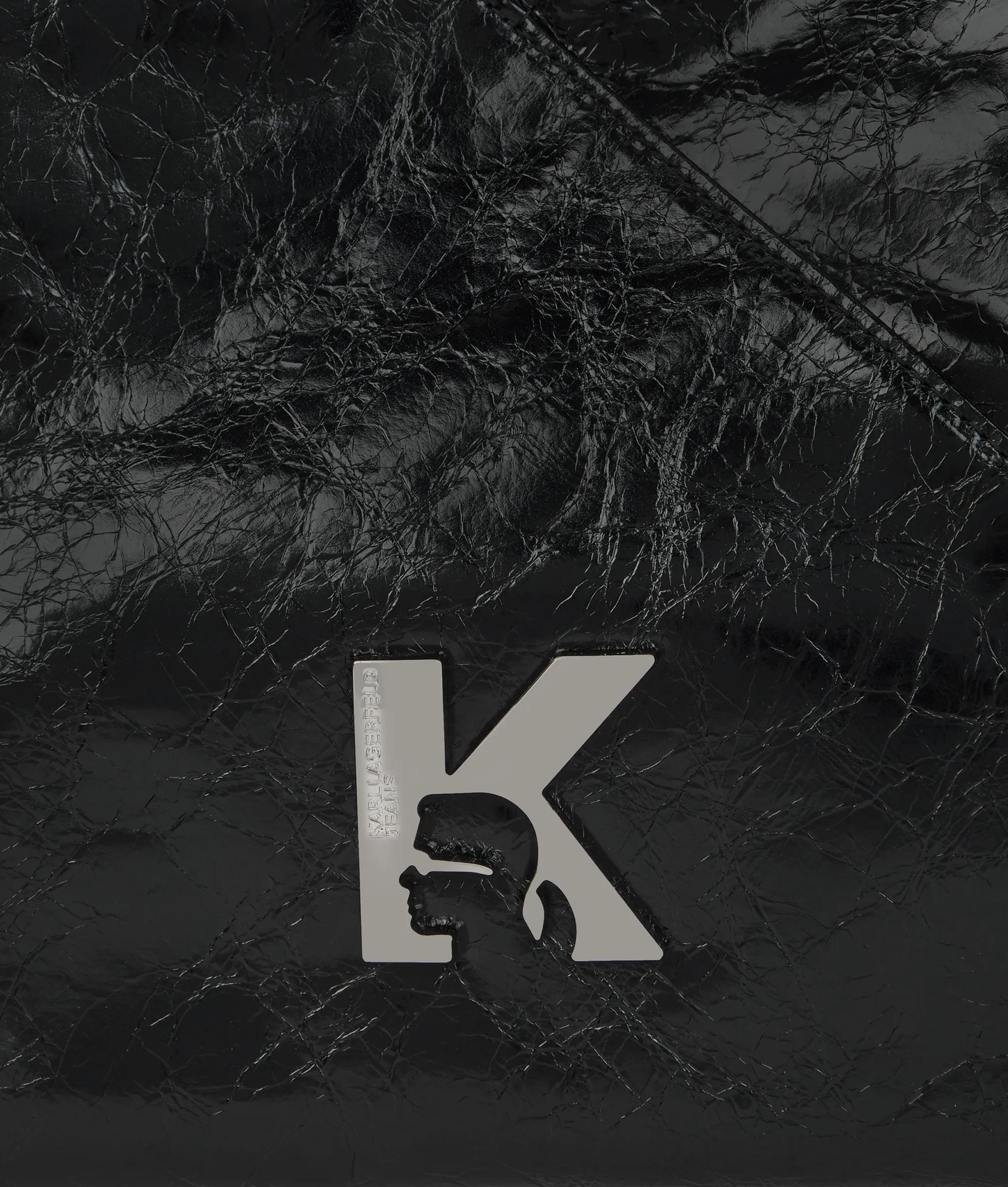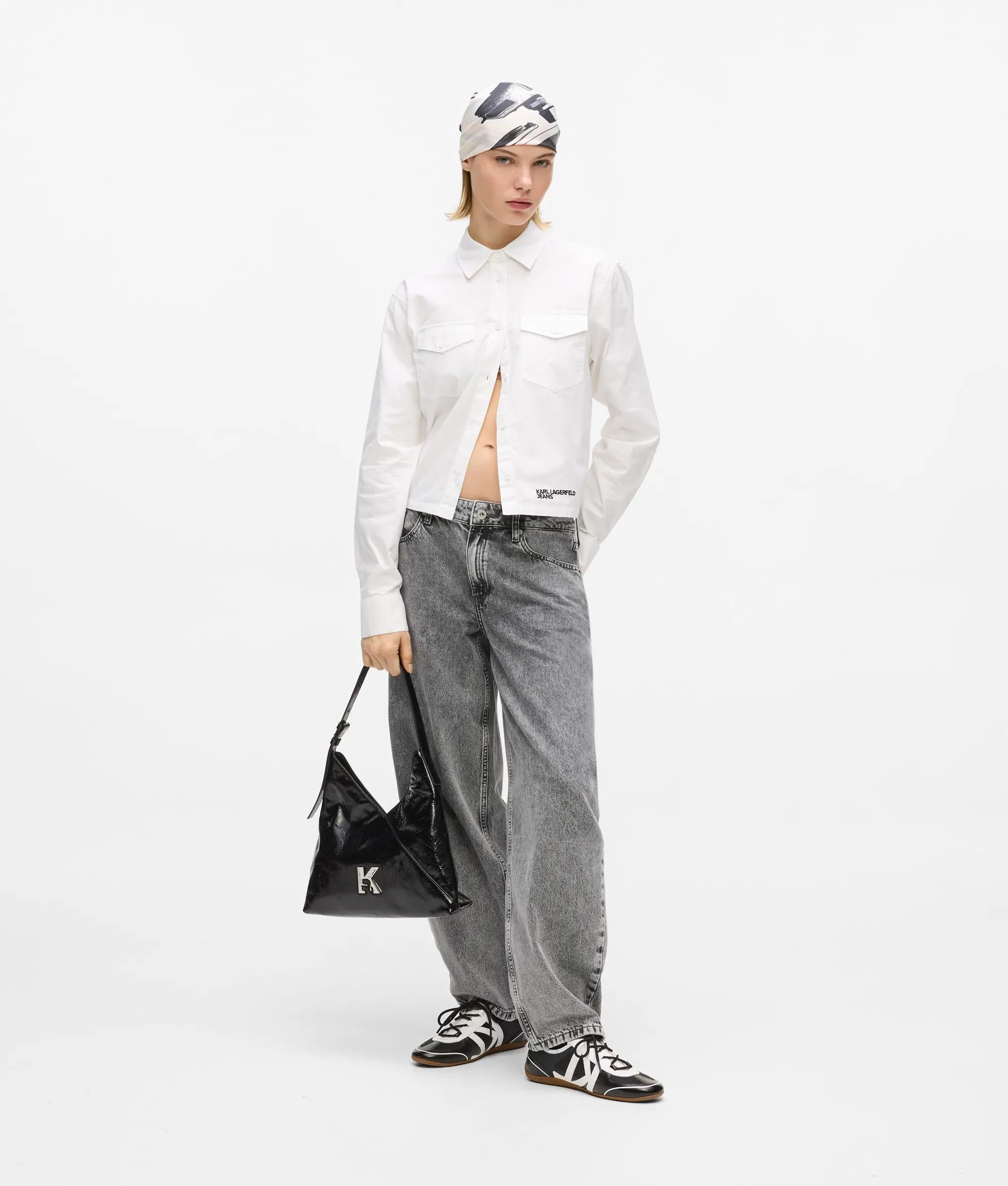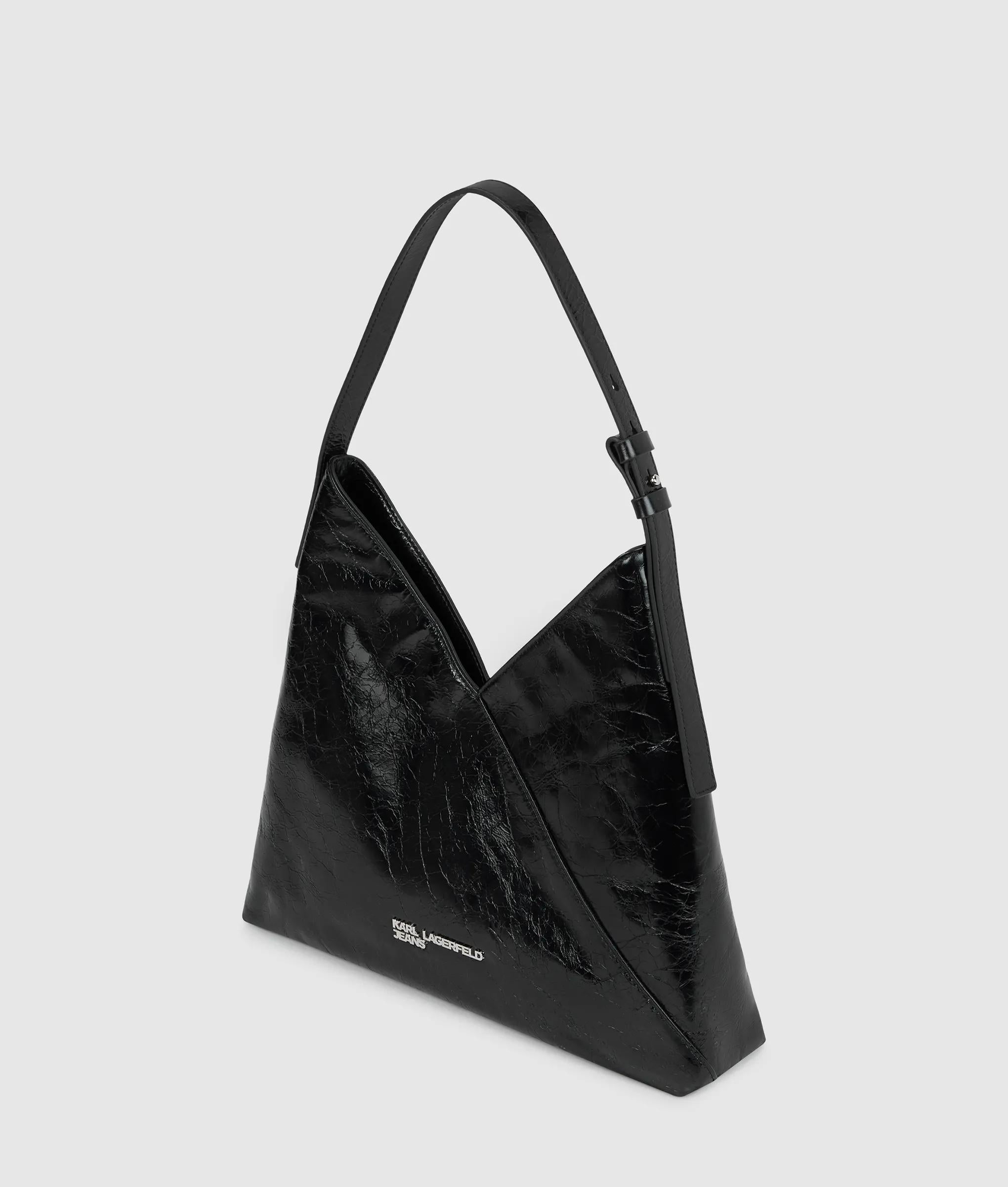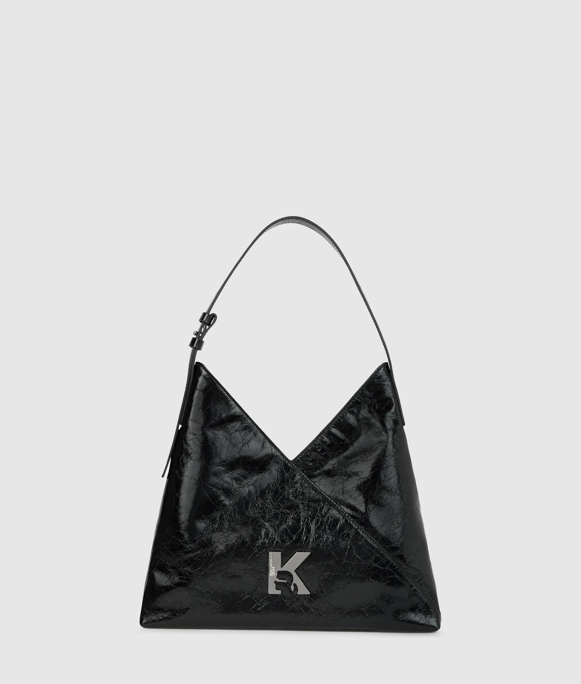 Glossy leather meets bold geometry in this innovative tote bag, featuring a button closure and adjustable shoulder strap for effortless wear with a confident edge.